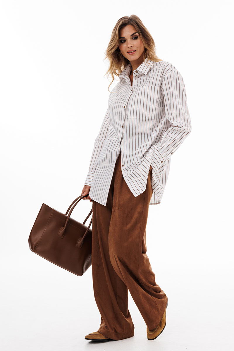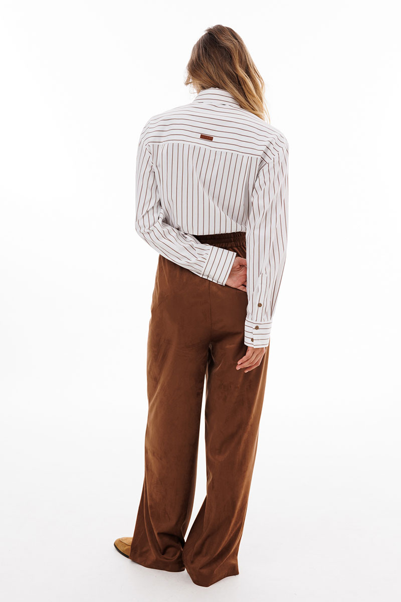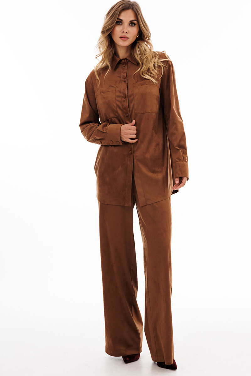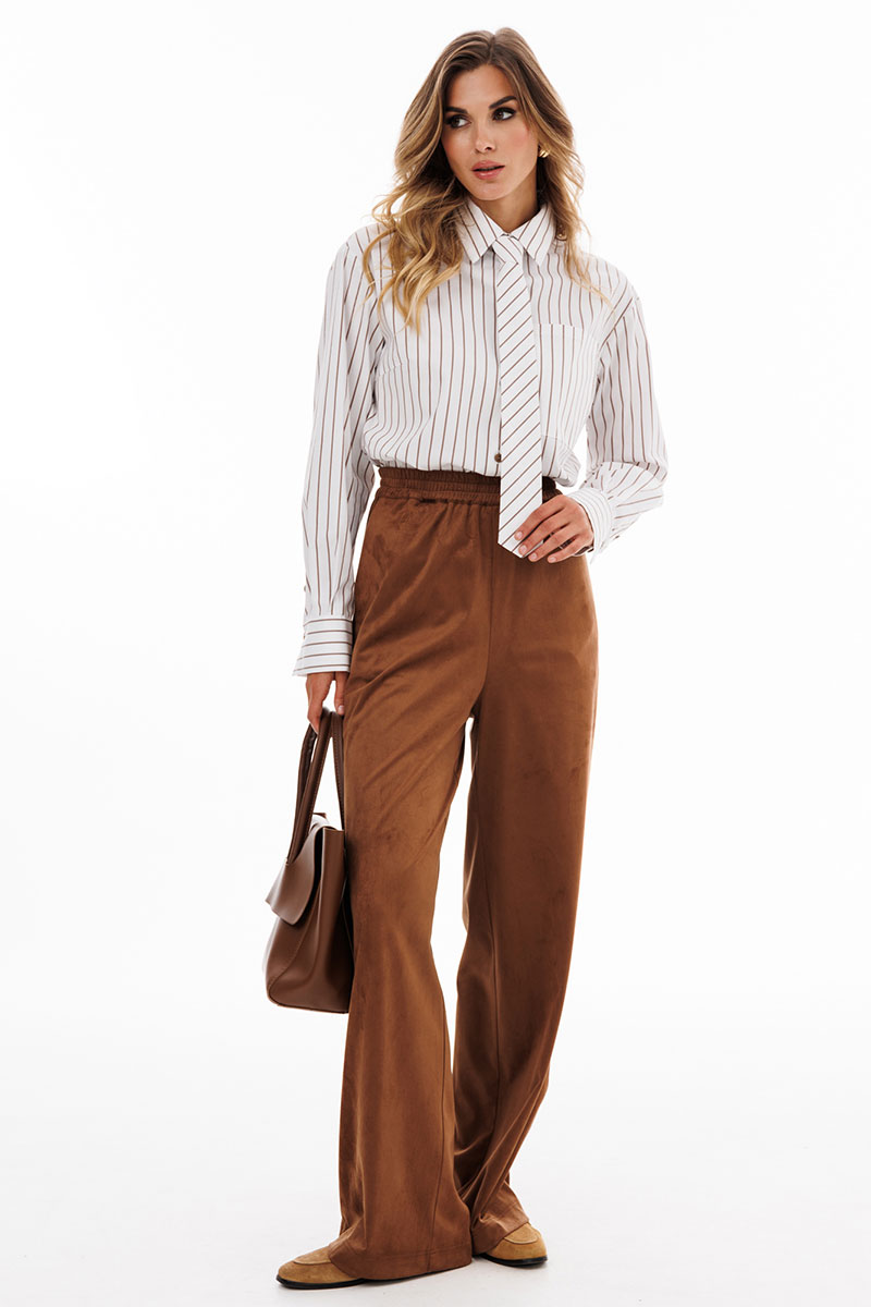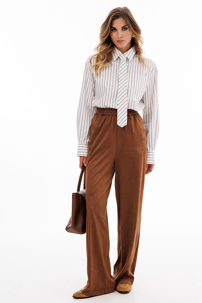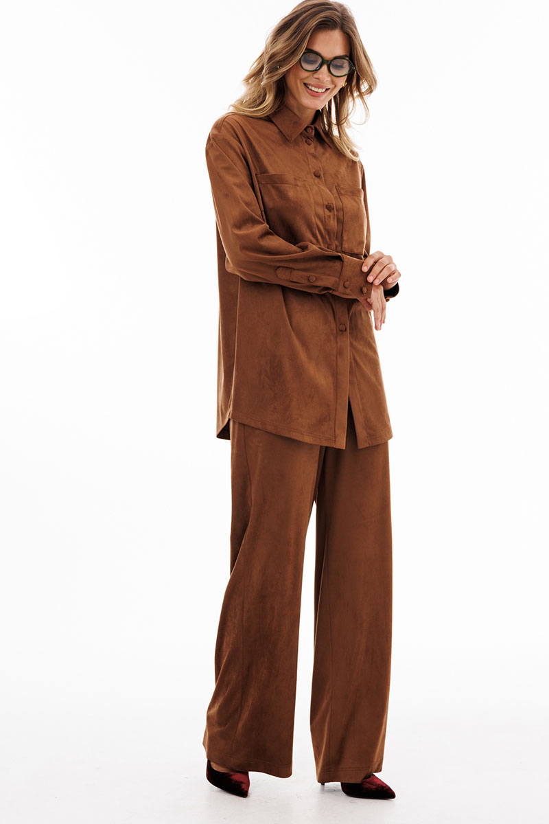 Брюки выполнены из тонкой искусственной замши. Брюки прямого покроя длиной в пол, на притачном поясе с эластичной тесьмой. Спереди боковые карманы с наклонным входом.