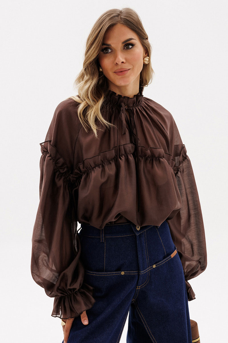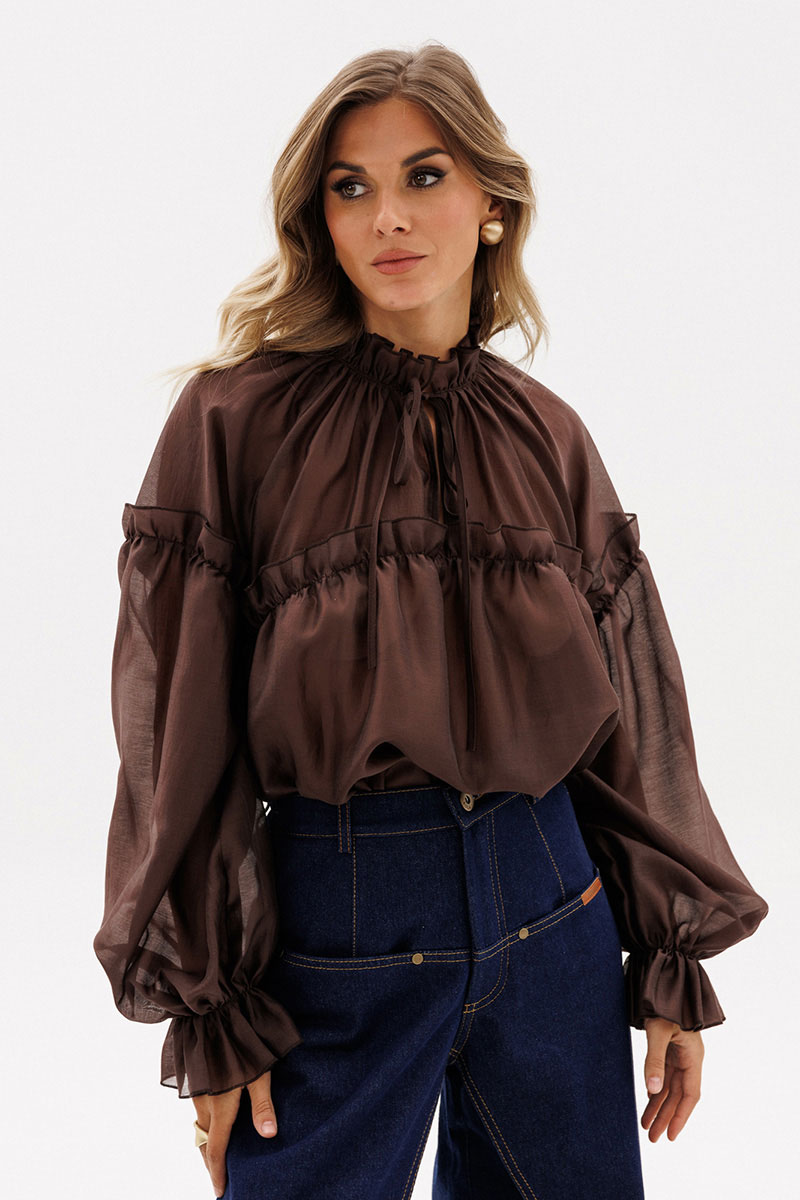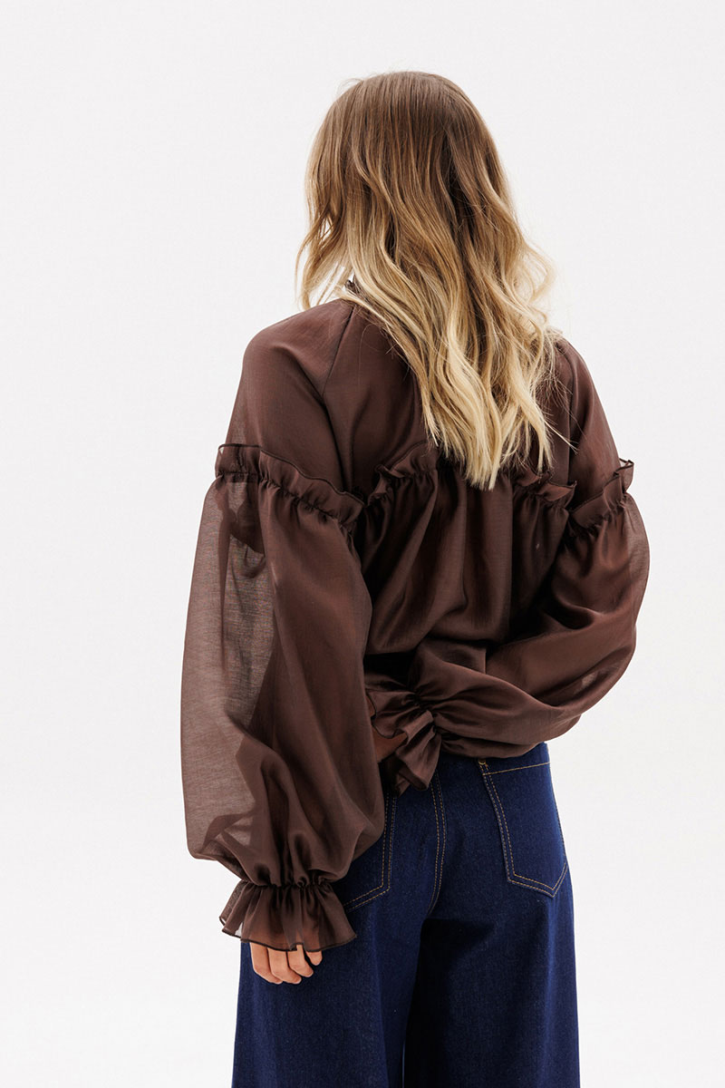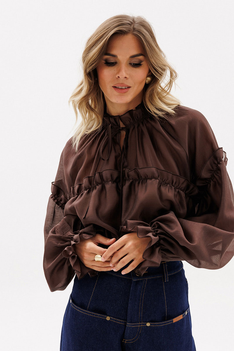 Блузка выполнена из плательно-блузочной ткани. Блузка прямого силуэта, длиной до линии бедер. Спереди и по спинке средний шов и кокетки со сборками от них. Рукав реглан, расширенный к низу. Блузка декоррирована оборками из основной ткани по линиям кокеток переда и спинки, и по верхнему шву рукава.