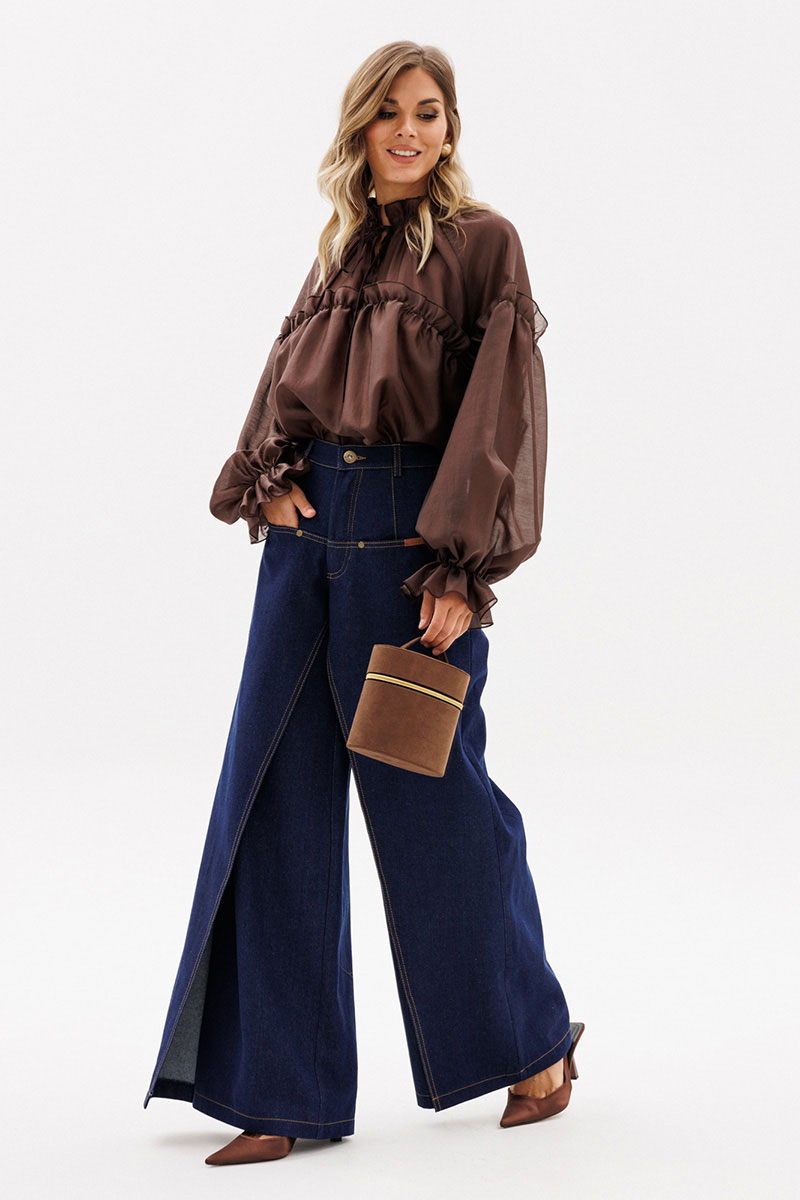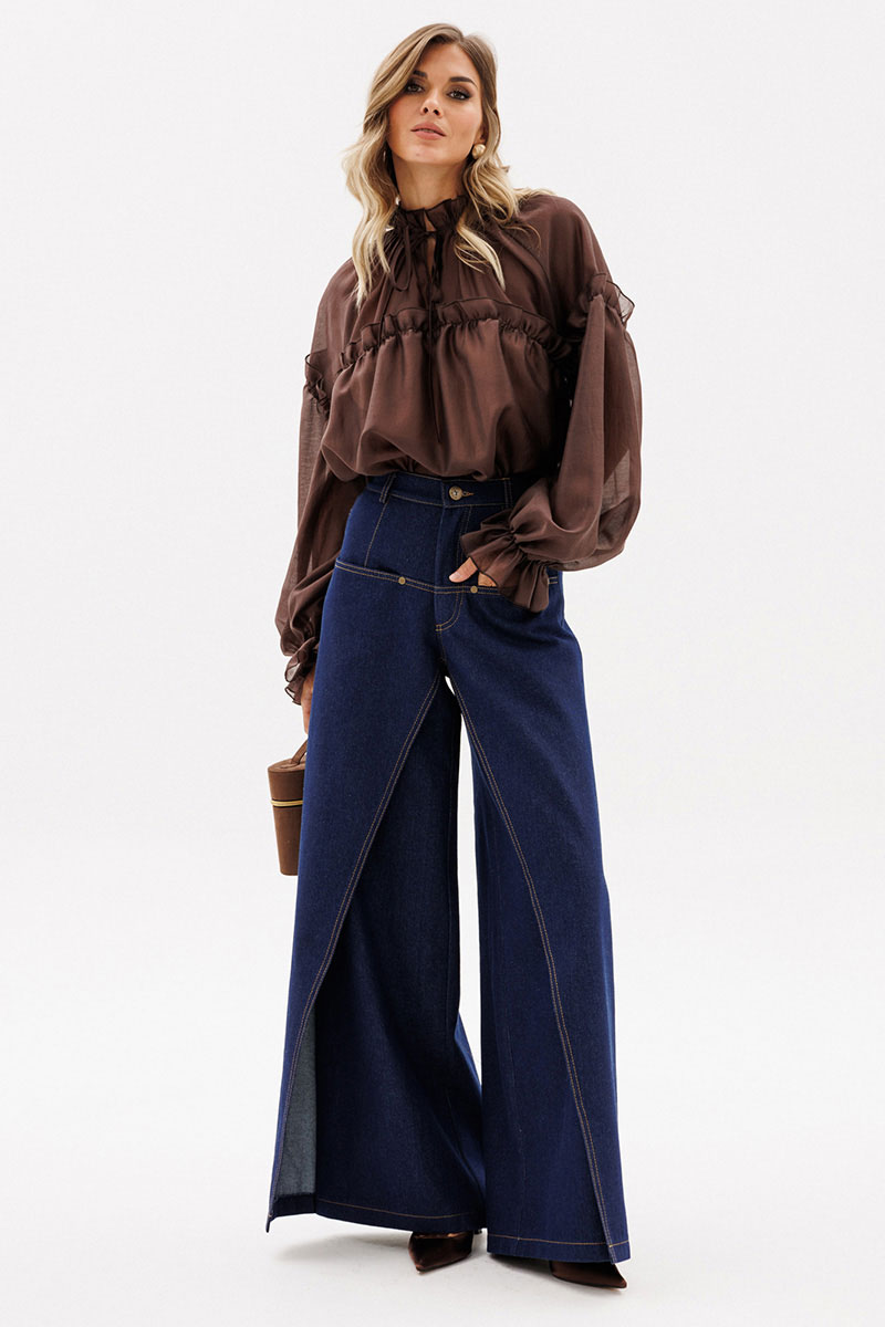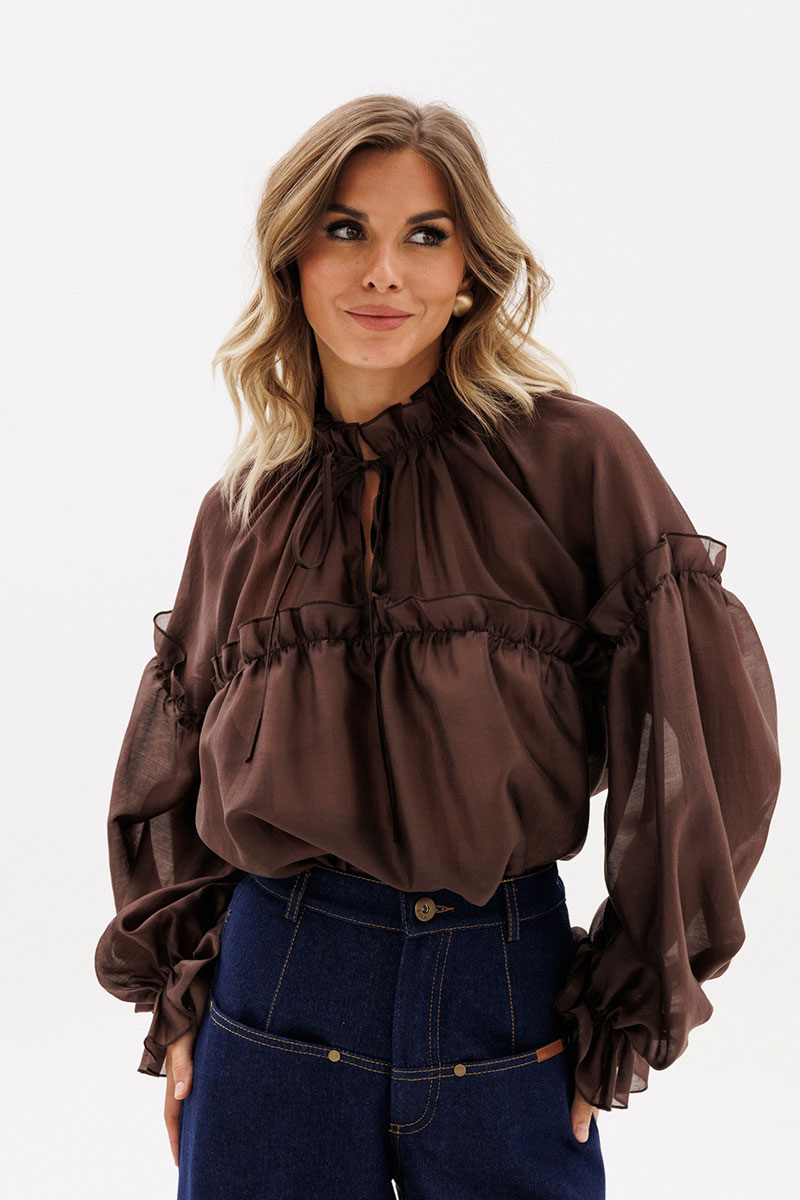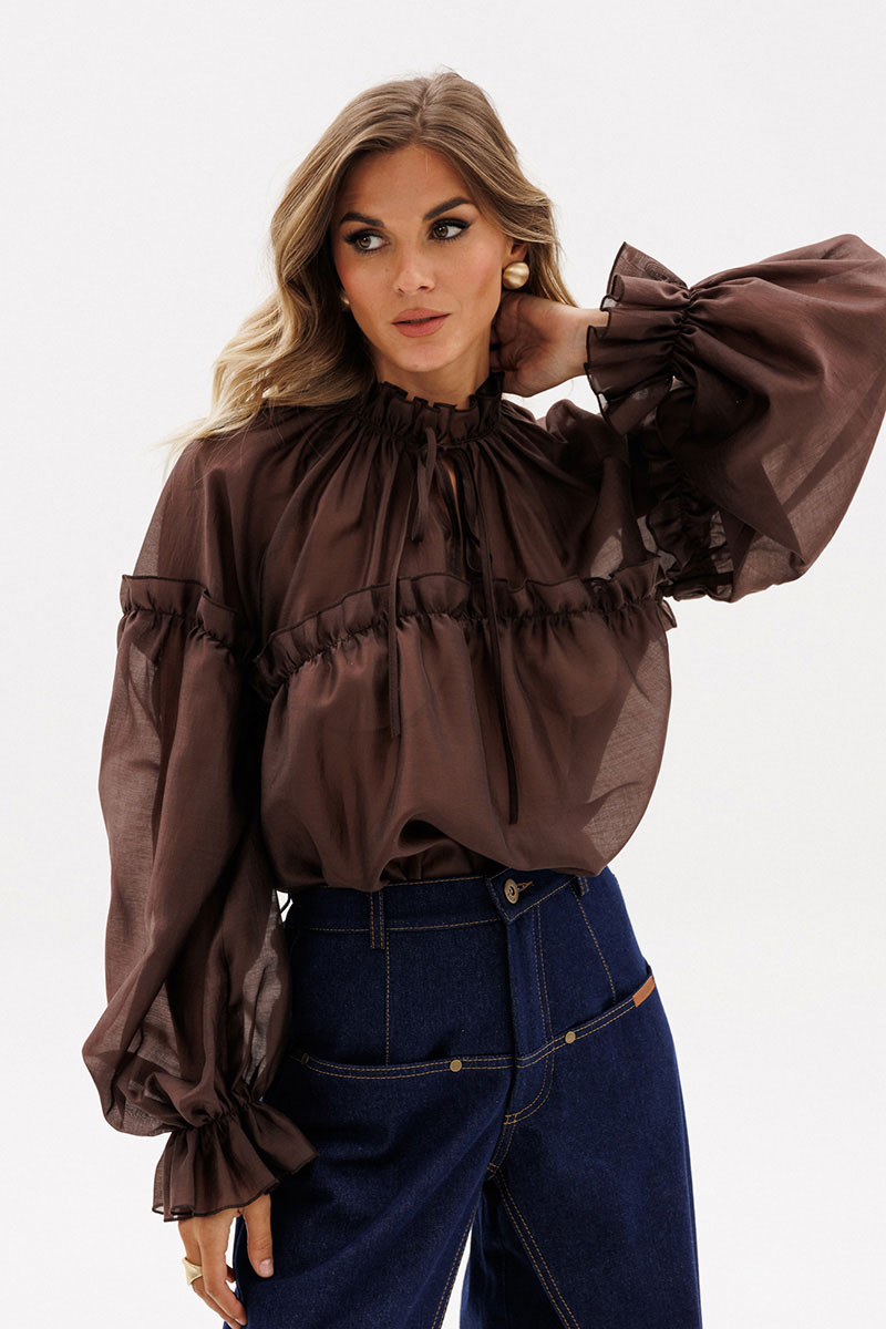 Блузка выполнена из плательно-блузочной ткани. Блузка прямого силуэта, длиной до линии бедер. Спереди и по спинке средний шов и кокетки со сборками от них. Рукав реглан, расширенный к низу. Блузка декоррирована оборками из основной ткани по линиям кокеток переда и спинки, и по верхнему шву рукава.