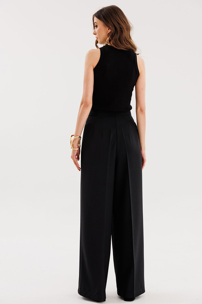 Джемпер выполнен из трикотажного полотна в рубчик. Джемпер приталенного силуэта, длиной выше линии бедер. Перед и спинка цельные. Горловина округлой формы. Плечевой шов заужен. Горловина и пройма обработаны бейками из основной ткани.