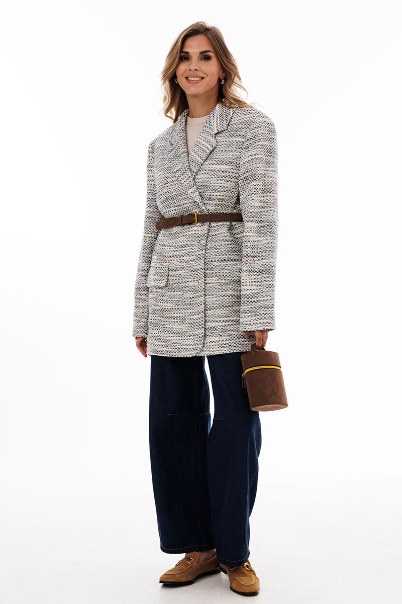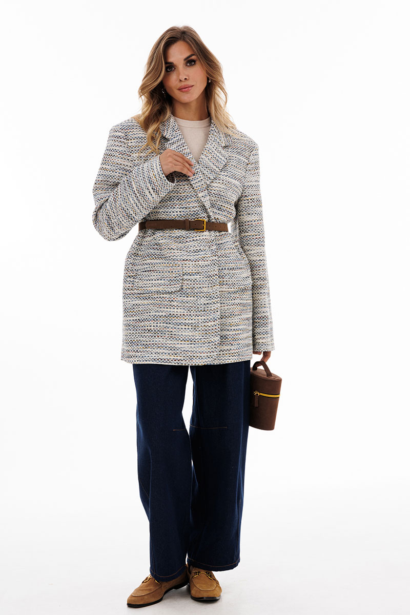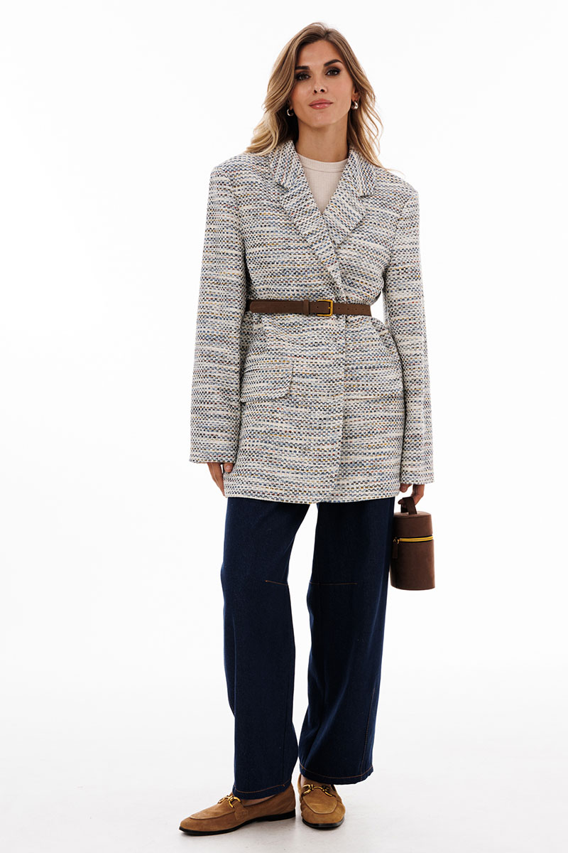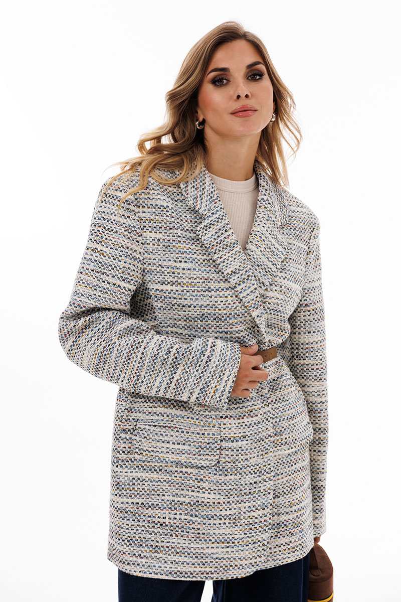 Жакет выполнен из меланжевой костюмной ткани. Жакет прямого силуэта, кроя oversize, длиной ниже линии бедра. Спереди карманы с клапанами, бортовая застежка на две пуговицы. Жакет по