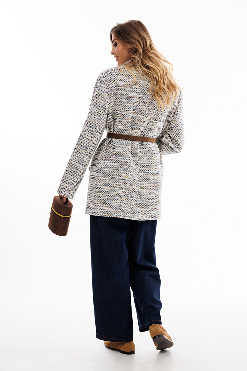 спинке со средним швом со шлицей. Воротник пиджачного типа. Плечевой шов удлинен. Рукав втачного покроя, двухшовный. Жакет на притачной по низу подкладке.