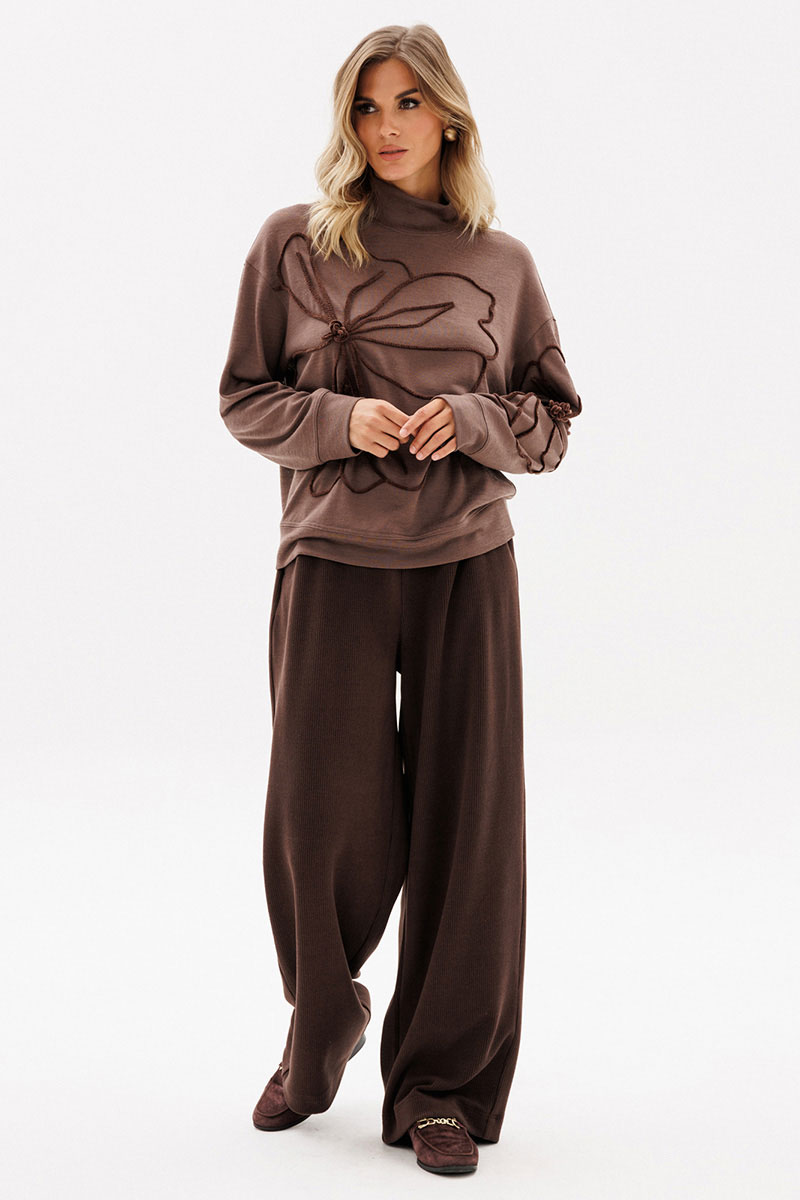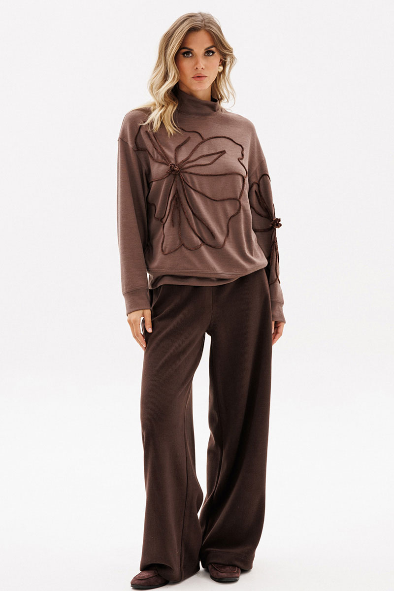 Брюки выполнены из вельвета. Брюки прямого покроя длиной в пол, на притачном поясе с эластичной тесьмой. Спереди боковые карманы с наклонным входом.