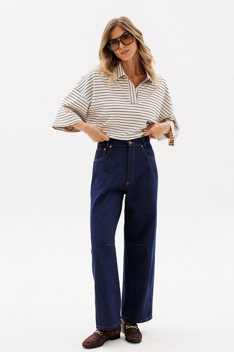 Джемпер выполнен из трикотажного полотна. Джемпер прямого силуэта, длиной до линии бедер. Перед и спинка цельные.Воротник стояче-отложной. Плечевой шов удлинен. Рукав рубашечного покроя, одношовный, длиной до линии локтя.