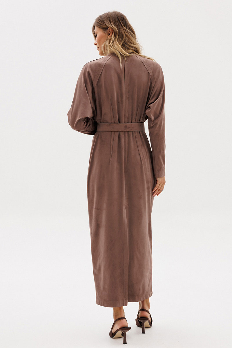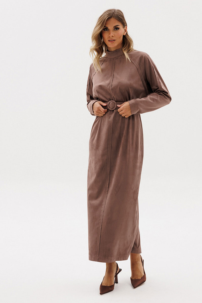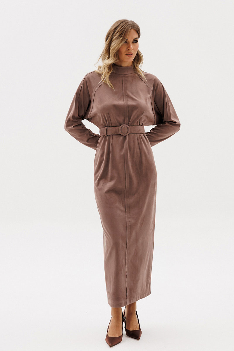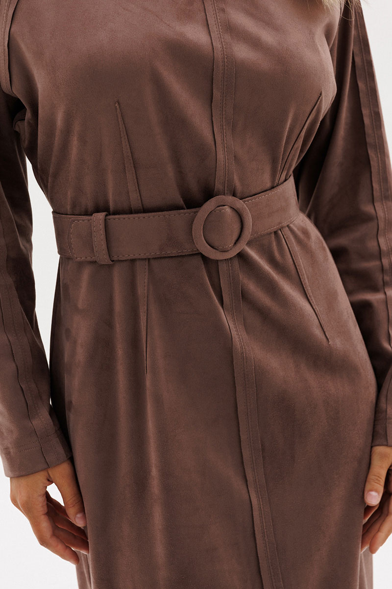 Платье выполнено из тонкой искуственной замши. Платье полуприлегающего силуэта, длиной миди. Платье отрезное по линии талии. Спереди и на спинке талиевые вытачки и средний шов. Застежка на потайную молнию в среднем шве спинки. Воротник-стойка. Рукав покроя реглан. Средний шов переда, талиевые вытачки, верхний шов рукава и линии реглана обработаны "на лицо". В комплект входит съемный ремень из основной ткани с обтяжной пряжкой.