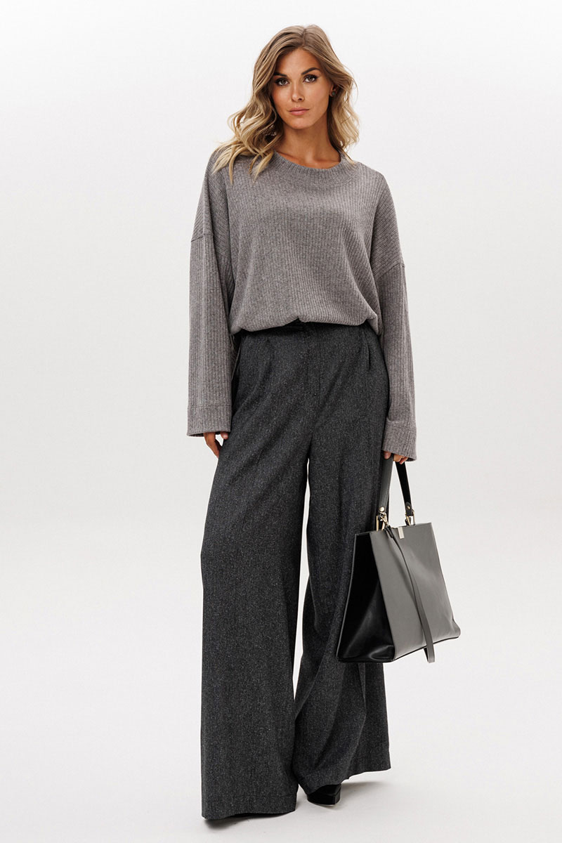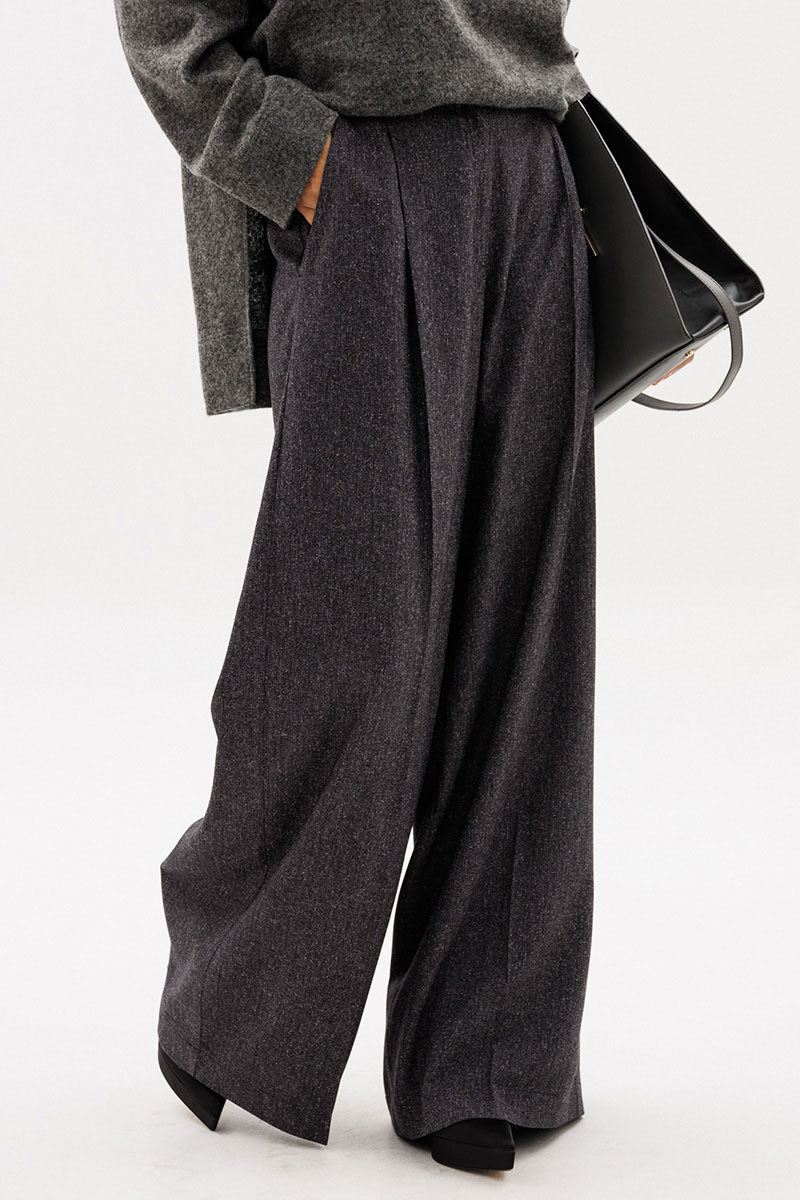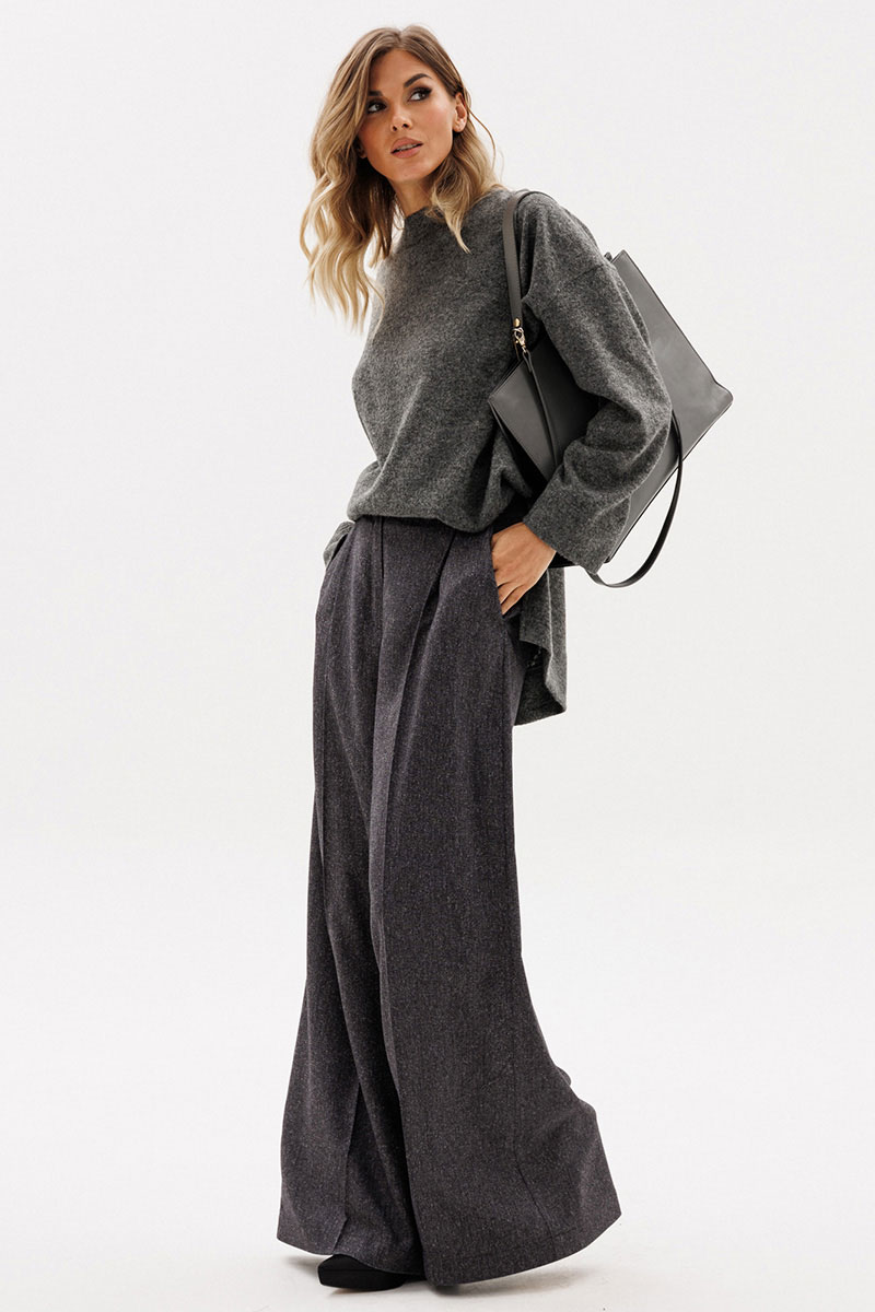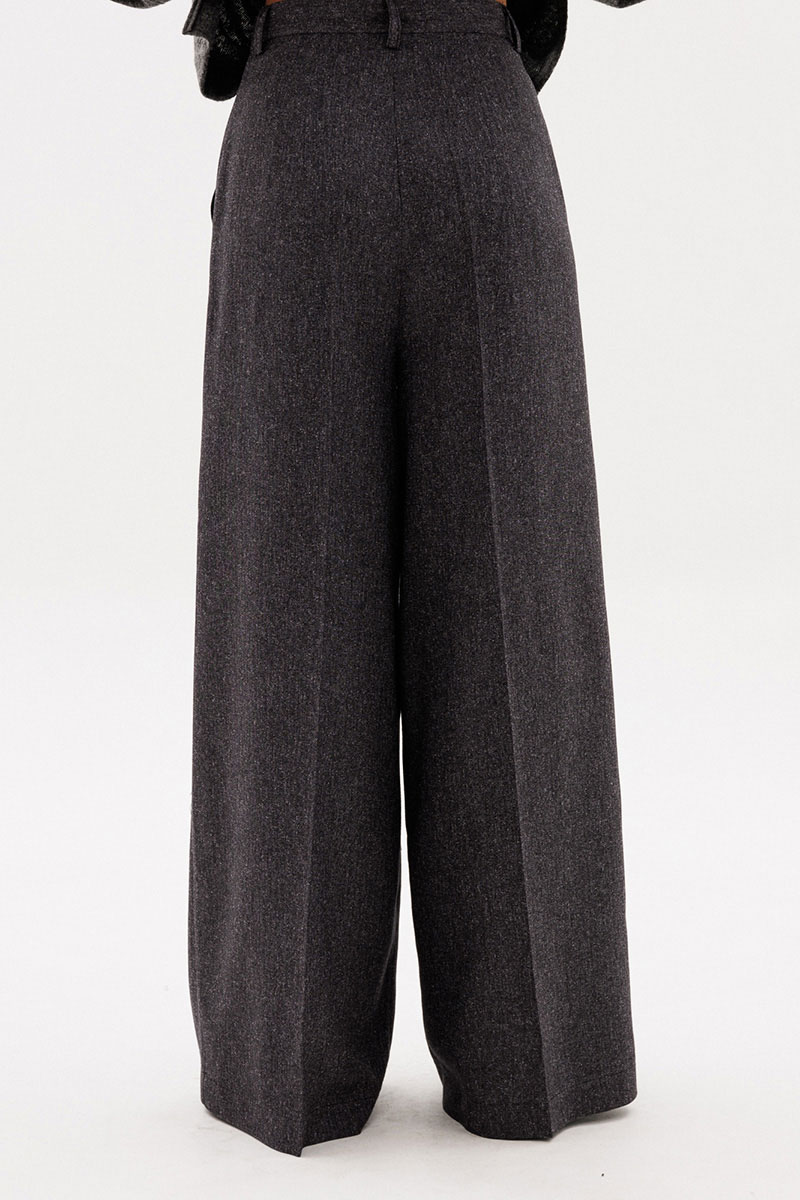 Брюки-палаццо выполнены из костюмной ткани меланж. Брюки на притачном поясе, длиной в пол, расширенные к низу. Спереди складки и боковые карманы с наклонным входом. Застежка спереди на молнию с гульфиком и пуговицу. На задних частях обработаны талиевые вытачки.