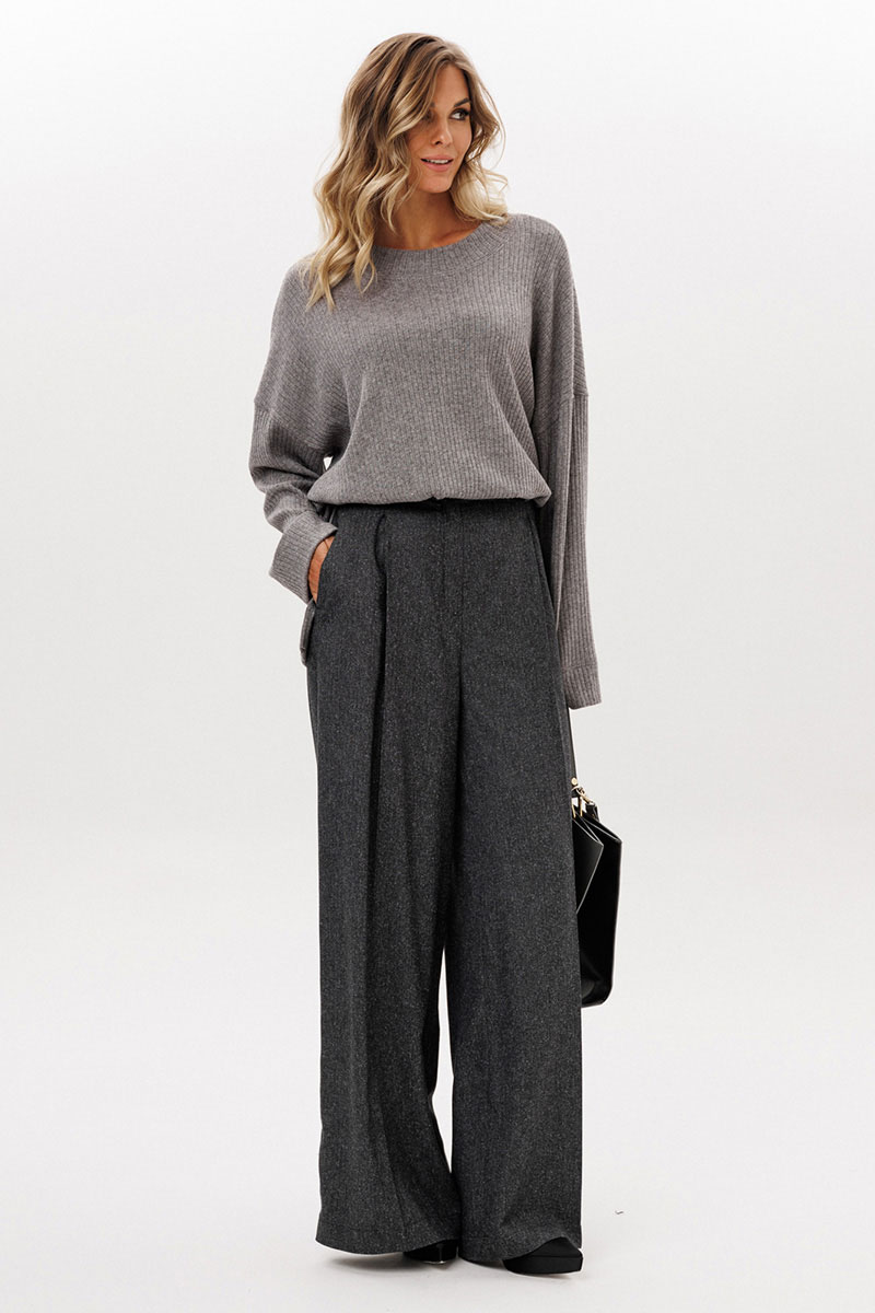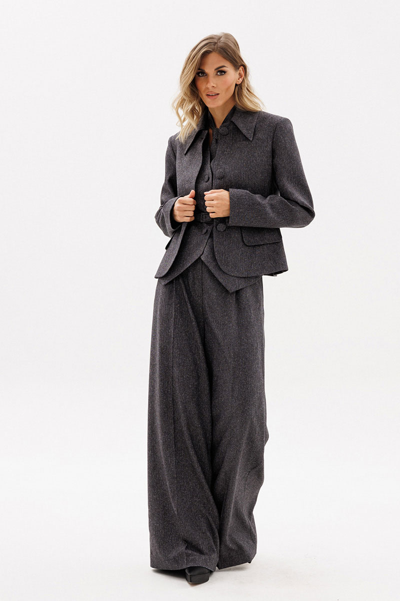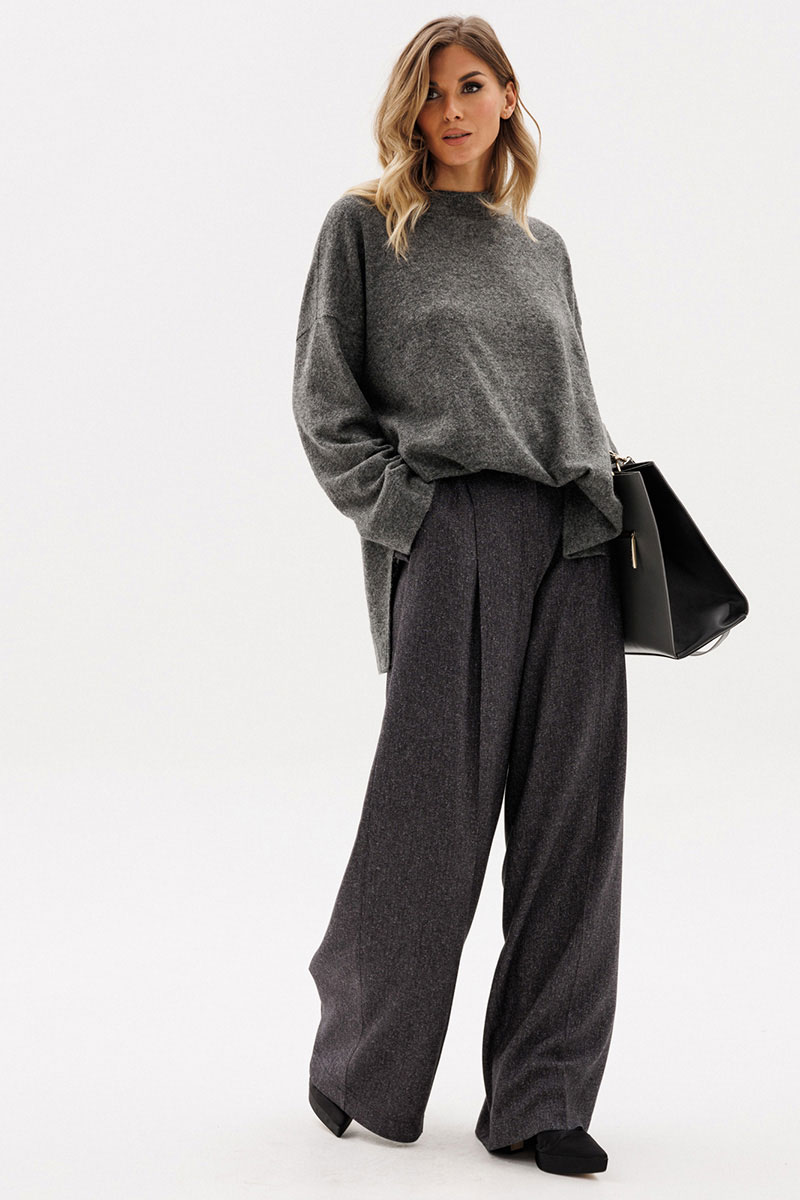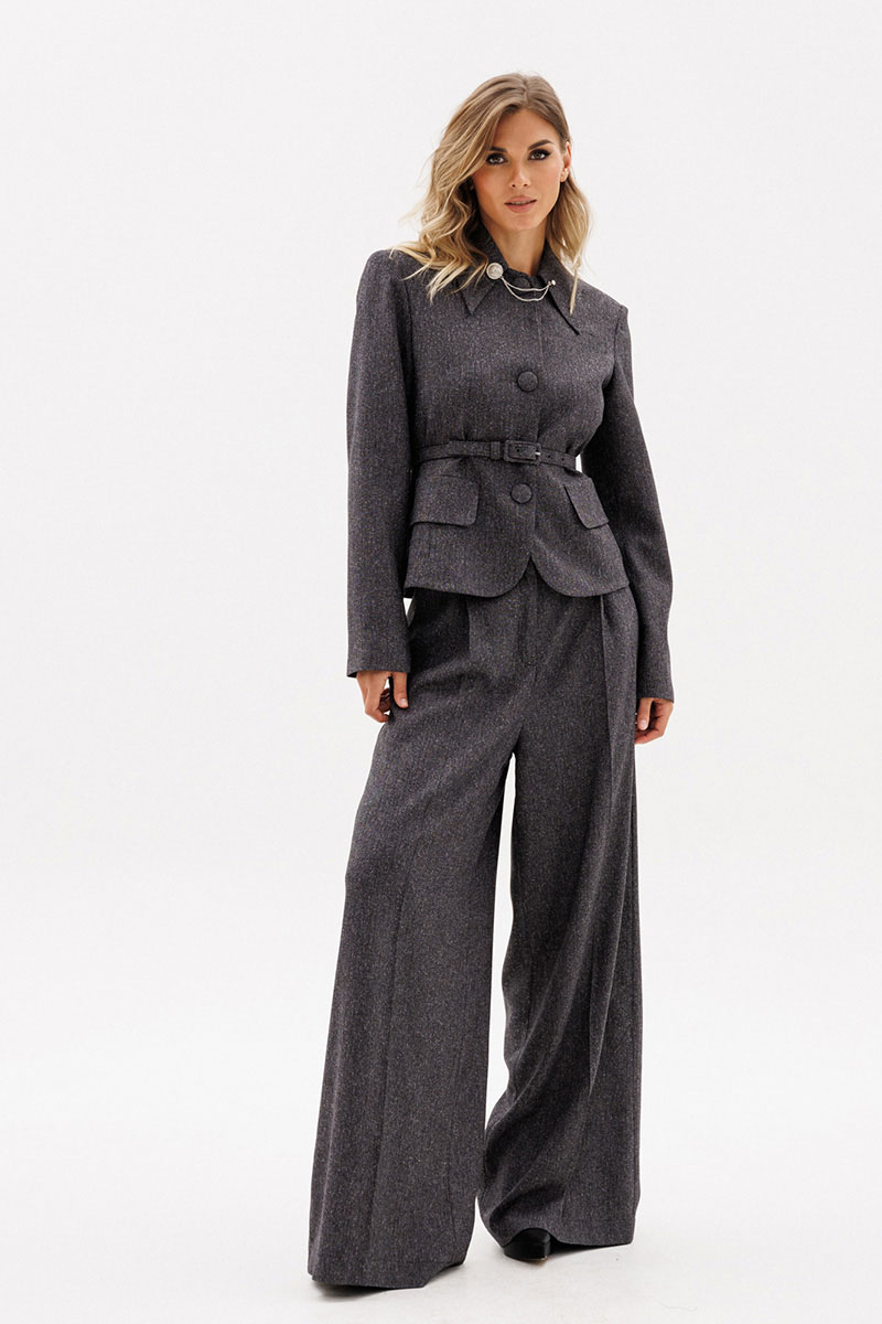 Брюки-палаццо выполнены из костюмной ткани меланж. Брюки на притачном поясе, длиной в пол, расширенные к низу. Спереди складки и боковые карманы с наклонным входом. Застежка спереди на молнию с гульфиком и пуговицу. На задних частях обработаны талиевые вытачки.