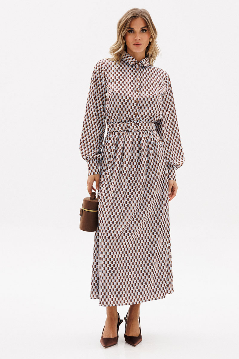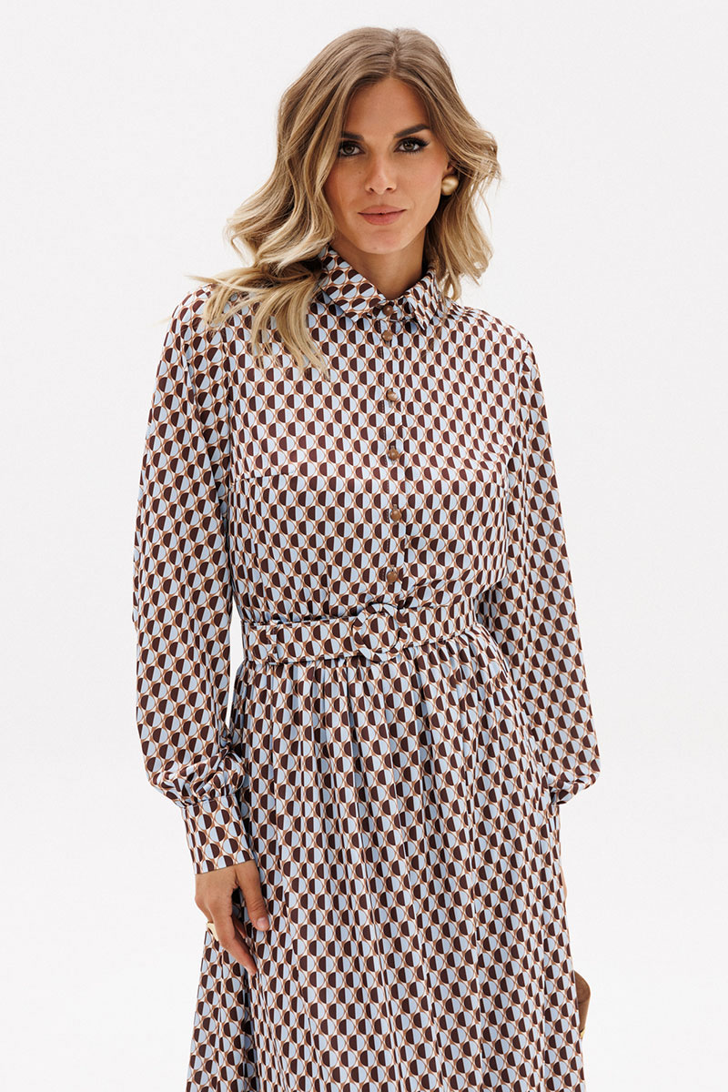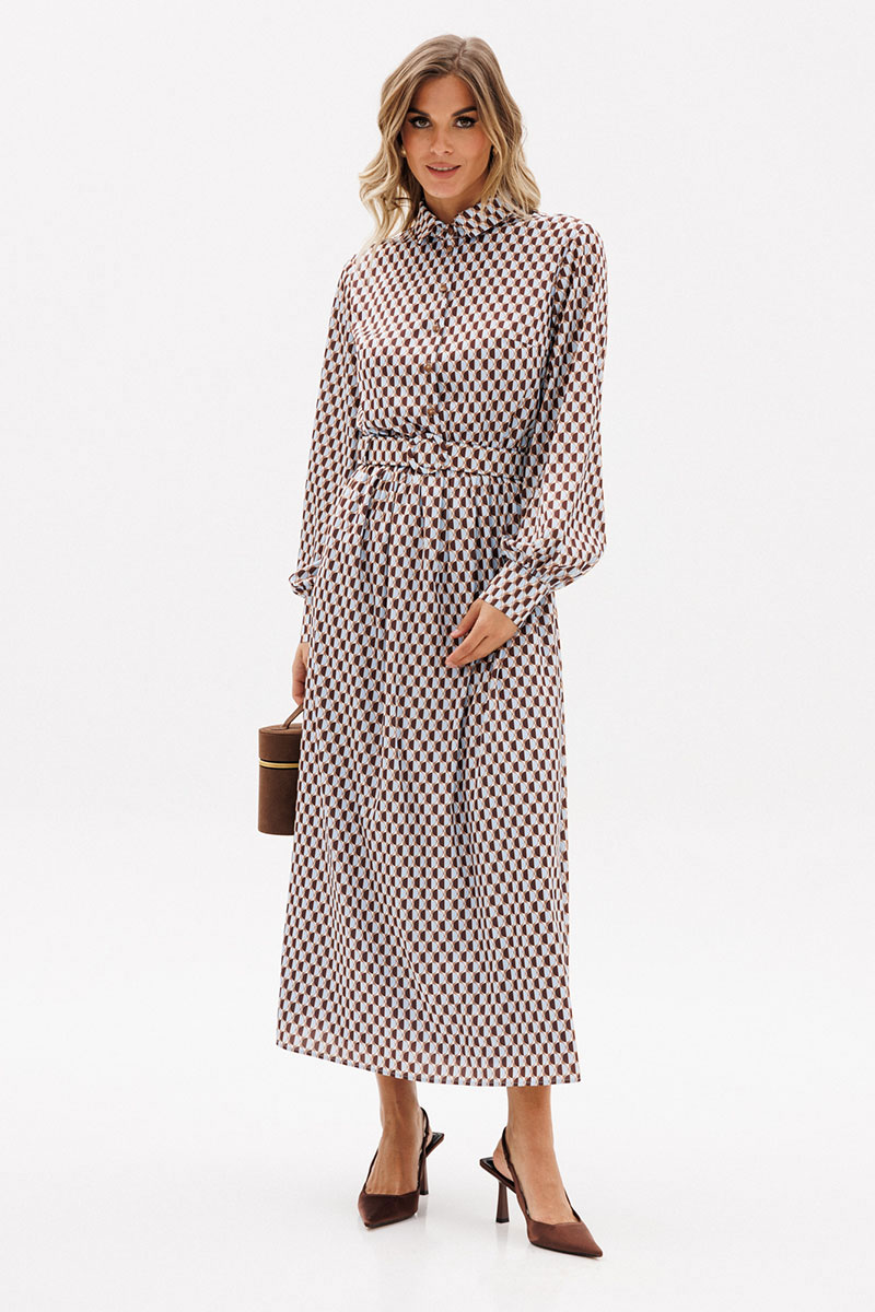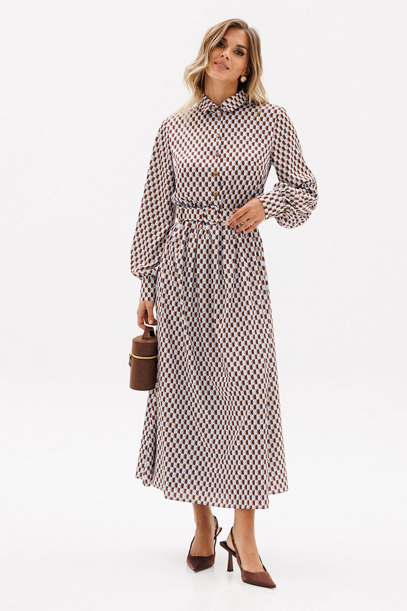 Платье выполнено из тонкого атласа с принтом. Платье отрезное по линии талии. Воротник рубашечного типа. Застежка спереди на пуговицы на планке. Рукав втачной, на манжете. Лиф и юбка платья на подкладке из тонкого однотонного атласа. В комплект входит съемный ремень из основной ткани с обтяжной пряжкой.