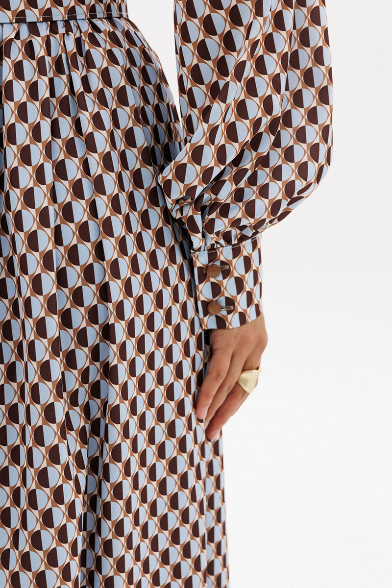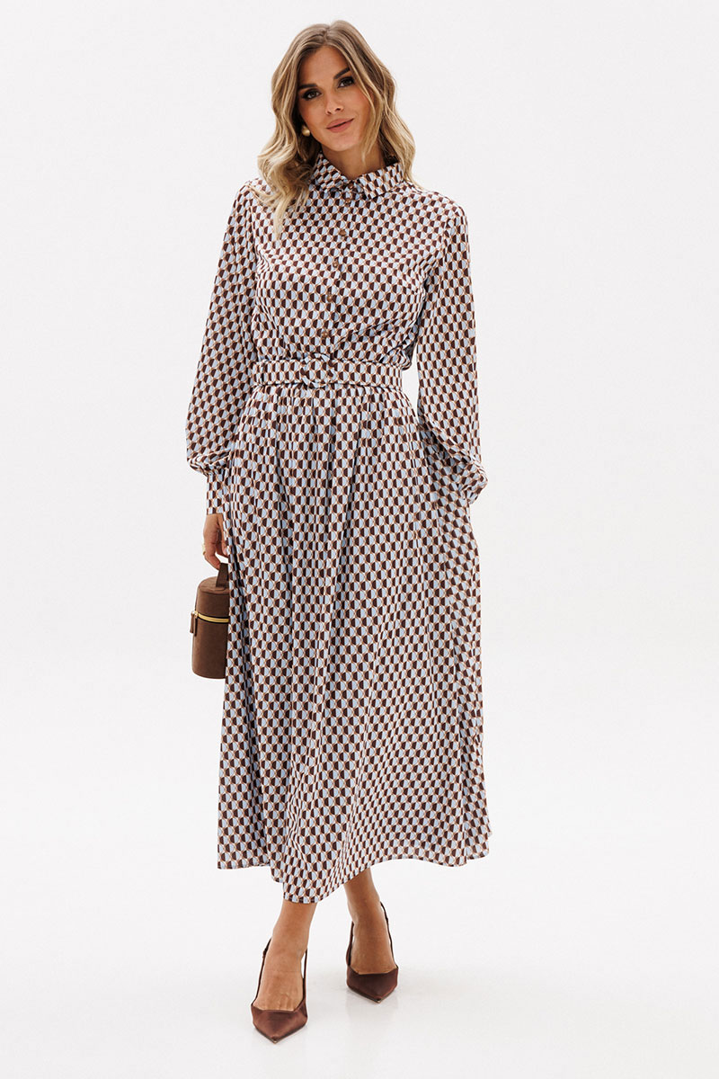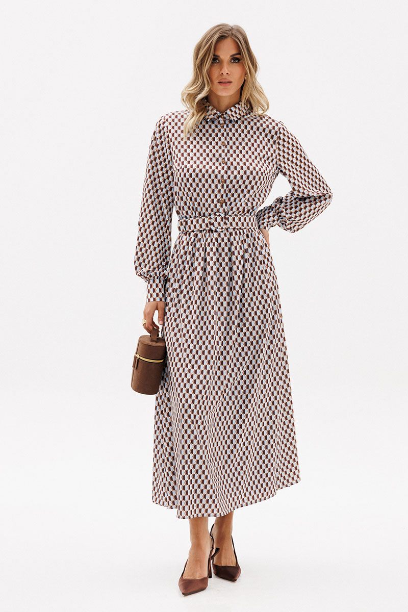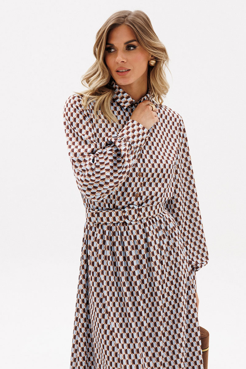 Платье выполнено из тонкого атласа с принтом. Платье отрезное по линии талии. Воротник рубашечного типа. Застежка спереди на пуговицы на планке. Рукав втачной, на манжете. Лиф и юбка платья на подкладке из тонкого однотонного атласа. В комплект входит съемный ремень из основной ткани с обтяжной пряжкой.