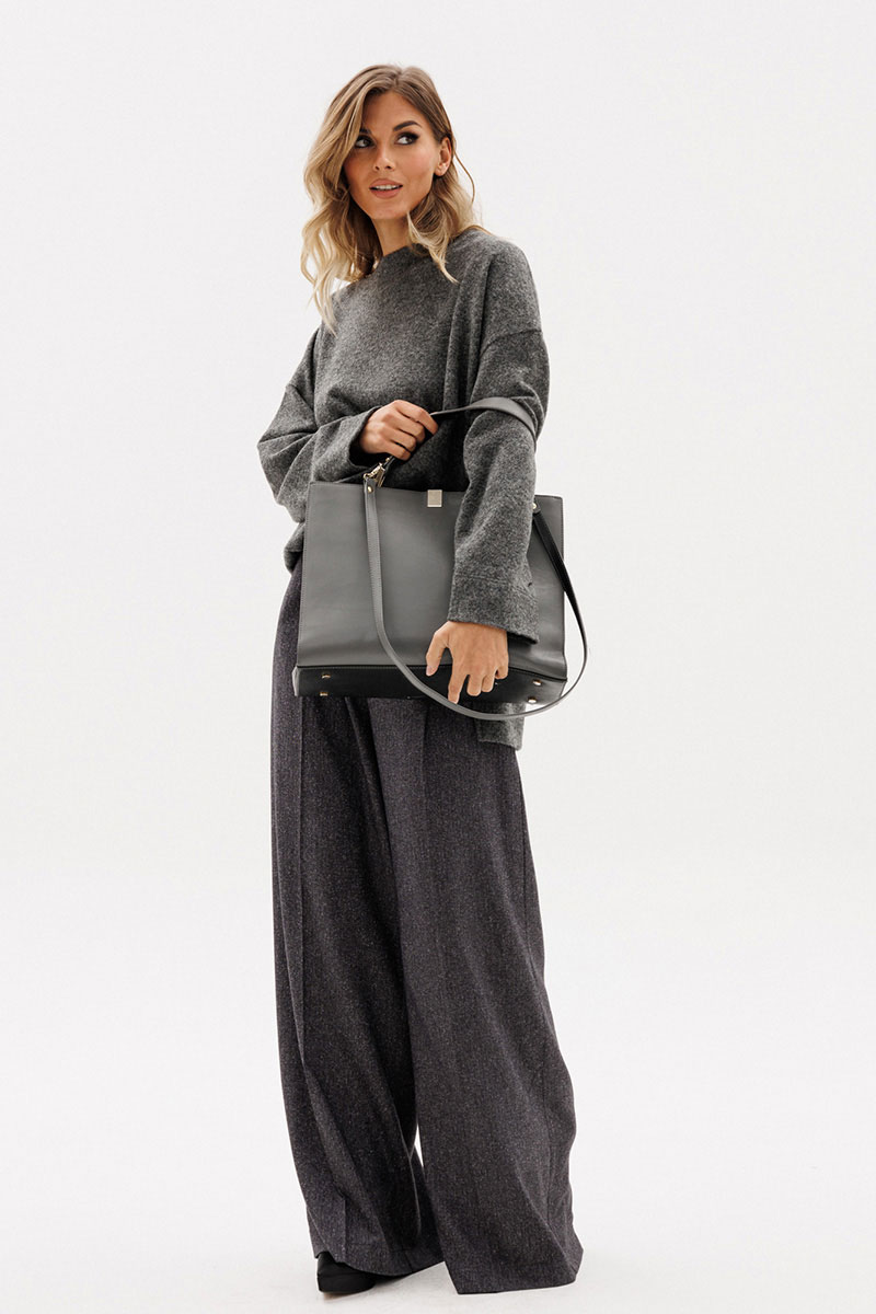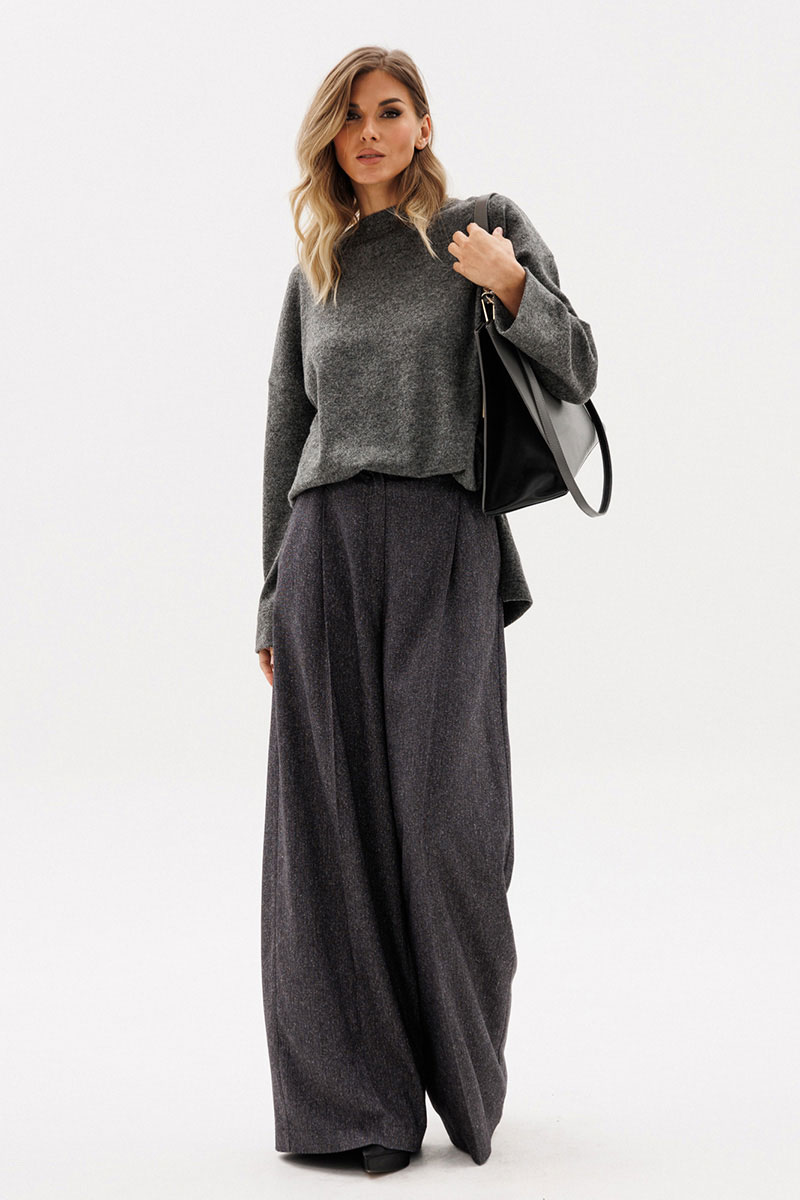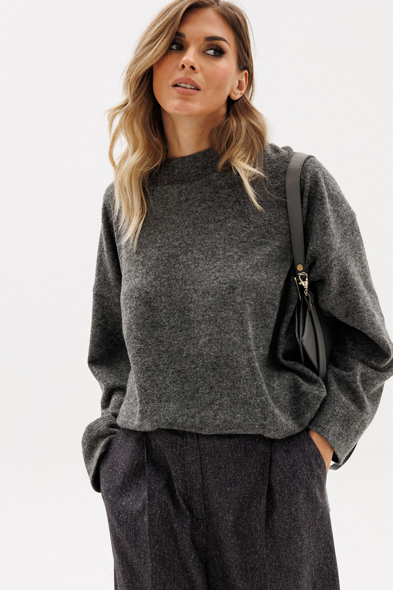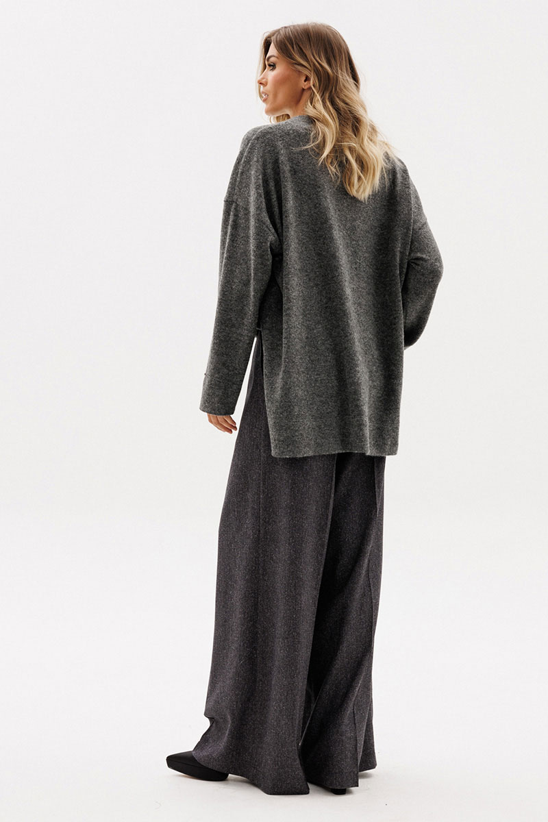 Джемпер выполнен из трикотажного полотна. Джемпер прямого силуэта, длиной ниже линии бедер. Перед и спинка цельные. Горловина округлой формы, обработана широкой бейкой. Плечевой шов удлинен. Рукав рубашечного покроя, одношовный. В боковых швах разрезы.