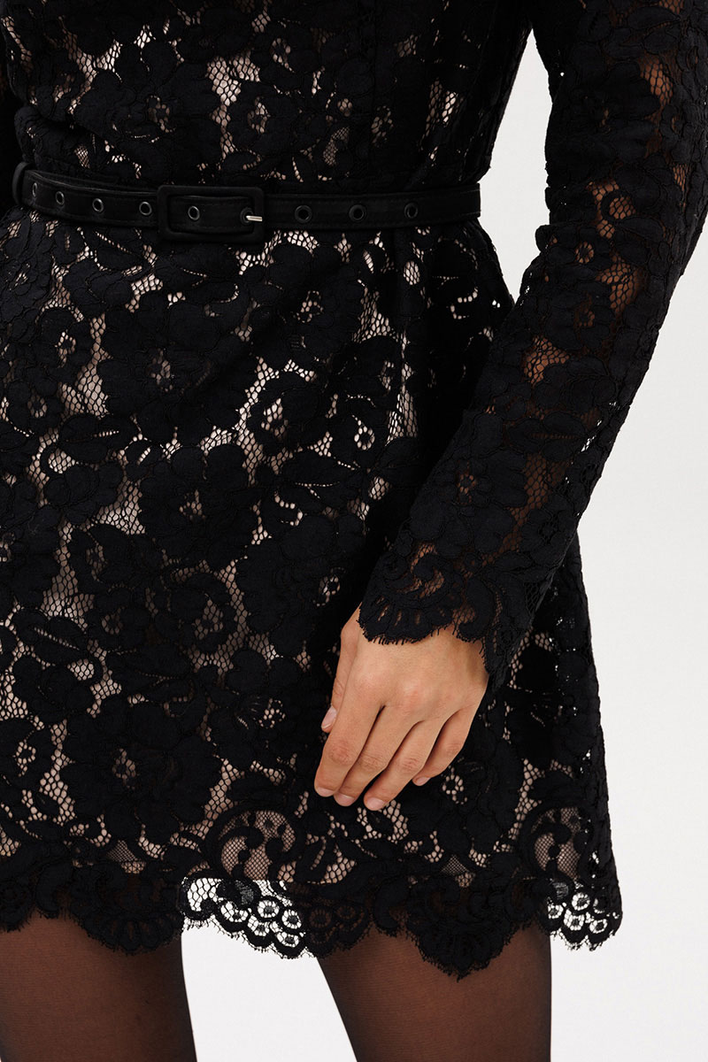 Платье выполнено из гипюра. Платье Х-образного силуэта длиной выше линии колена. Застежка на потайную молнию сзади в среднем шве спинки. Воротник-стойка. Рукав втачной, одношовный. По низу рукава фестоны. Юбка расширена к низу Платье на отлетной по низу подкладке телесного цвета. В комплект входит съемный ремень из основной ткани на сонове из эко-кожи с обтяжной пряжкой и блочками. Платье с плечевой накладкой.