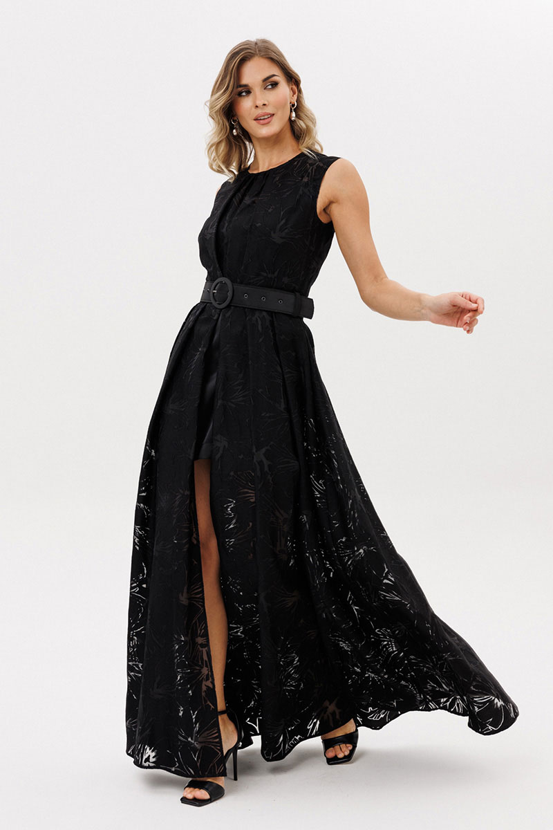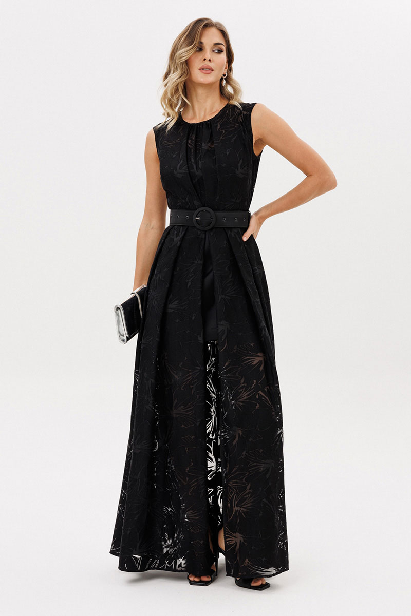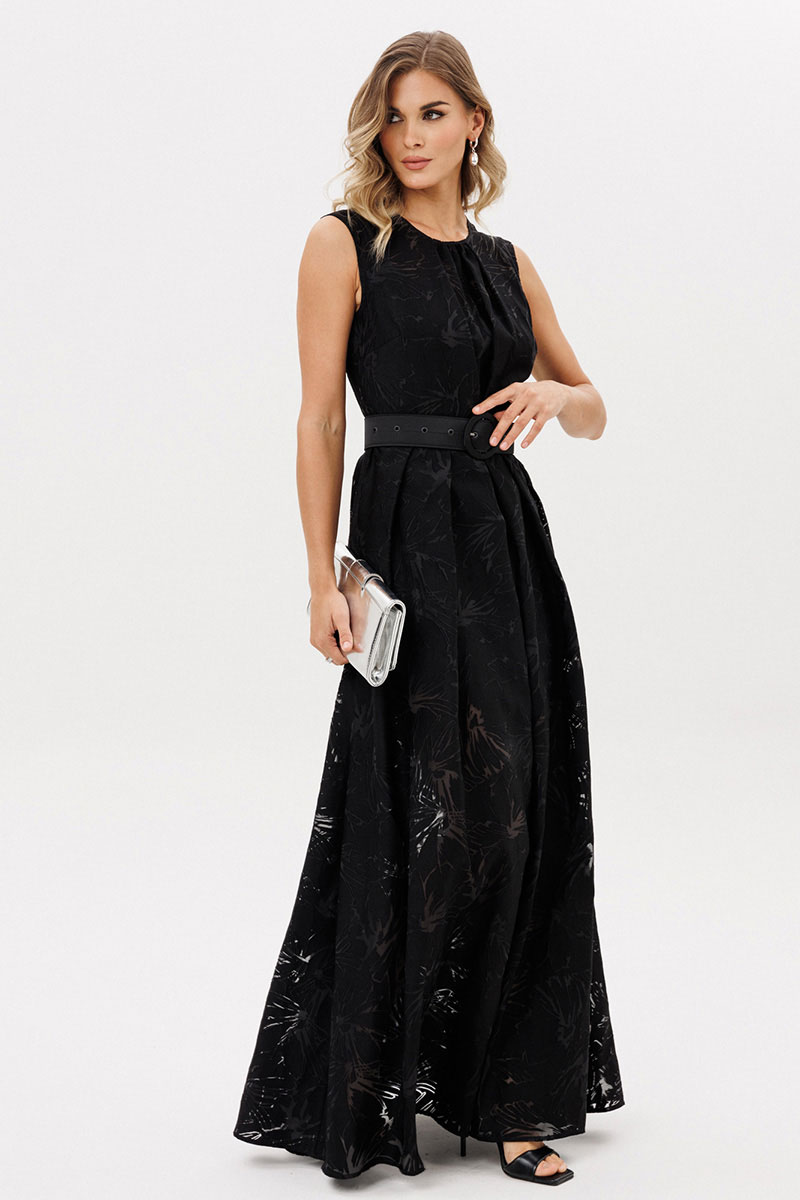 Платье выполнено из плательной ткани с принтом. Платье Х-образного силуэта, длиной в пол. Платье отрезное по линии талии. Спереди встречная складка со сборкой по центру. Горловина округлой формы. Лиф на подкладке из атласа с V-образным вырезом. Верхняя юбка расширенная к низу со складками по переду и спинке. По центру переда разрез от талии до низа. Нижняя юбка прямого силуэта, длиной выше линии колена. В комплект входит съемный ремень из атласа с обтяжной пряжкой и блочками.