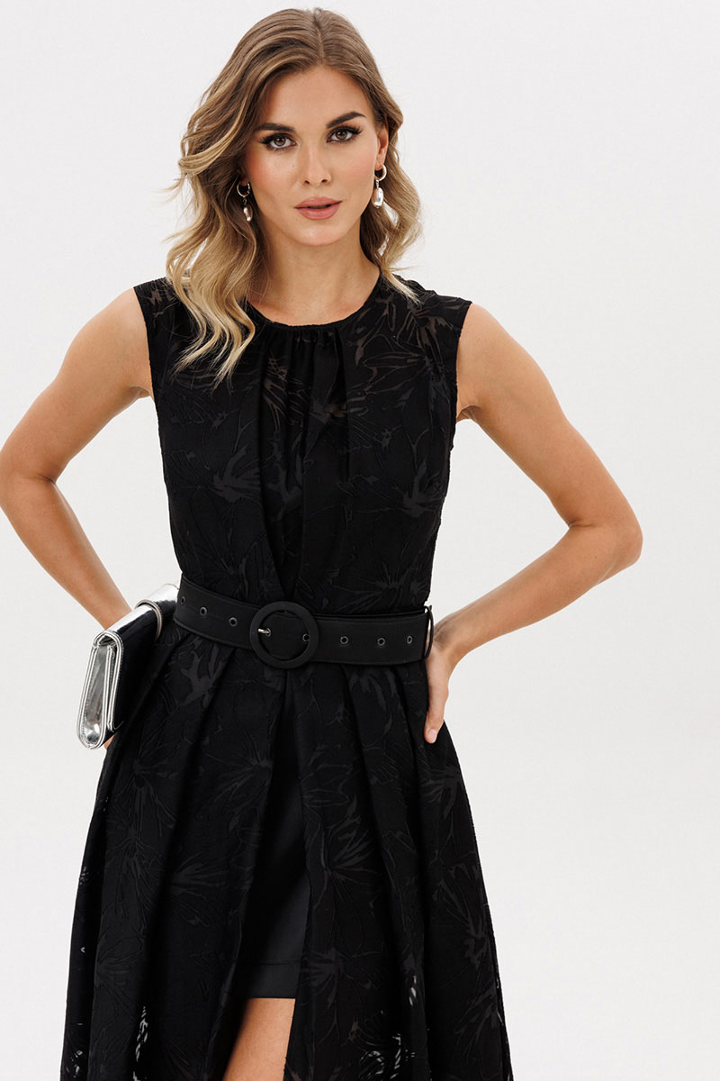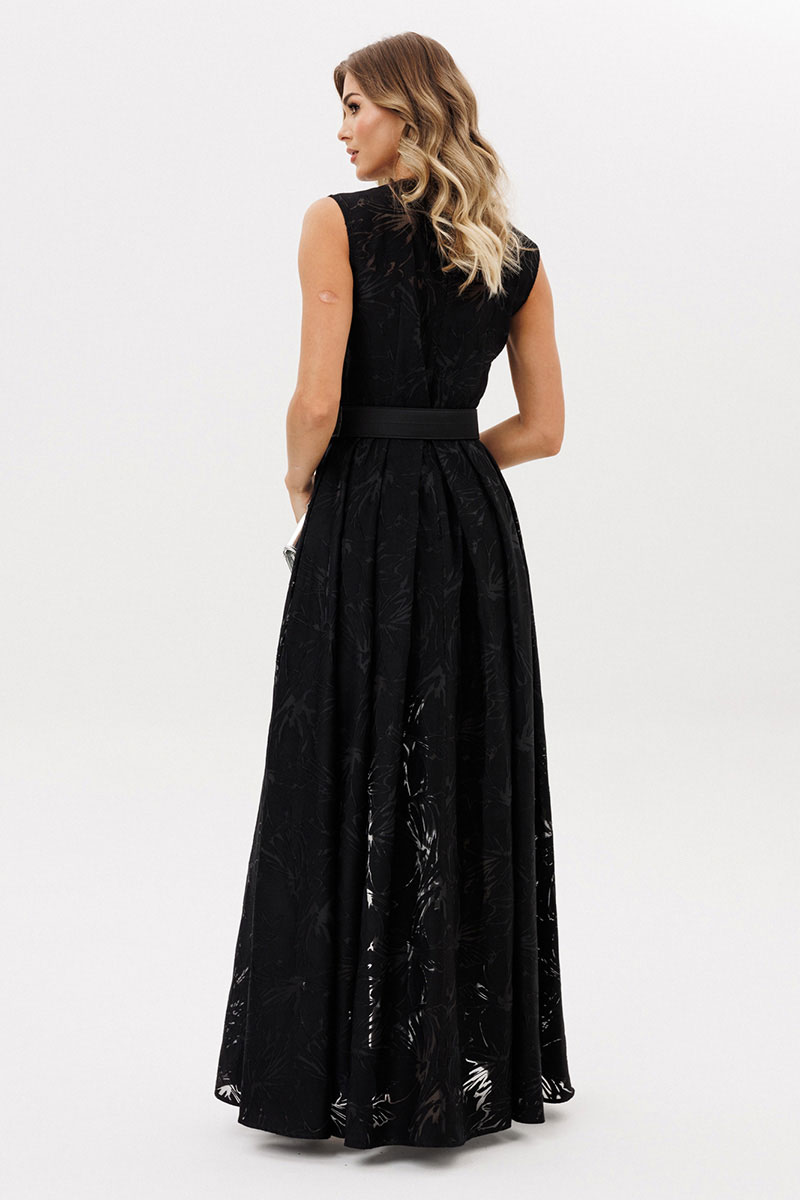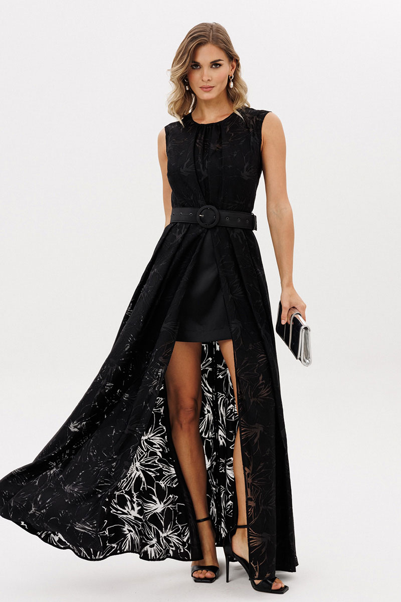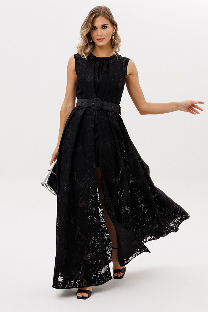 Платье выполнено из плательной ткани с принтом. Платье Х-образного силуэта, длиной в пол. Платье отрезное по линии талии. Спереди встречная складка со сборкой по центру. Горловина округлой формы. Лиф на подкладке из атласа с V-образным вырезом. Верхняя юбка расширенная к низу со складками по переду и спинке. По центру переда разрез от талии до низа. Нижняя юбка прямого силуэта, длиной выше линии колена. В комплект входит съемный ремень из атласа с обтяжной пряжкой и блочками.