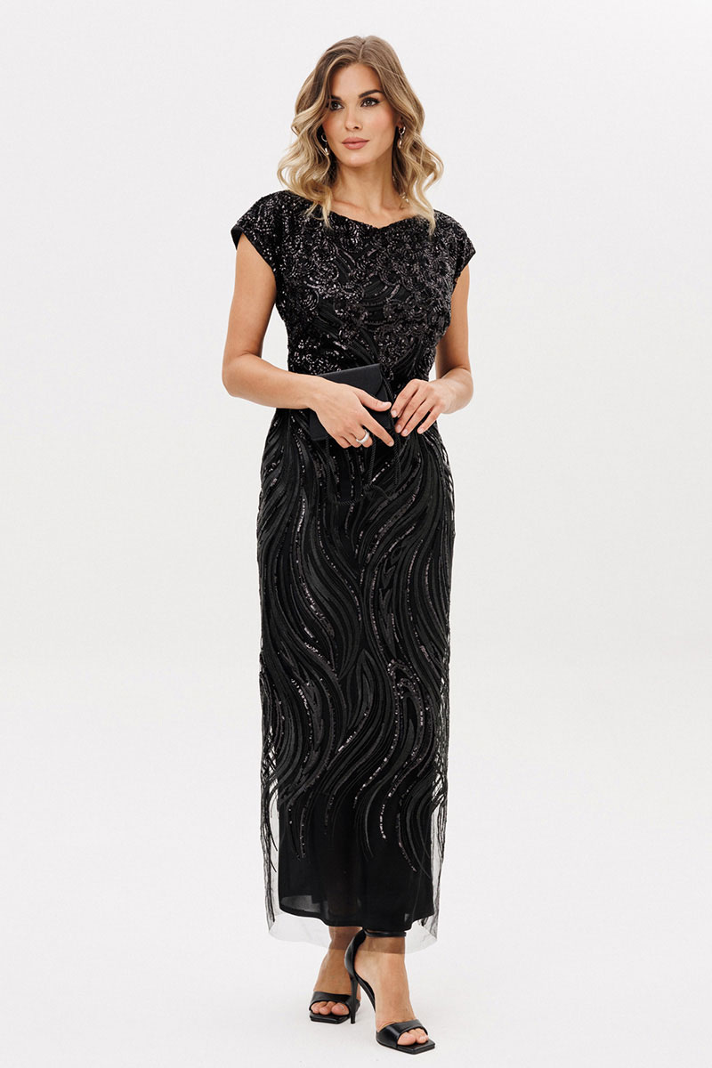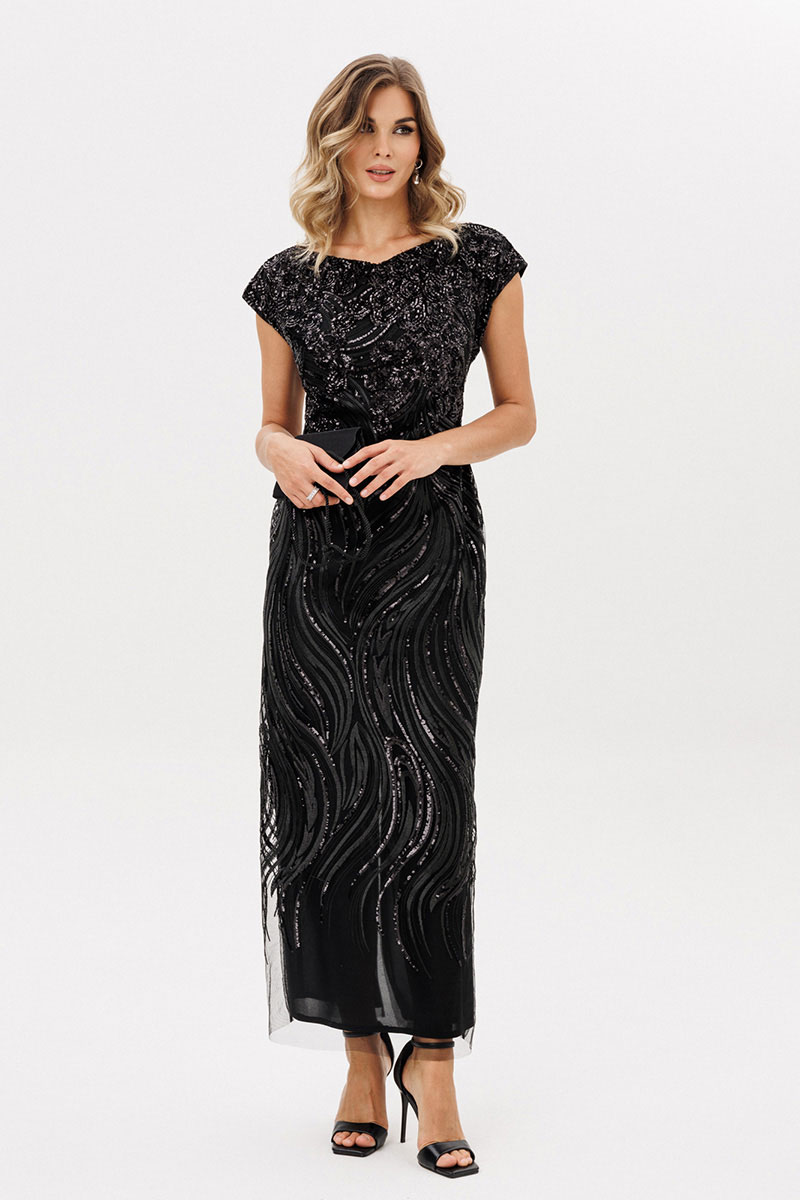 Платье выполнено из сетки с вышивкой с пайетками. В среднем шве спинки разрез и застежка на молнию с металлическими звеньями. Горловина и спинка выполнены в виде V-образной лодочки. Плечевой шов удлинен, образуя рукав цельнокроенного покроя. Платье на отлетной по низу подкладке.