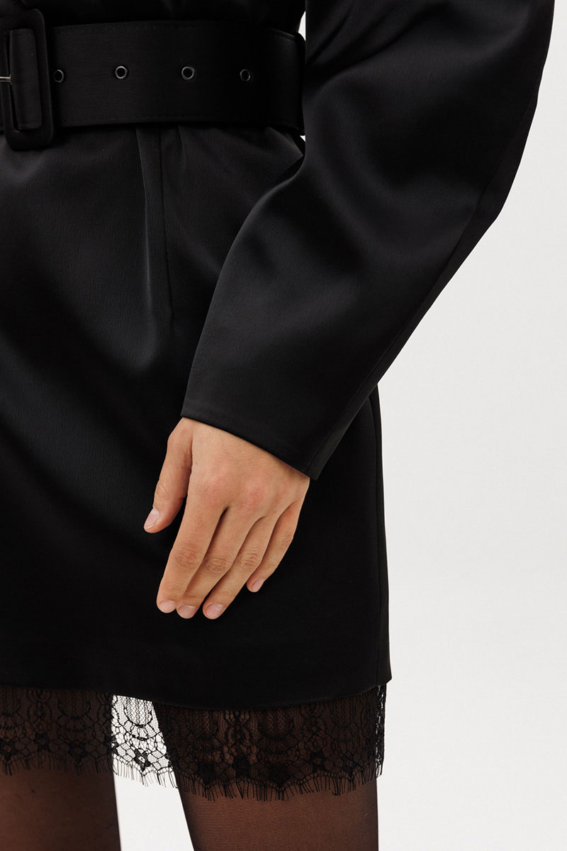 Платье выполнено из плотного атласа. Платье полуприлегающего силуэта длиной выше линии колена. Застежка на потайную молнию сзади в среднем шве спинки. Горловина округлой формы. Рукав двухшовный, фигурной формы. Низ платья декорирован кружевом. Платье на притачной по низу подкладке. В комплект входит съемный ремень из основной ткани с обтяжной пряжкой и блочками.