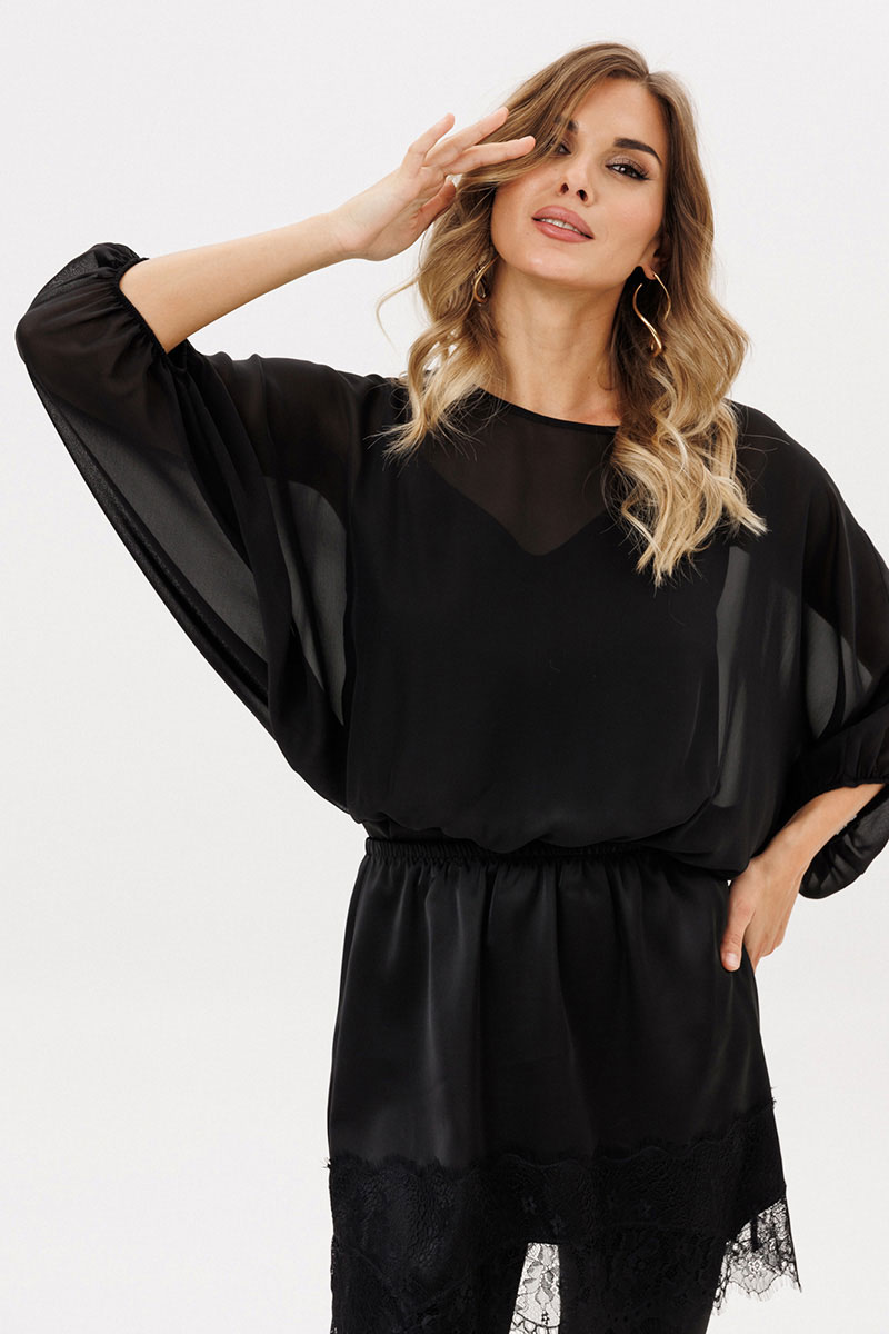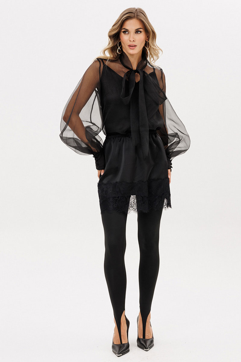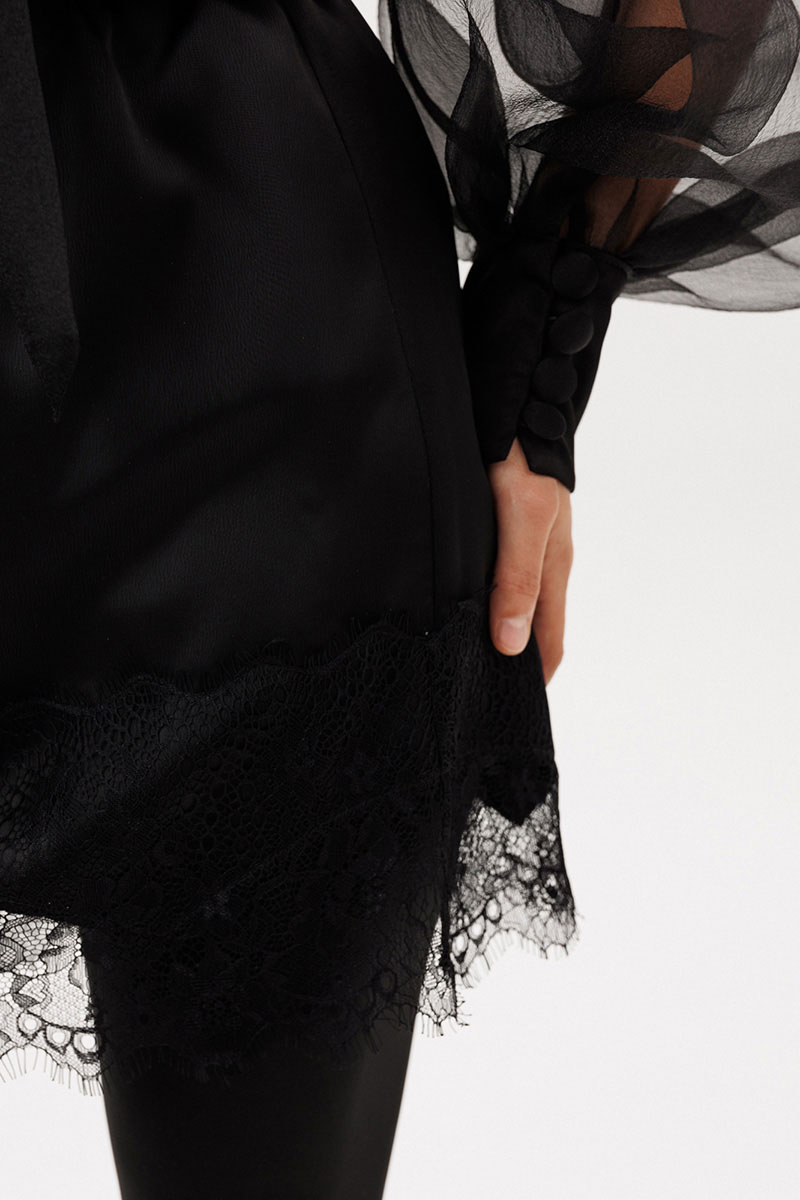 Юбка выполнена из плотного атласа. Юбка прямого силуэта длиной выше линии колена. Юбка на поясе с эластичной тесьмой. Низ фигурной формы, декорирован тесьмой-кружевом.