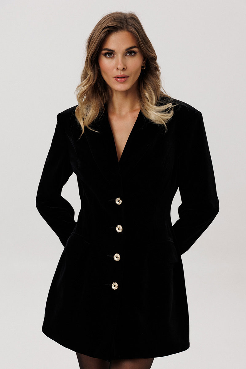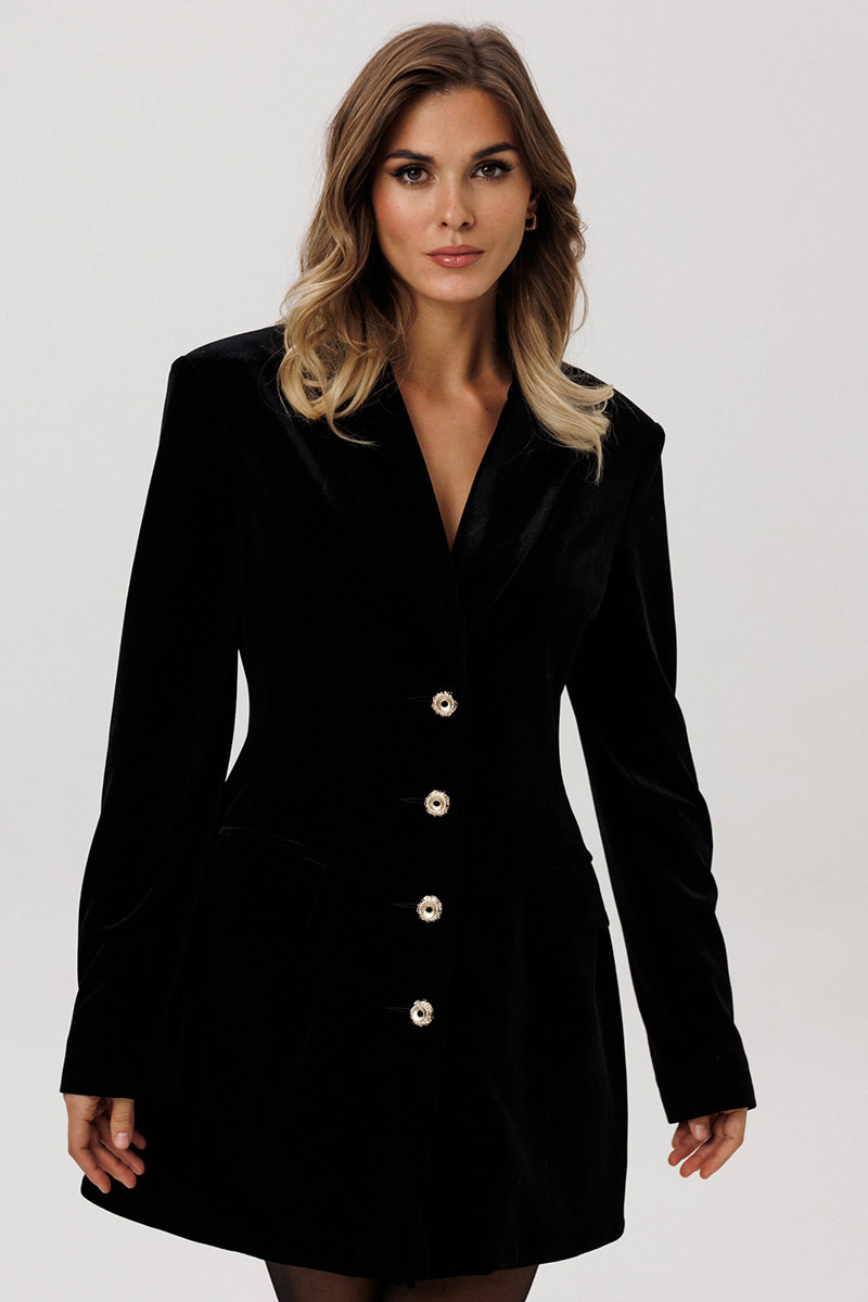 Платье-жакет выполнено из бархата. Платье полуприлегающего силуэта длиной выше линии колена. Спереди прорезные карманы с клапанами и лацканы. Застежка центральная бортовая на пуговицы. Спинка со средним швом. Воротник пиджачного типа. Рукав втачного покроя, двухшовный. По низу рукава шлица, застегивающаяся на четыре пуговицы. Платье на притачной по низу подкладке.