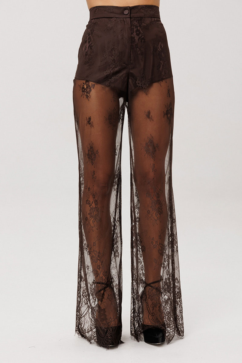 Брюки выполнены из гипюра. Брюки покроя " клеш", длиной в пол, на притачном поясе. Спереди застежка на пуговицу и молнию. По задней части пояса эластичная тесьма. По низу брюк фестоны. Брюки на отлетной по низу подкладке в виде мини-шорт из атласа.