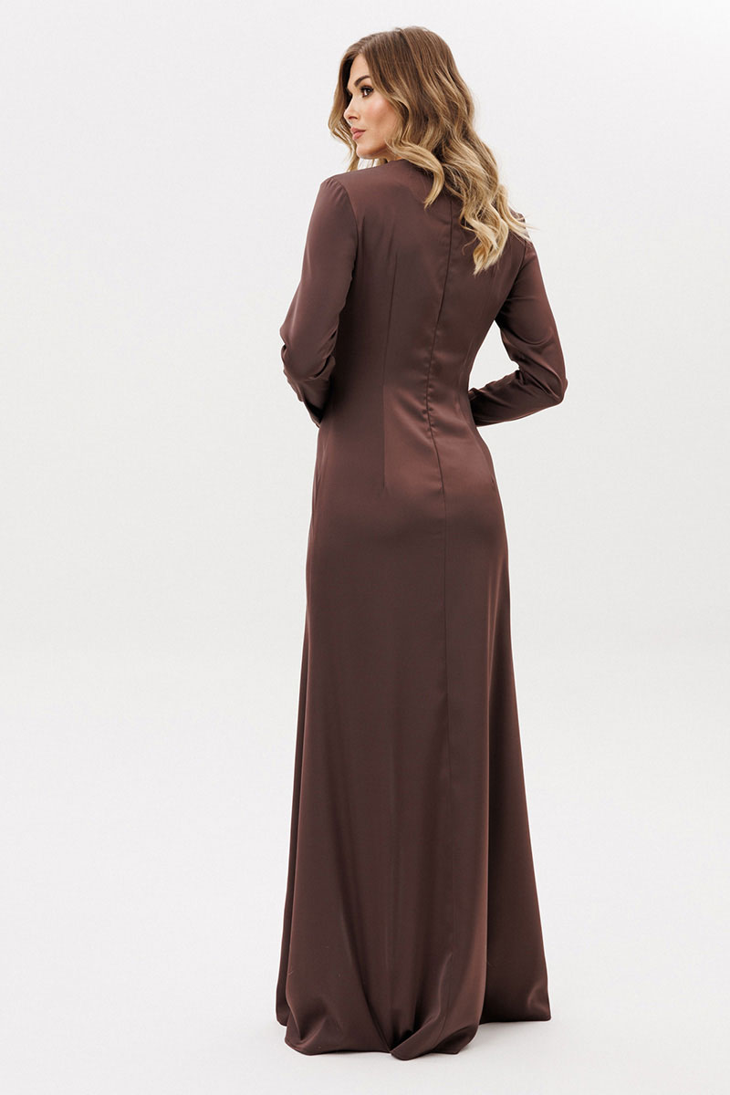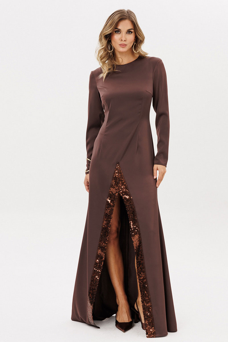 Платье выполнено из плотного атласа. Платье полуприлегающего силуэта длиной в пол. Застежка на потайную молнию сзади в среднем шве спинки, горловина округлой формы. Рукав втачного покроя, одношовный. Спереди разрез V-образной формы, декорированный пайетками.