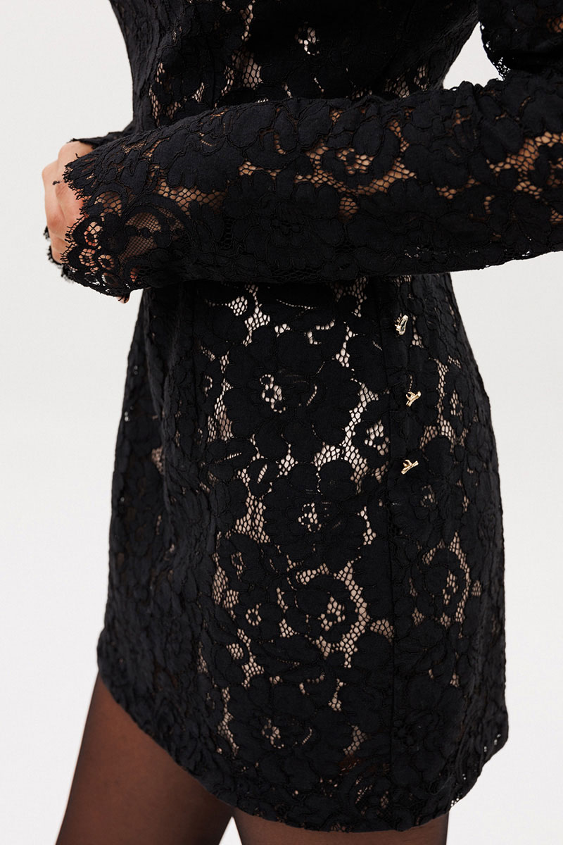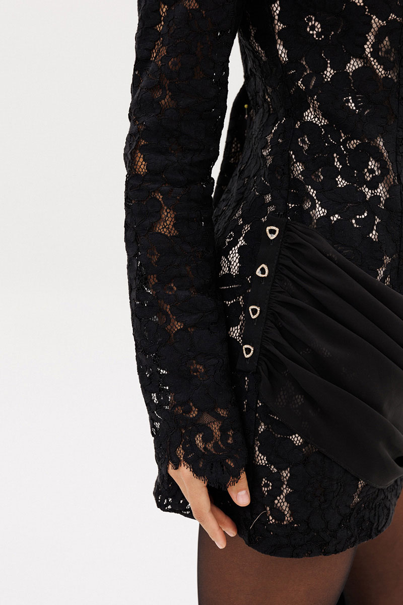Платье выполнено из гипюра. Платье полуприлегающего силуэта длиной выше линии колена. Застежка на потайную молнию сзади в среднем шве спинки. Горловина округлой формы. Плечевой шов улинен. Рукав втачной, одношовный. По низу рукава фестоны. Платье на отлетной по низу подкладке телесного цвета. Платье с плечевой накладкой. Платье декорировано сьемной драпировкой из шифона, которая крепится к платью по боковым швам на петли и декоративные пуговицы.