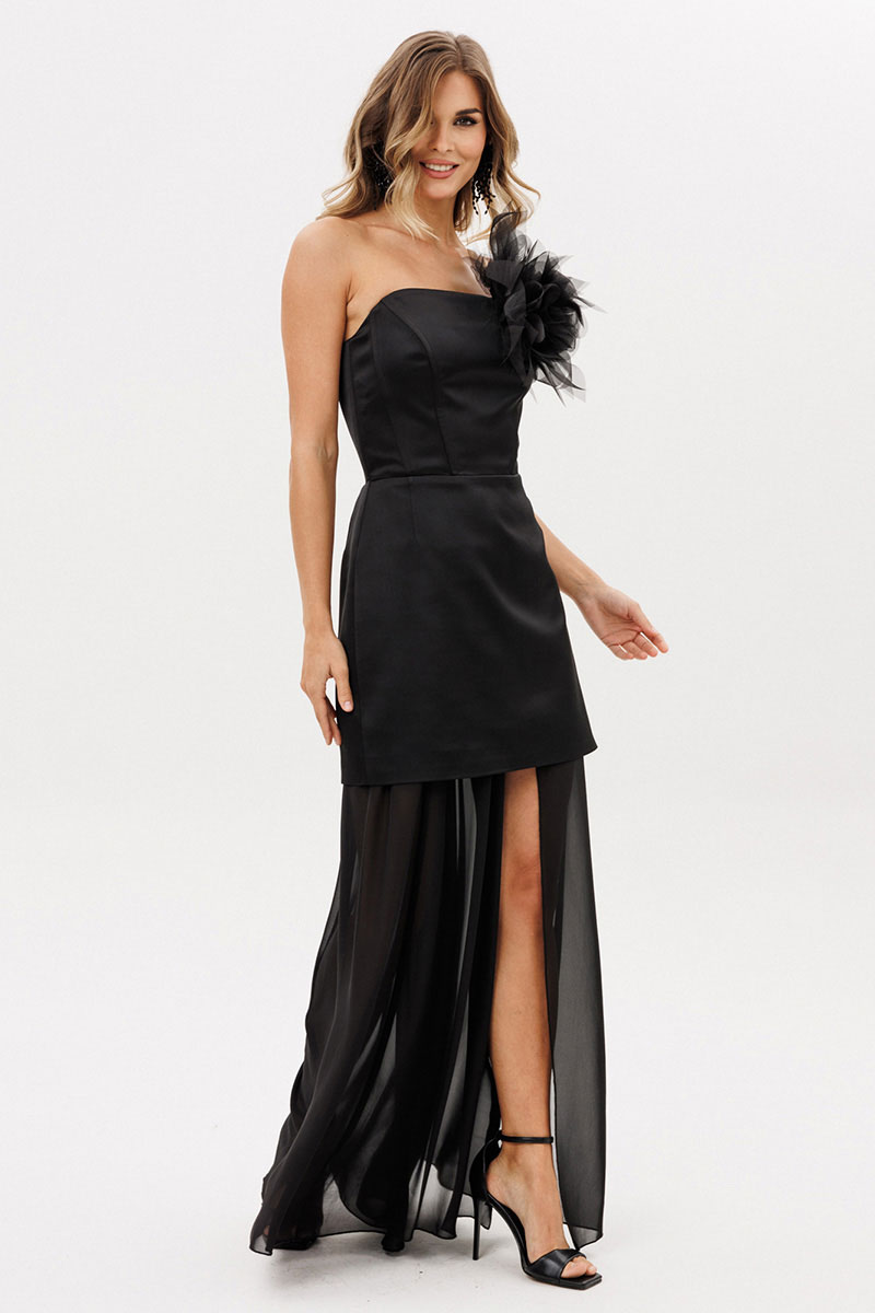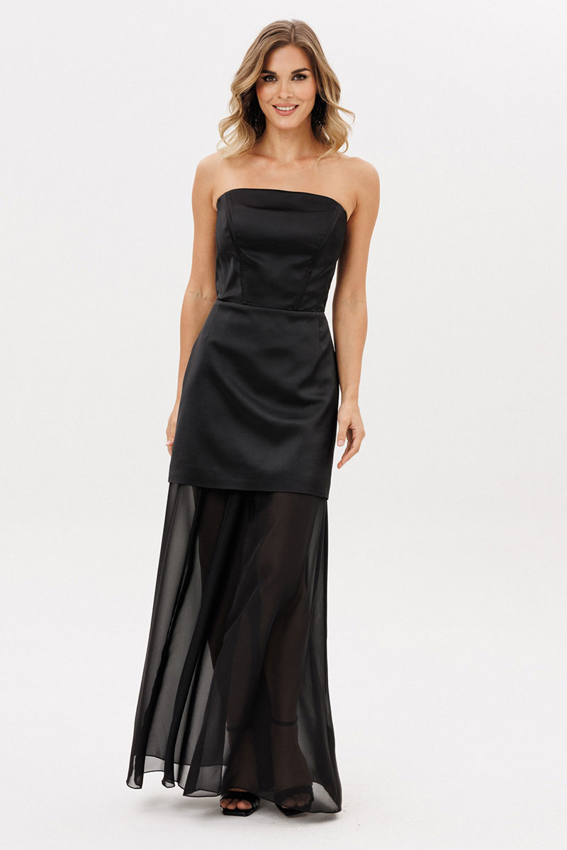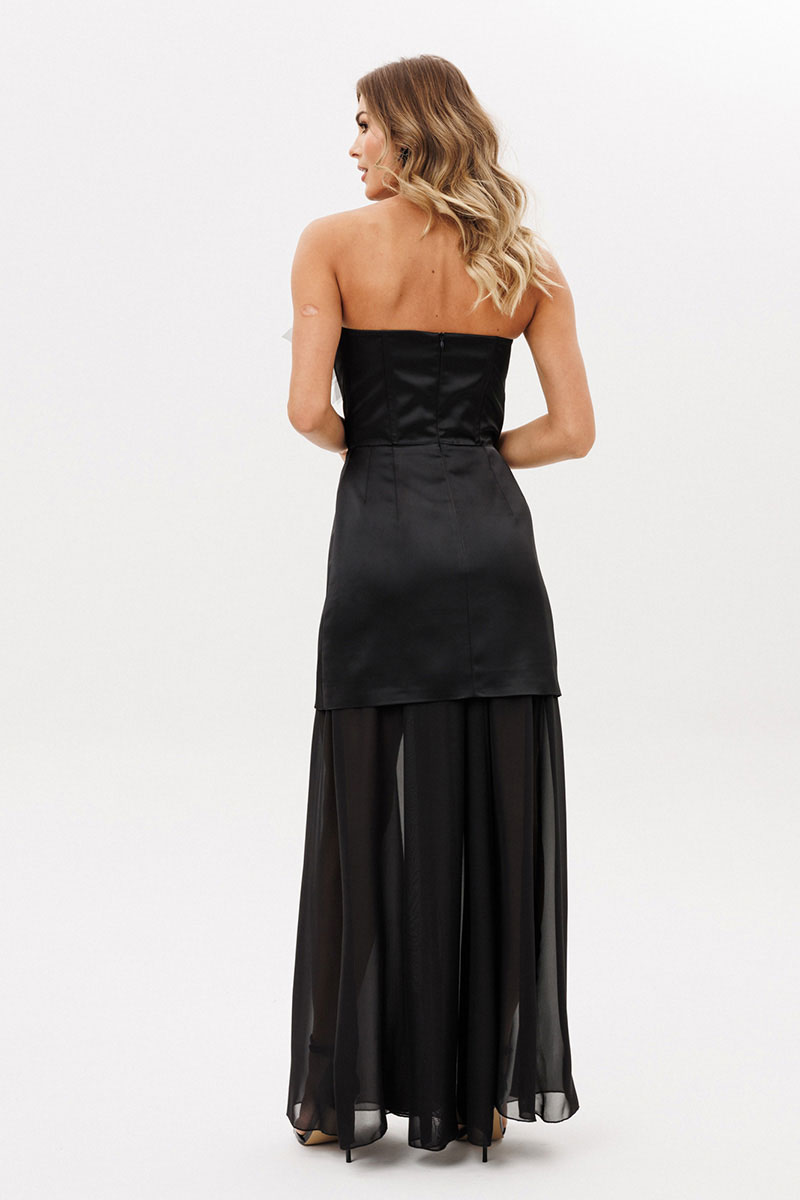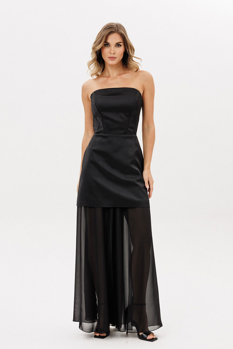 Юбка выполнена из шифона. Юбка А-образного силуэта, длиной в пол. Юбка на притачном поясе с эластичной тесьмой. Юбка состоит из 6 клиньев. Спереди слева разрез. Юбка без подкладки.