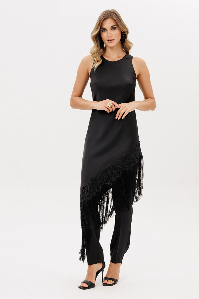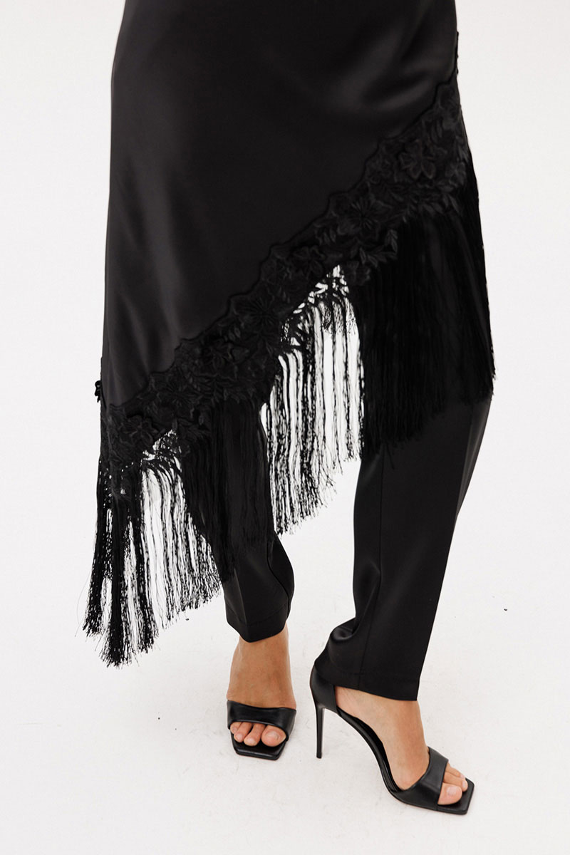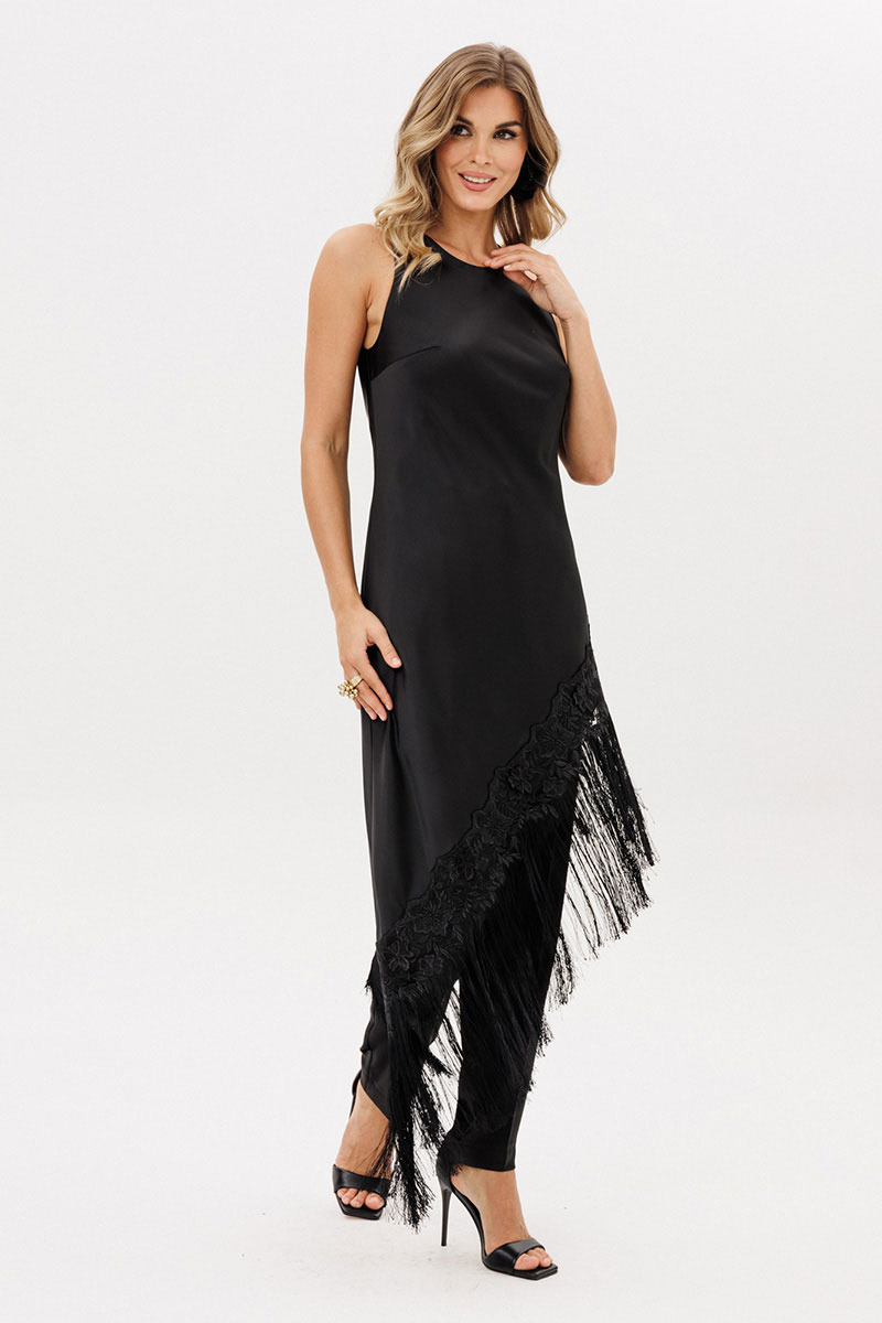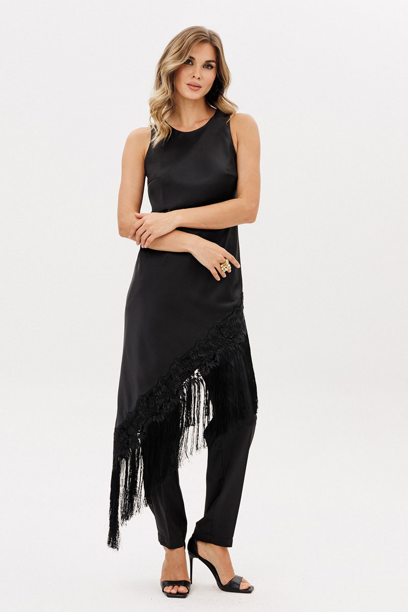 Платье А-образного силуэта с ассиметричным низом. Платье выкроено по косой. Горловина округлой формы. Плечевой шов заужен. Низ платья декрирован бахромой. Лиф платья на отлетной по низу подкладке.