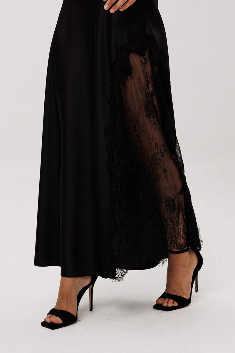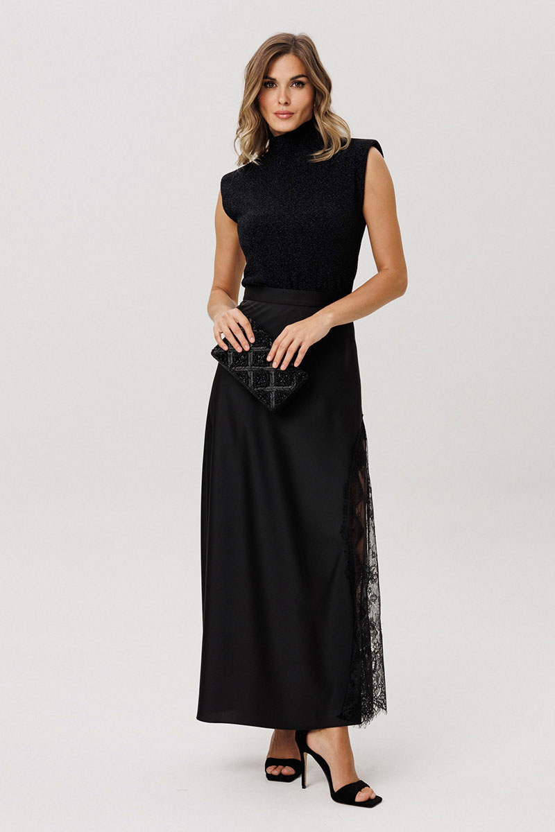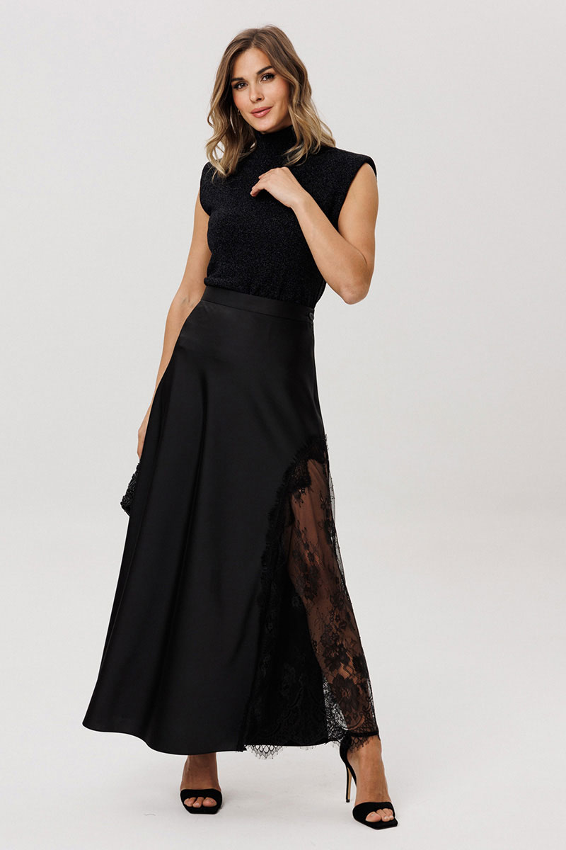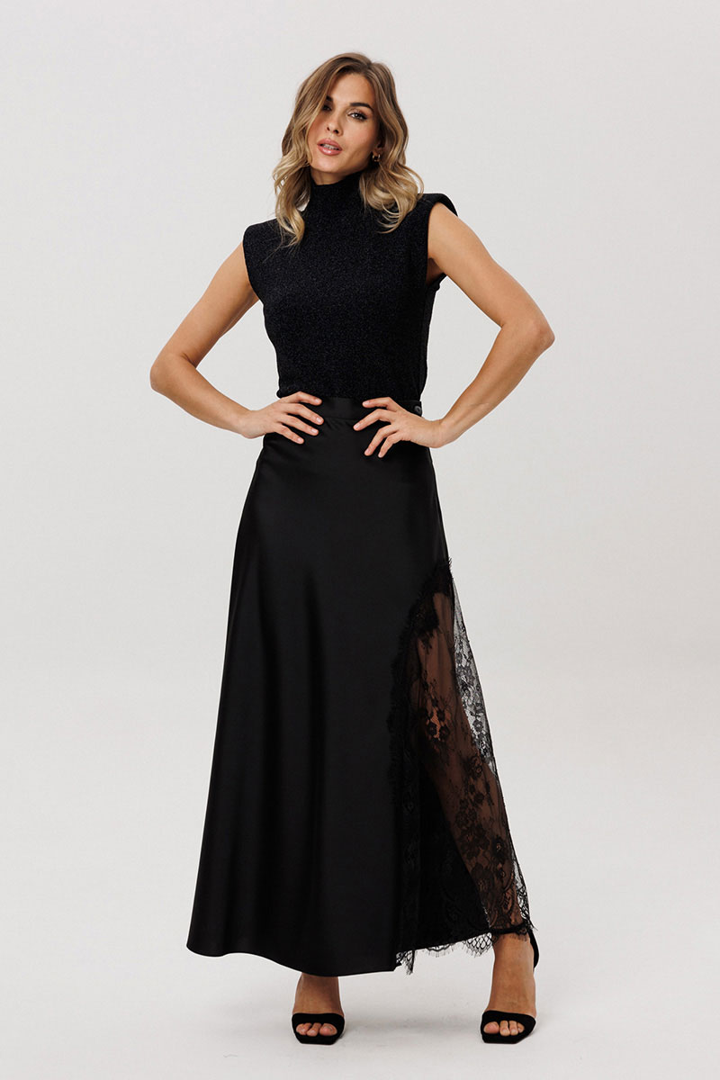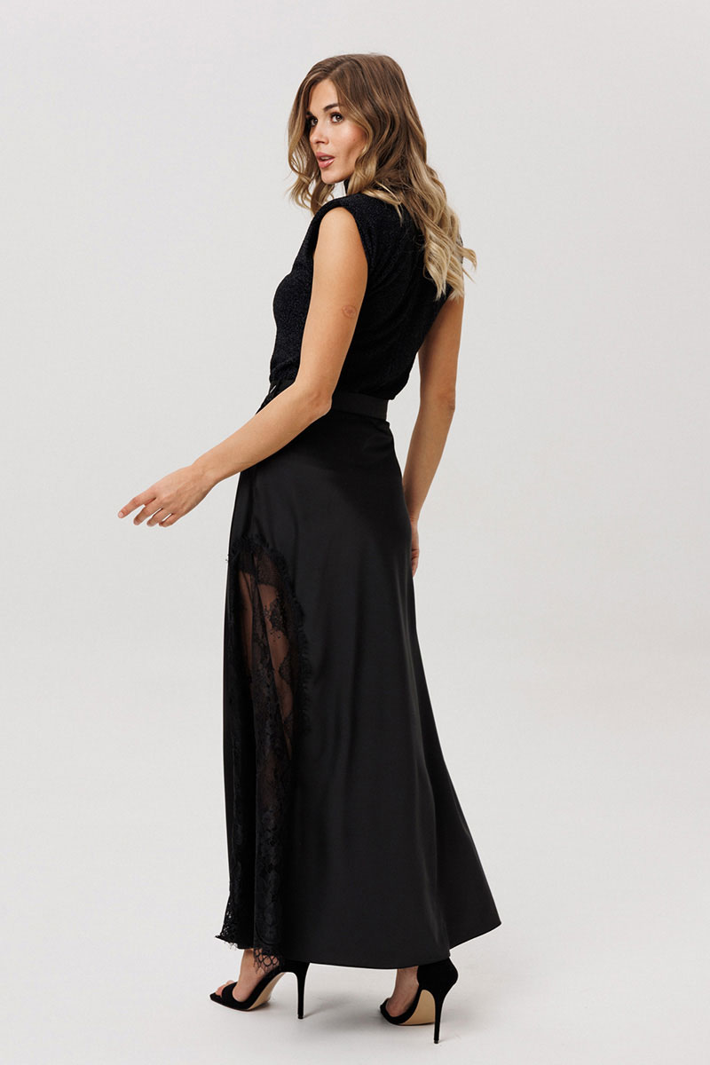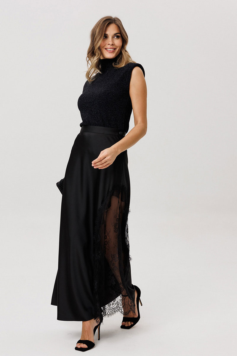 Юбка выполнена из плотного атласа. Юбка А-образного силуэта, на притачном поясе, длиной 7/8. Юбка выкроена по косой. Застежка в левом боковом шве на потайную молнию и пуговицу. По