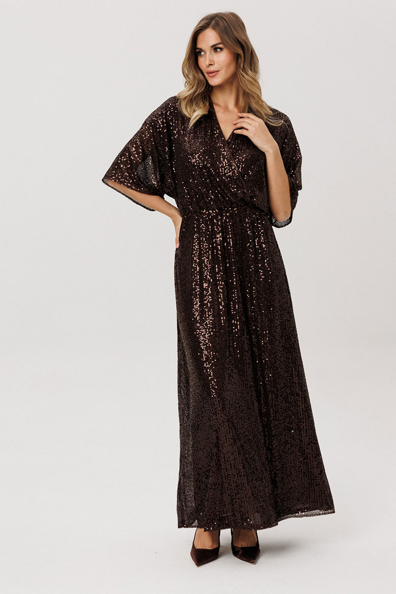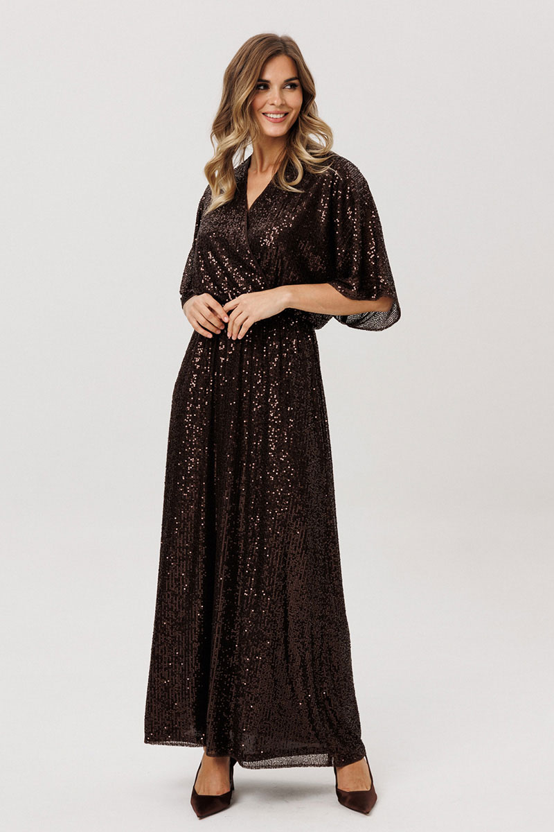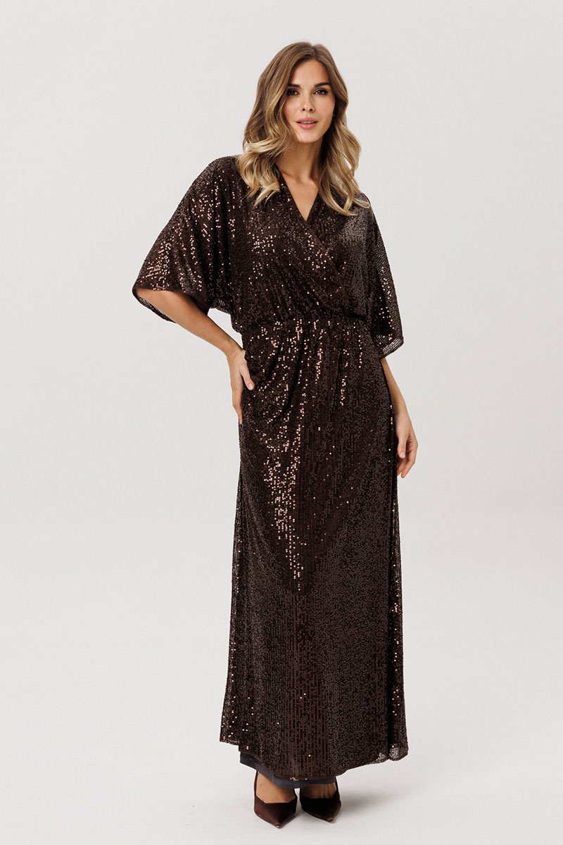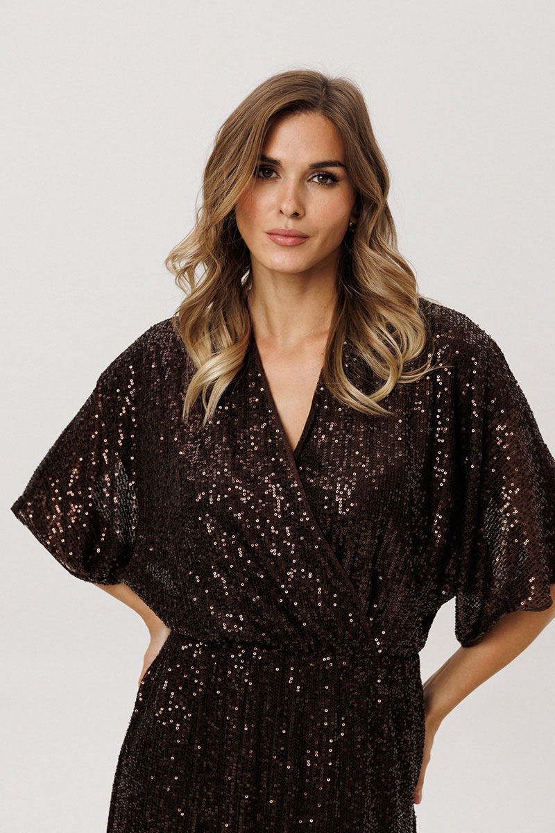Платье выполнено из трикотажного полотна в пайетки. Платье X-образного силуэта, длиной миди, отрезное по линии талии. Лиф покроя кимоно. Перед выполнен на запах. Горловина V-образной формы. Переднее и заднее полотнище цельные и расширенные к низу. По линии талии эластичная тесьма. Платье на отлетной по низу трикотажной подкладке.