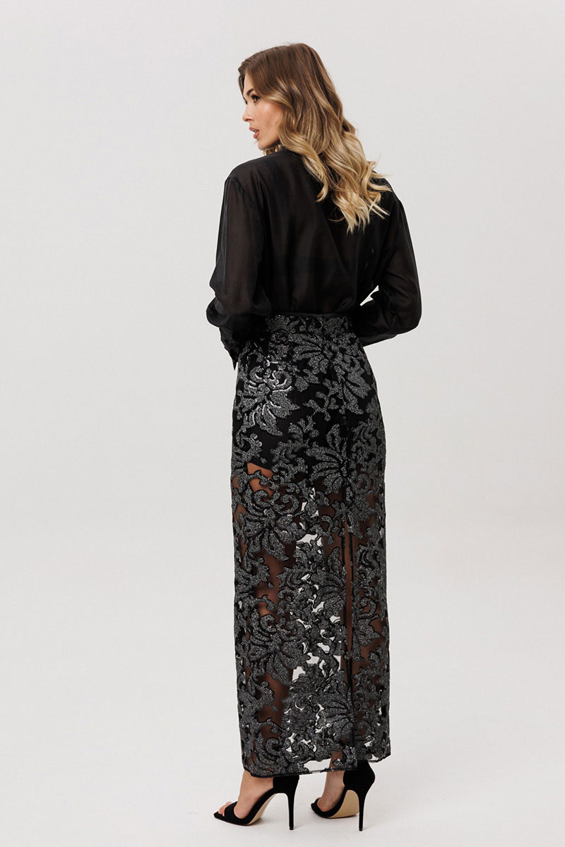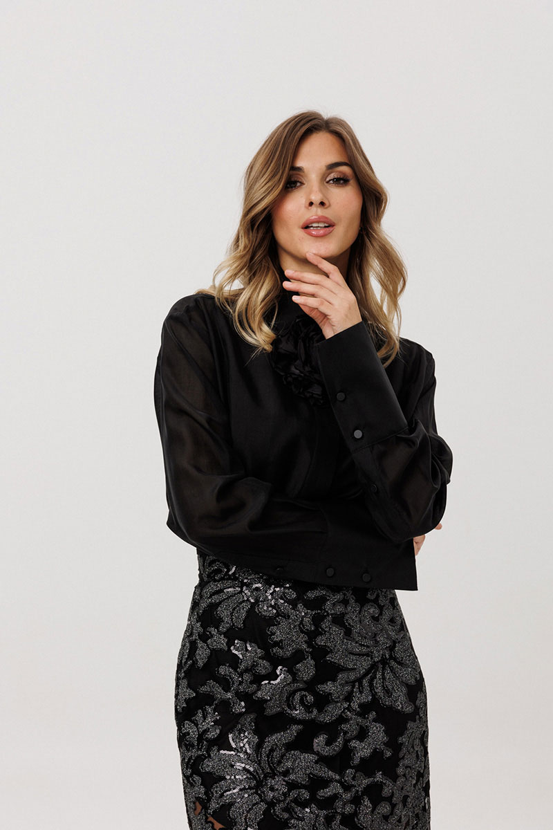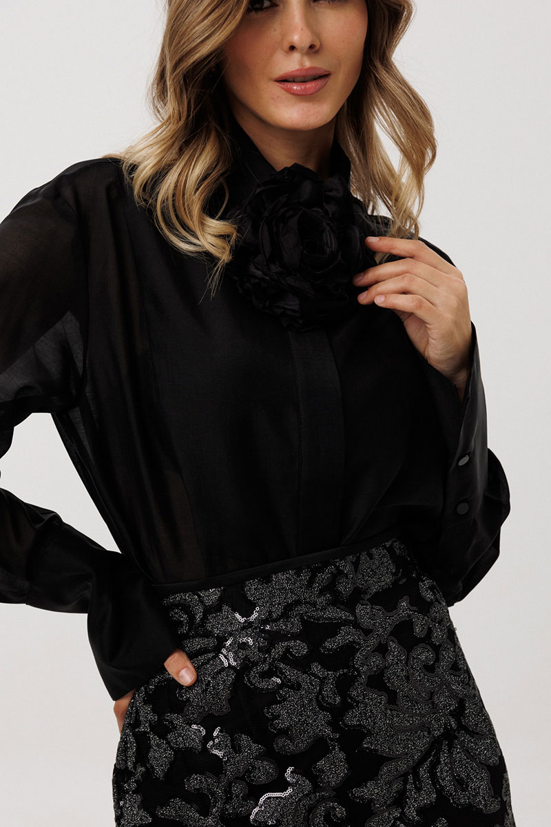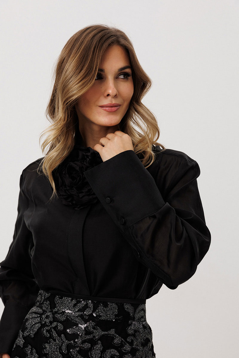 Блузка выполнена из блузочной ткани. Блузка прямого силуэта, длиной ниже линии бедер. Спереди фигурная кокетка и застежка на потайную планку. Спинка цельная. Воротник стояче-отложной.