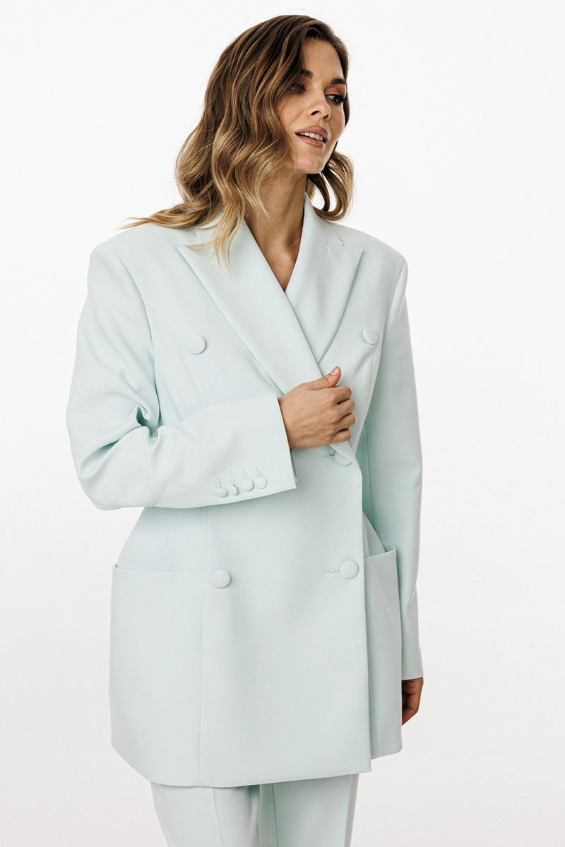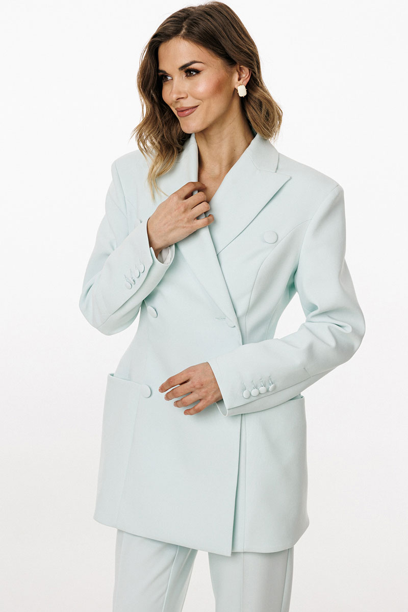 накладками, плечевой шов удлинен. Рукав втачной, двухшовный. По низу рукав обработан шлицей, застёгивающеюся на 4 петли и пуговицы. Жакет двубортный, на притачной по низу