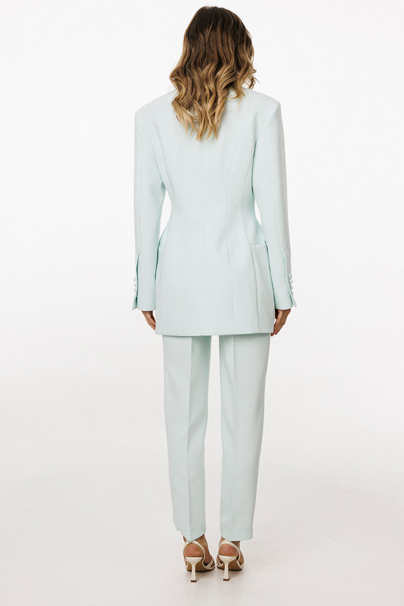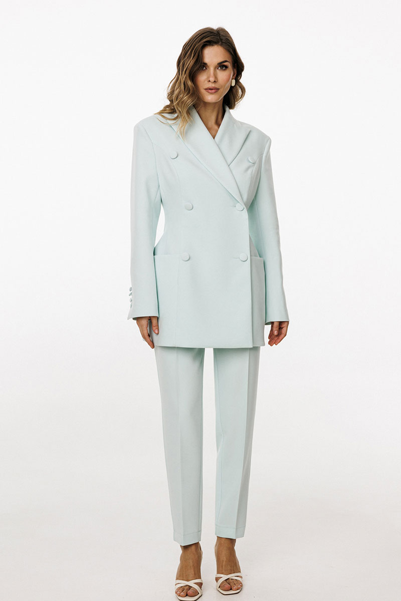 переходящие на спинку, в которых обработаны карманы и лацканы. На спинке обработаны две пары рельефов от проймы до низа и средний шов. Воротник пиджачного типа. Жакет с плечевыми