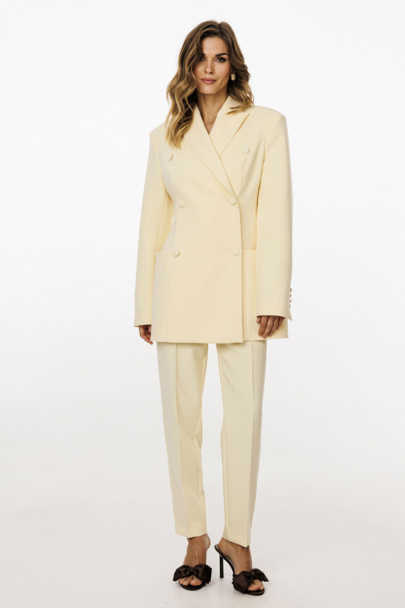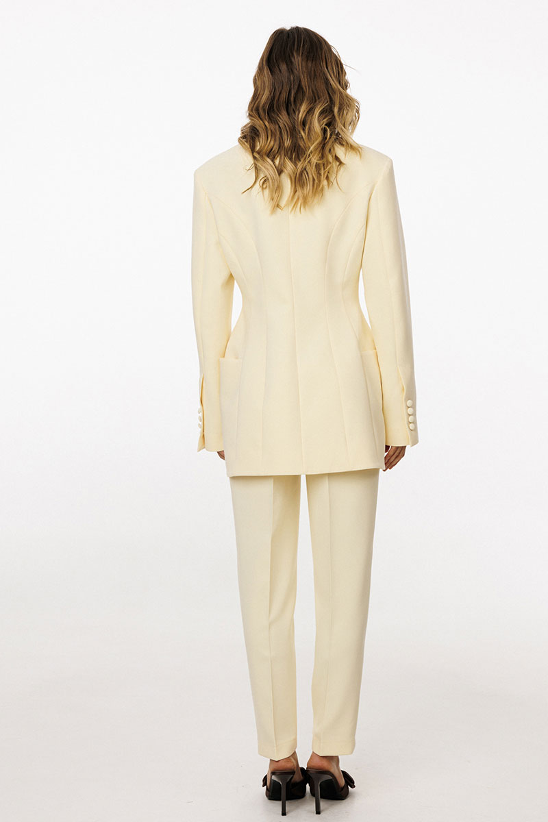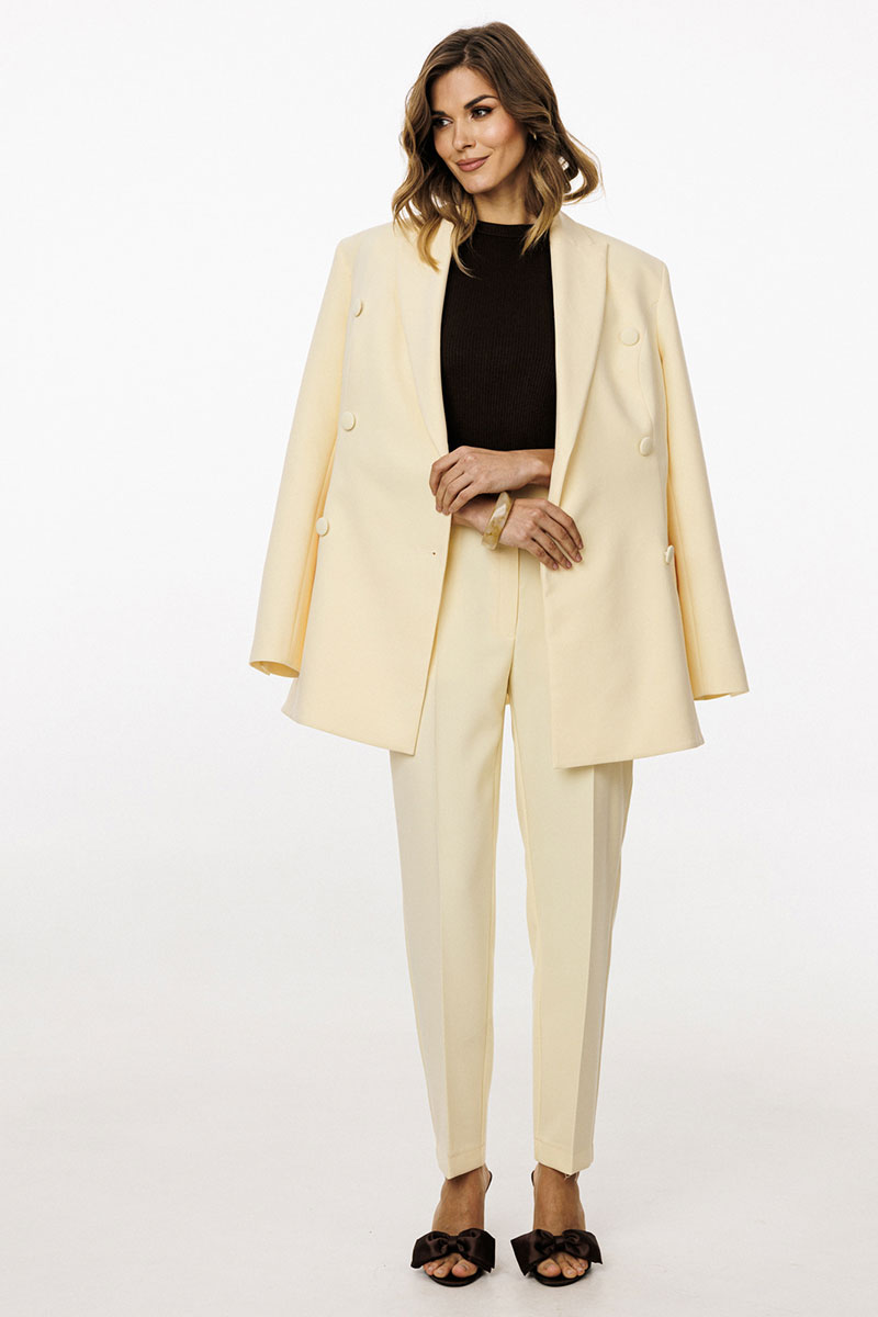 переходящие на спинку, в которых обработаны карманы и лацканы. На спинке обработаны две пары рельефов от проймы до низа и средний шов. Воротник пиджачного типа. Жакет с плечевыми