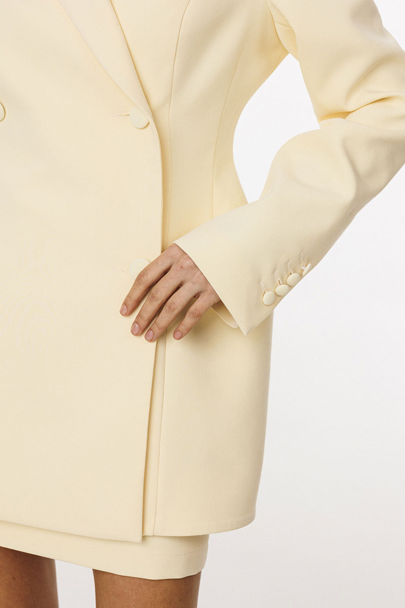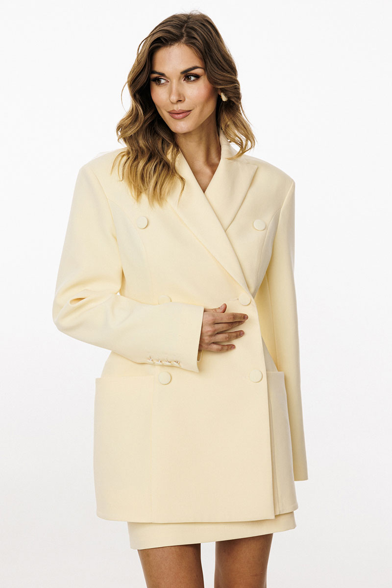 накладками, плечевой шов удлинен. Рукав втачной, двухшовный. По низу рукав обработан шлицей, застёгивающеюся на 4 петли и пуговицы. Жакет двубортный, на притачной по низу