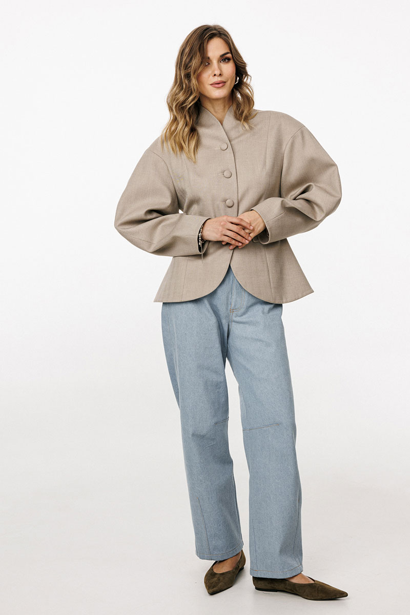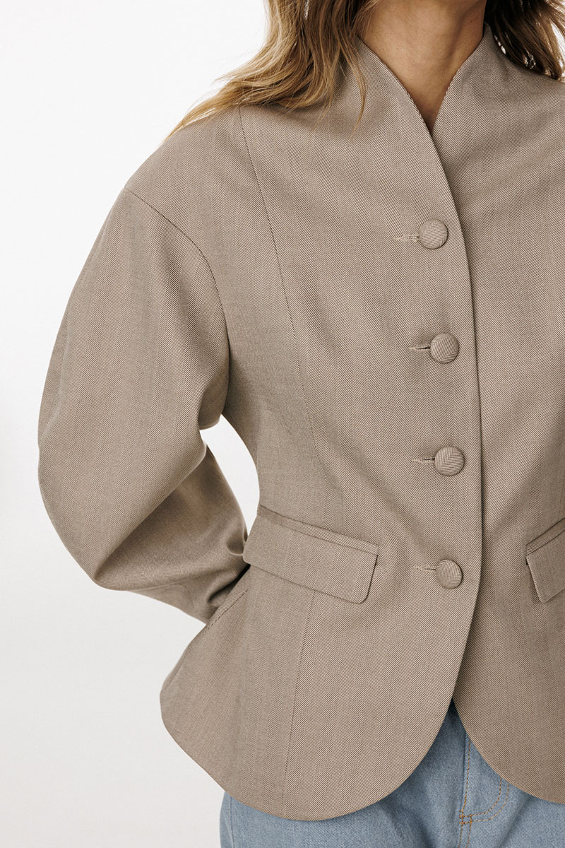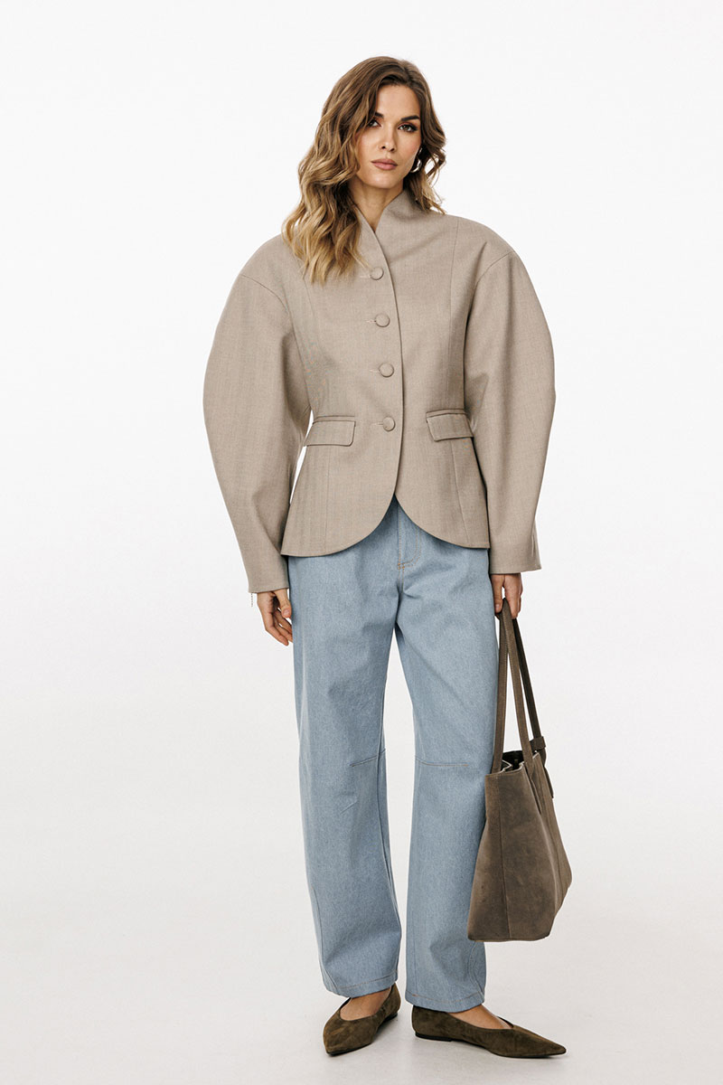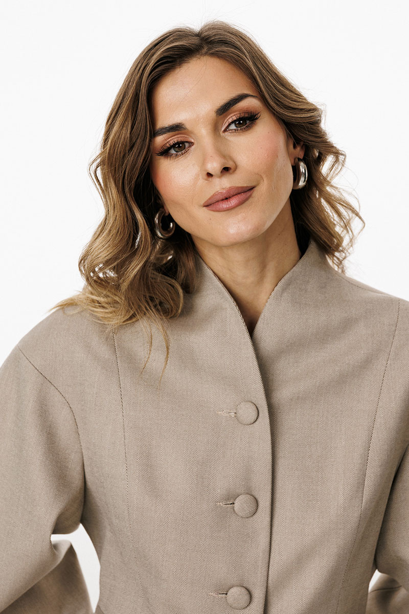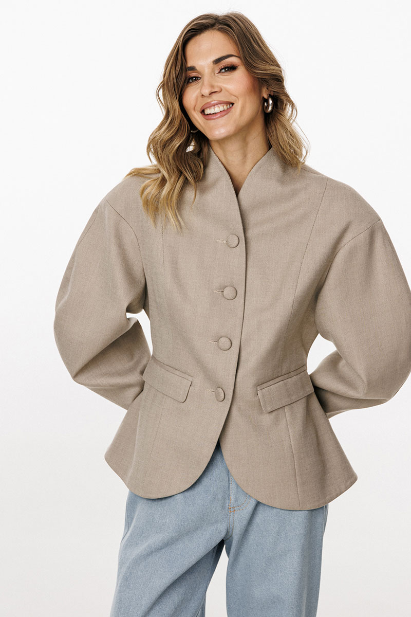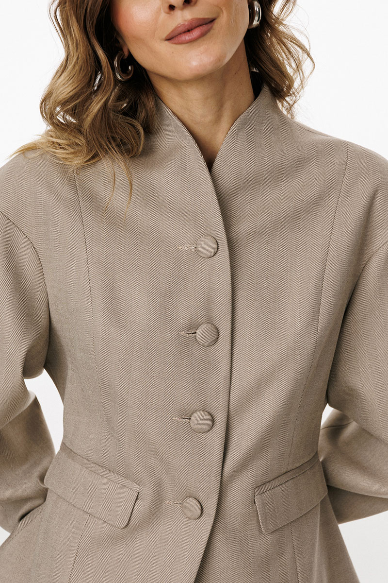 обработана цельнокроеным воротником-стойкой. Плечевой шов удлинен. Рукав фигурной формы, двухшовный, заужен к низу. Жакет с плечевыми накладками.