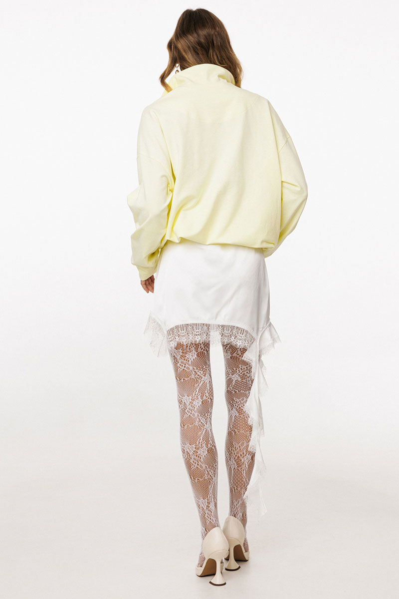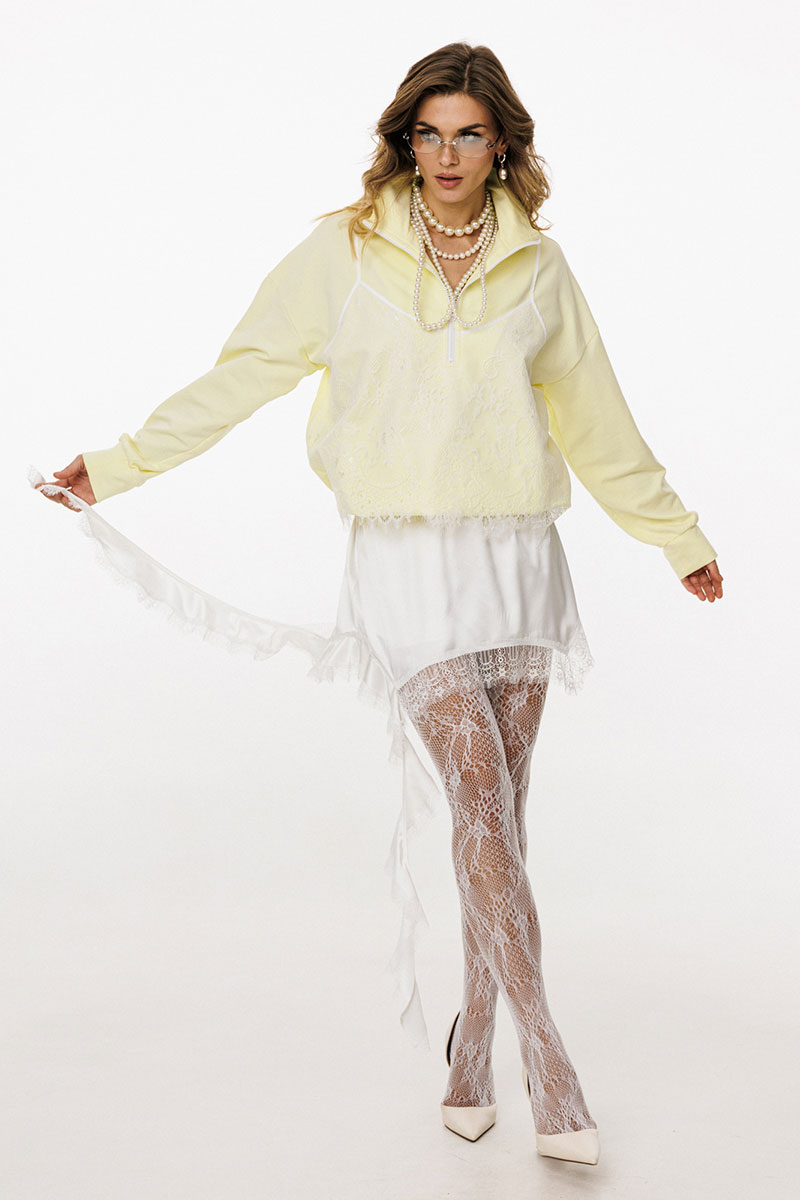 Юбка выполнена из тонкого атласа. Юбка прямого силуэта, длиной выше линии колена. Юбка на цельнокроеном поясе с эластичной тесьмой. Низ юбки фигурной формы. Юбка декорирована по низу тесьмой-кружевом и воланом с одной стороны. Юбка на подкладке.