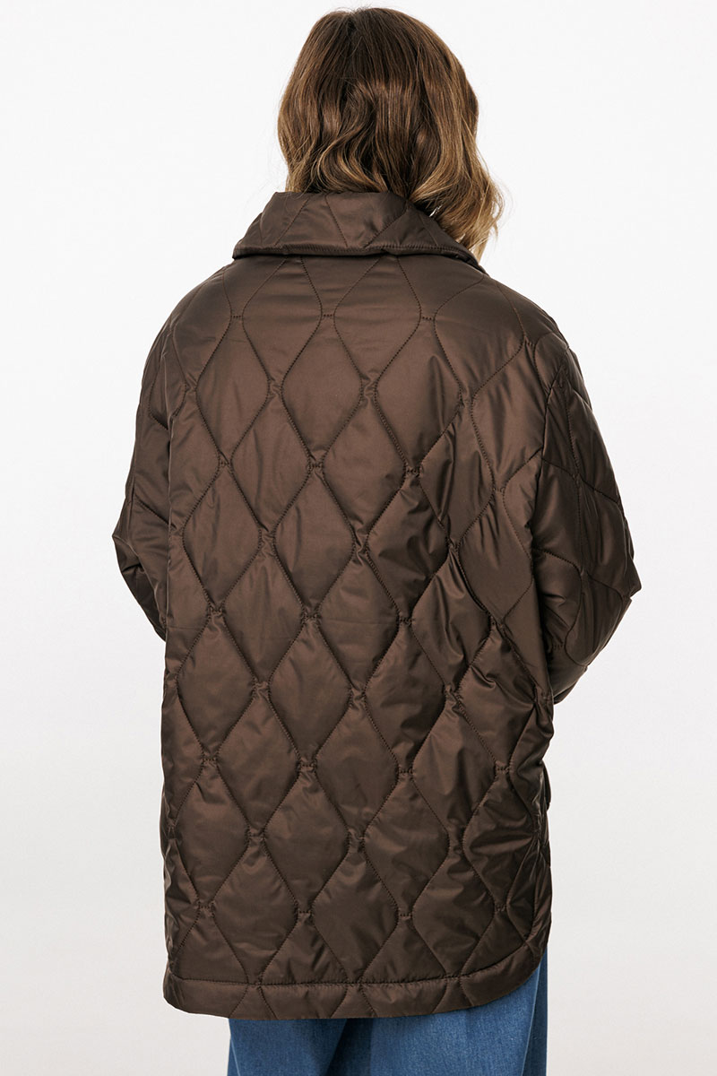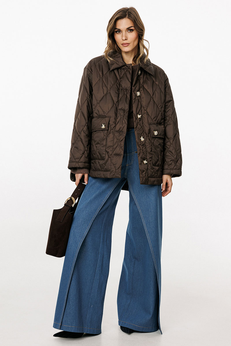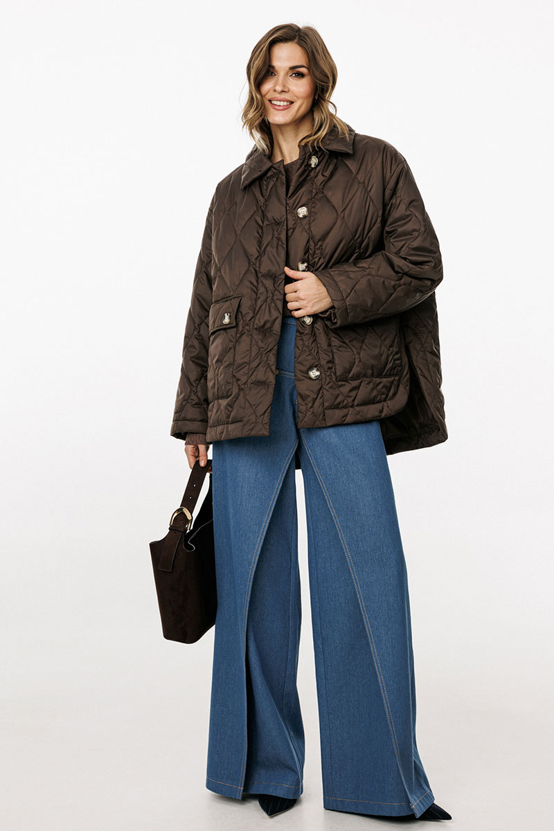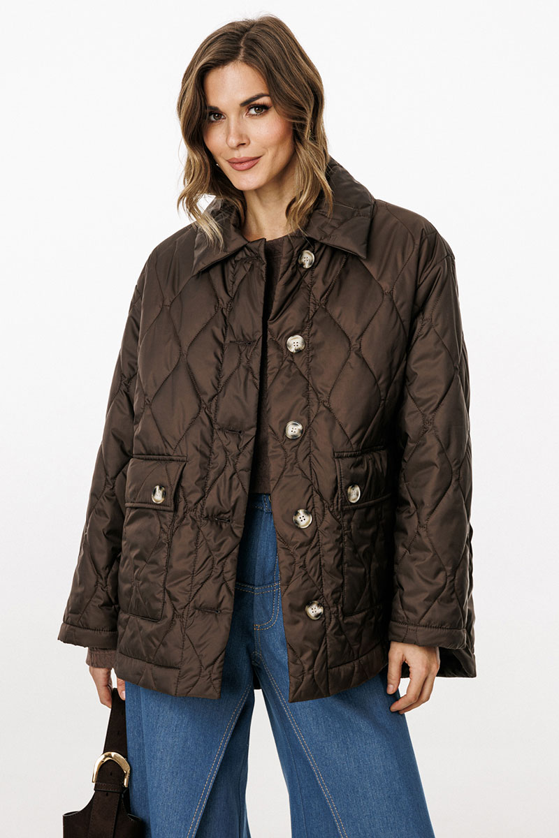 Куртка выполнена из плащевой ткани, простеганной с Isosoft. Куртка прямого силуэта, длиной до линии бедер. Застежка центральная бортовая на пришивные пуговицы. Спереди накладные