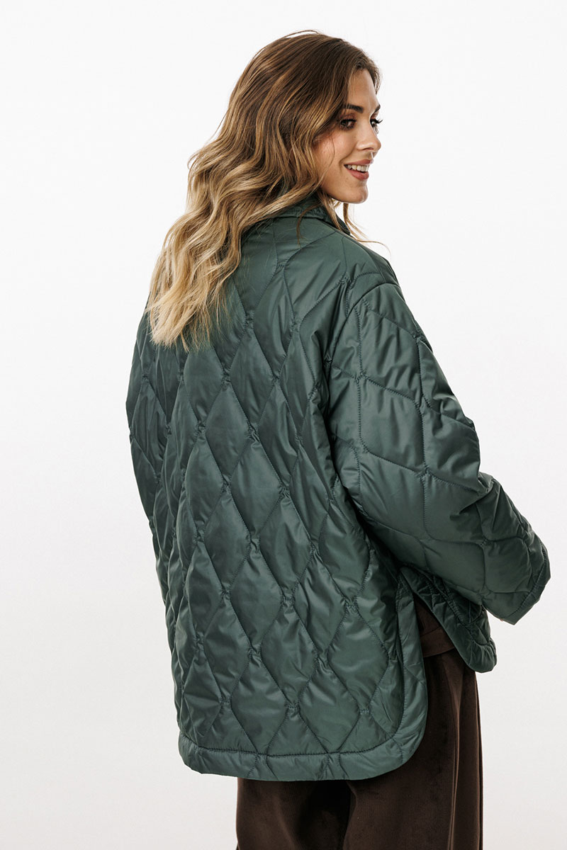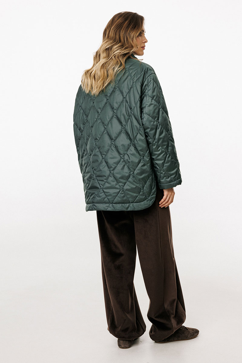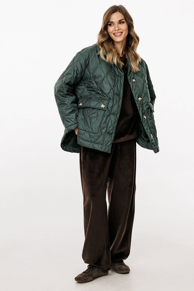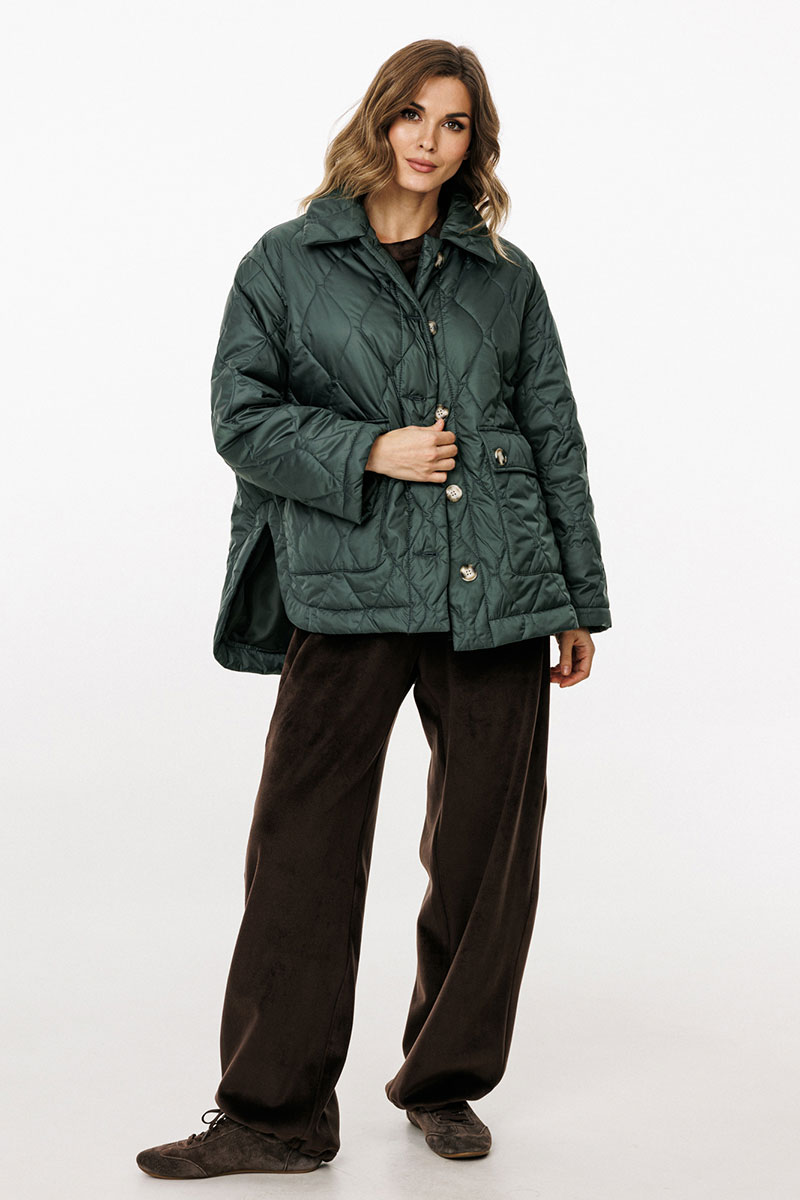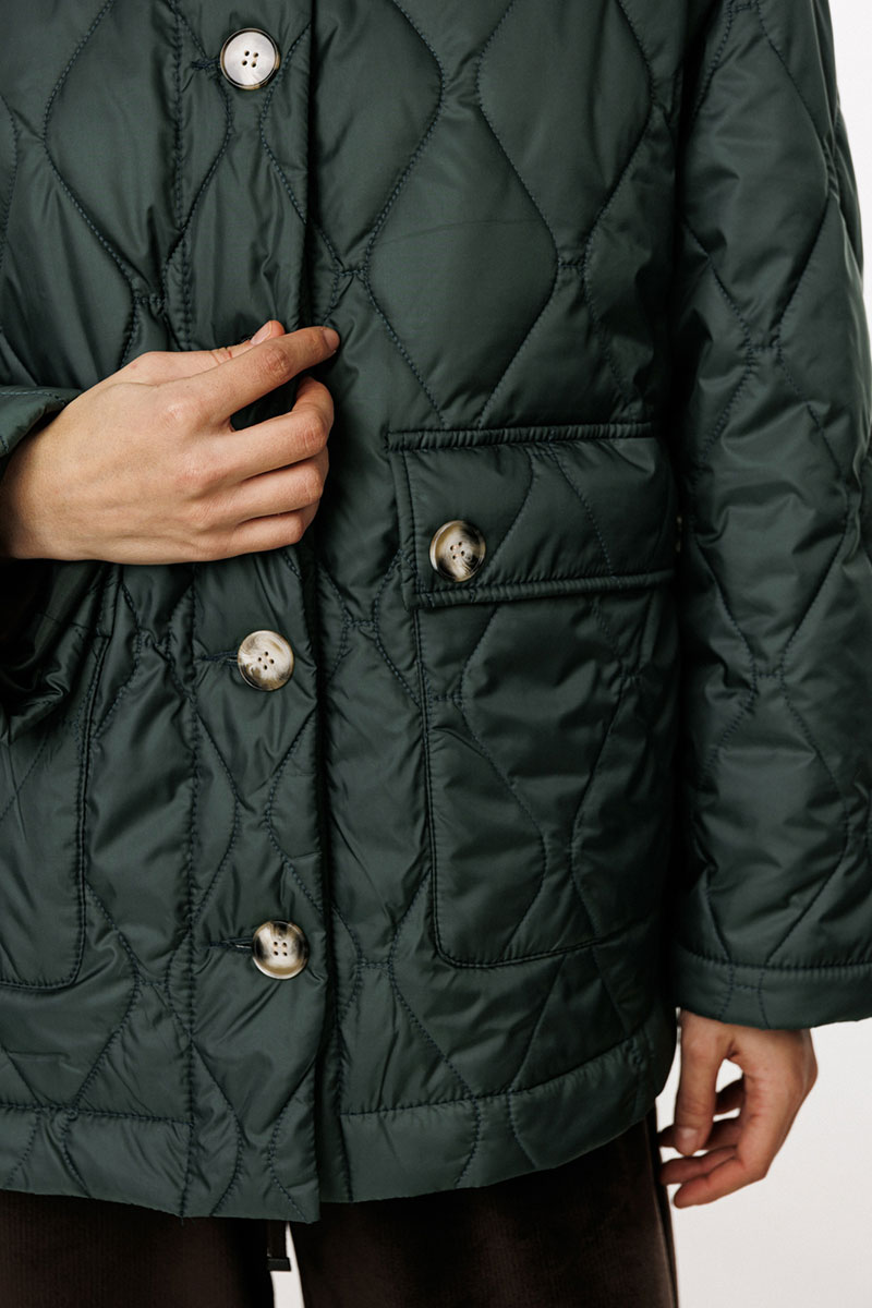 Куртка выполнена из плащевой ткани, простеганной с Isosoft. Куртка прямого силуэта, длиной до линии бедер. Застежка центральная бортовая на пришивные пуговицы. Спереди накладные