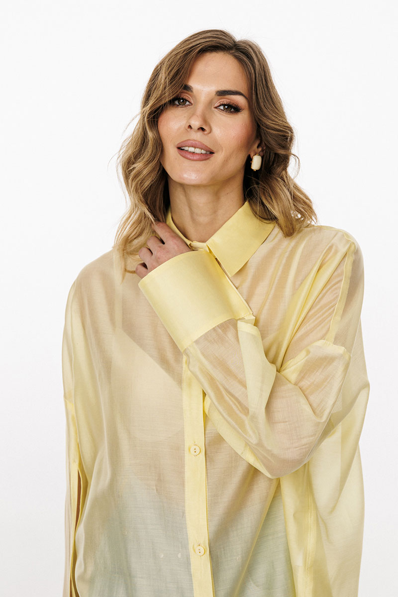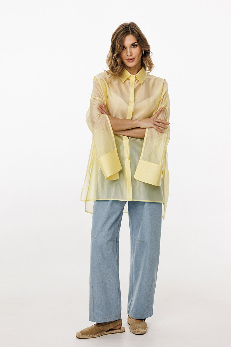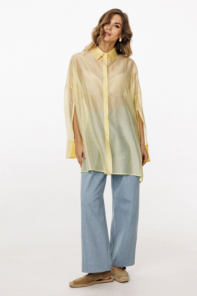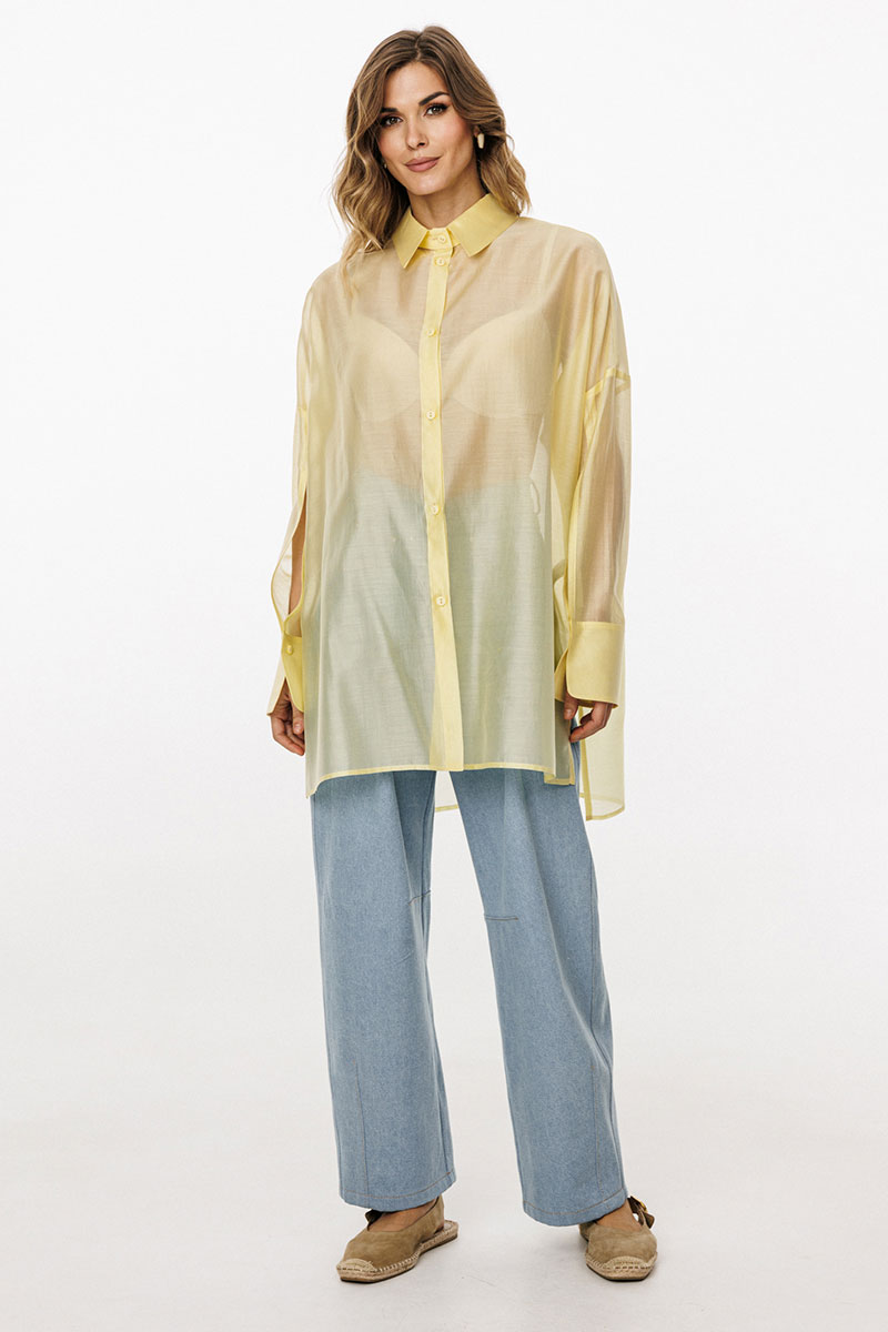 Блузка выполнена из плательно-блузочной ткани. Блузка прямого силуэта, покроя оверсайз, длиной ниже линии бедер. Спереди центральная застежка на пуговицы. Спинка цельная, длиннее переда. Воротник стояче-отложной. Плечевой шов спущен. Рукав рубашечного покроя, двухшовный, с прорезью по переду. Низ рукава на притачной манжете, застегивающейся на пуговицу. В боковых швах разрезы.