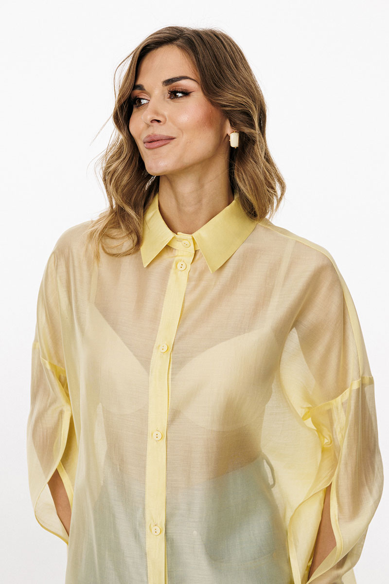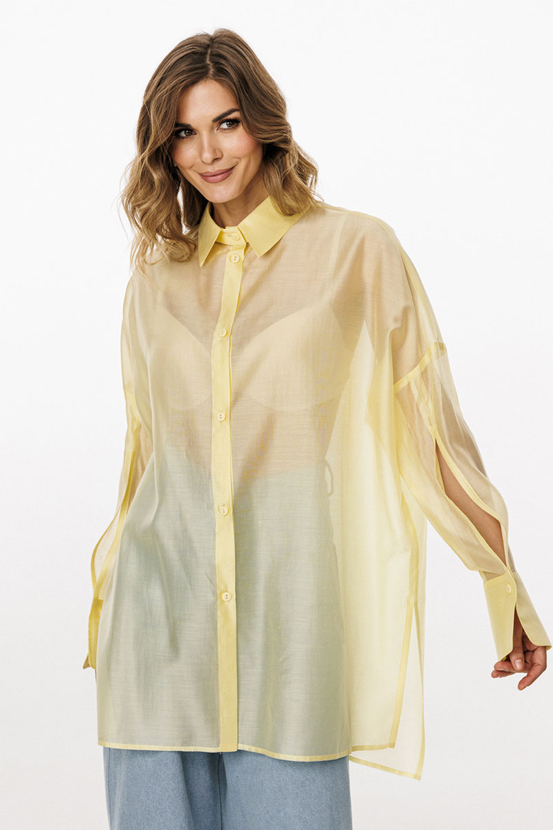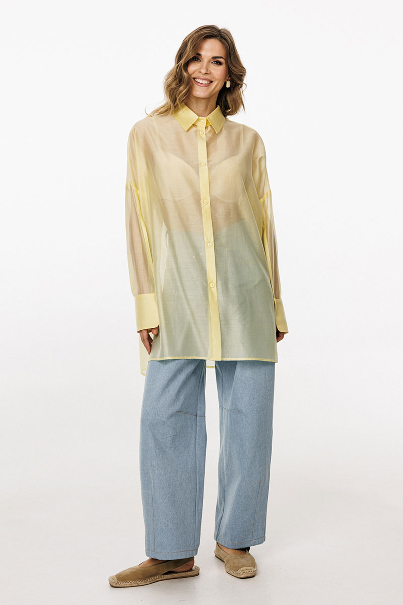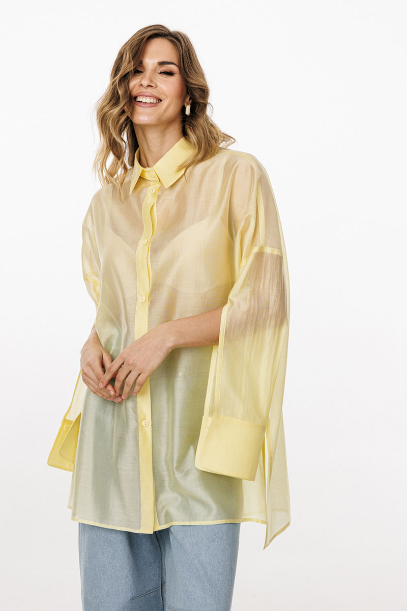 Блузка выполнена из плательно-блузочной ткани. Блузка прямого силуэта, покроя оверсайз, длиной ниже линии бедер. Спереди центральная застежка на пуговицы. Спинка цельная, длиннее переда. Воротник стояче-отложной. Плечевой шов спущен. Рукав рубашечного покроя, двухшовный, с прорезью по переду. Низ рукава на притачной манжете, застегивающейся на пуговицу. В боковых швах разрезы.