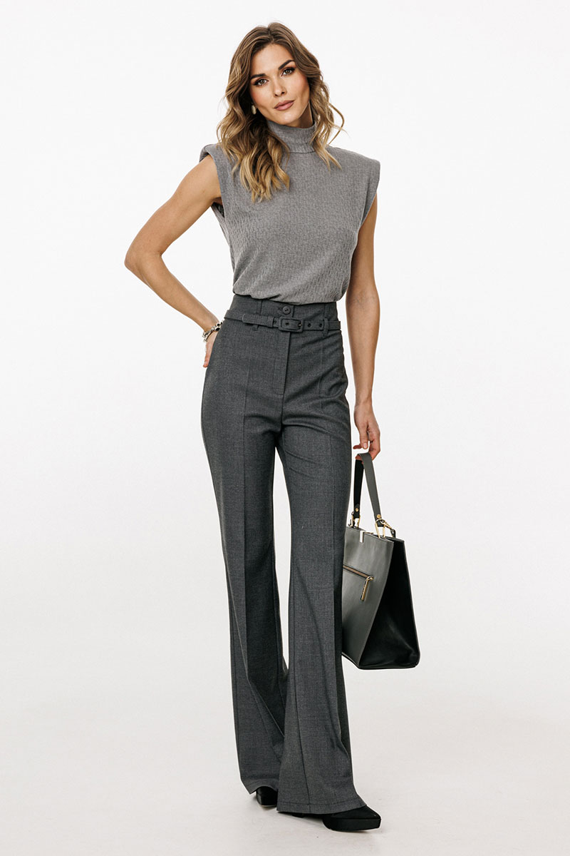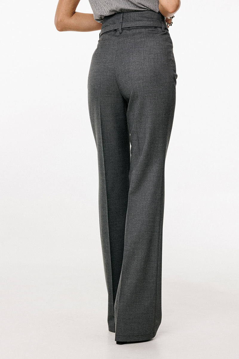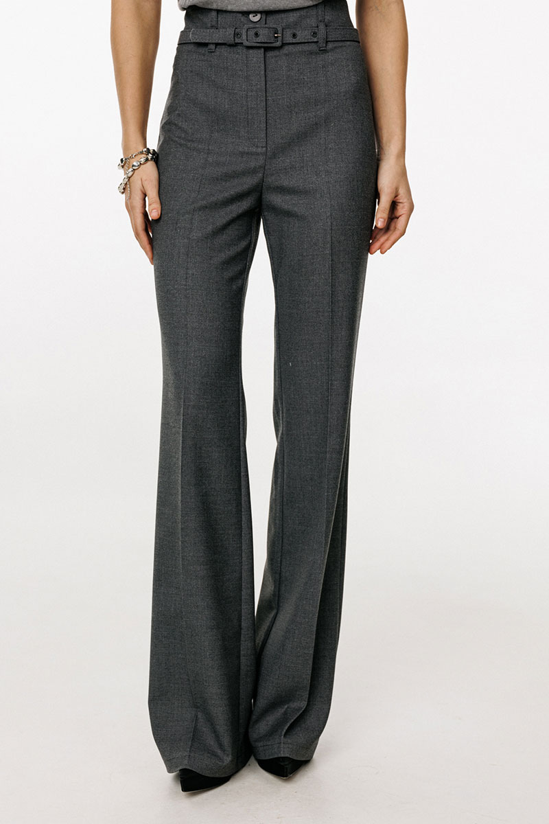 Брюки выполнены из костюмной ткани. Брюки покроя "клеш", на притачном поясе, длиной в пол. Спереди застежка на молнию с гульфиком, потайную пуговицу и два брючных крючка. Передние и