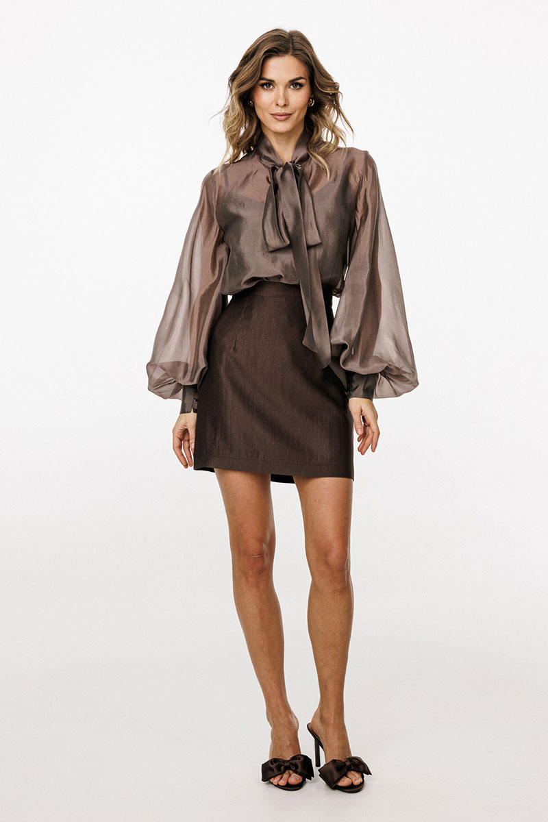 Юбка выполнена из костюмной ткани. Юбка прямого силуэта, длиной выше линии колена. Переднее полотнище цельное. Сзади в среднем шве застежка на потайную молнию.