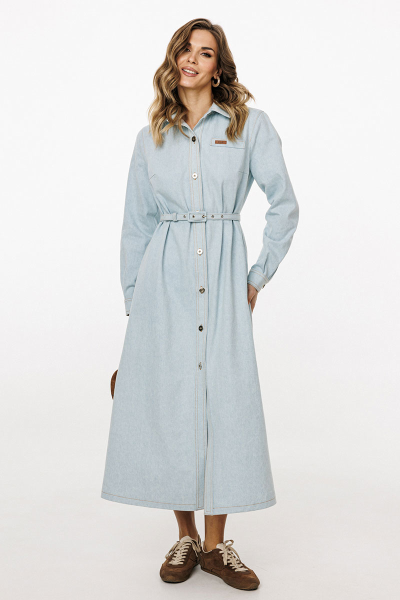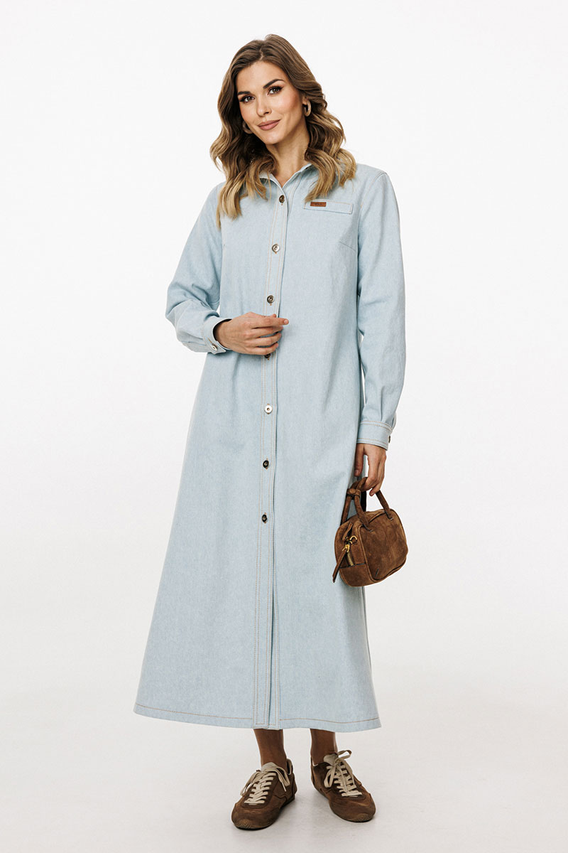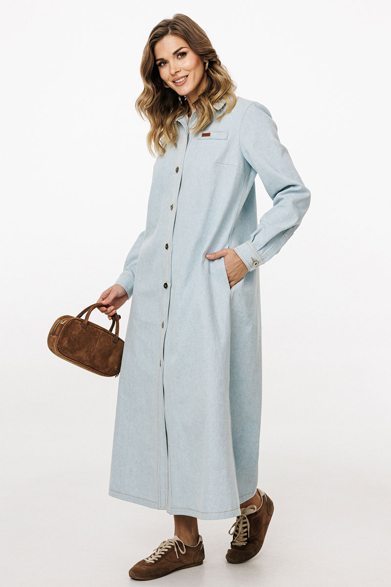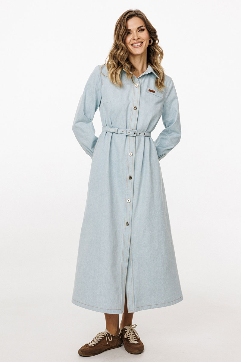 Платье выполнено из плотного джинса. Платье А-образного силуэта, длиной миди. Застежка спереди на металлические пробивные пуговицы. На спинке кокетка и встречная складка от нее.