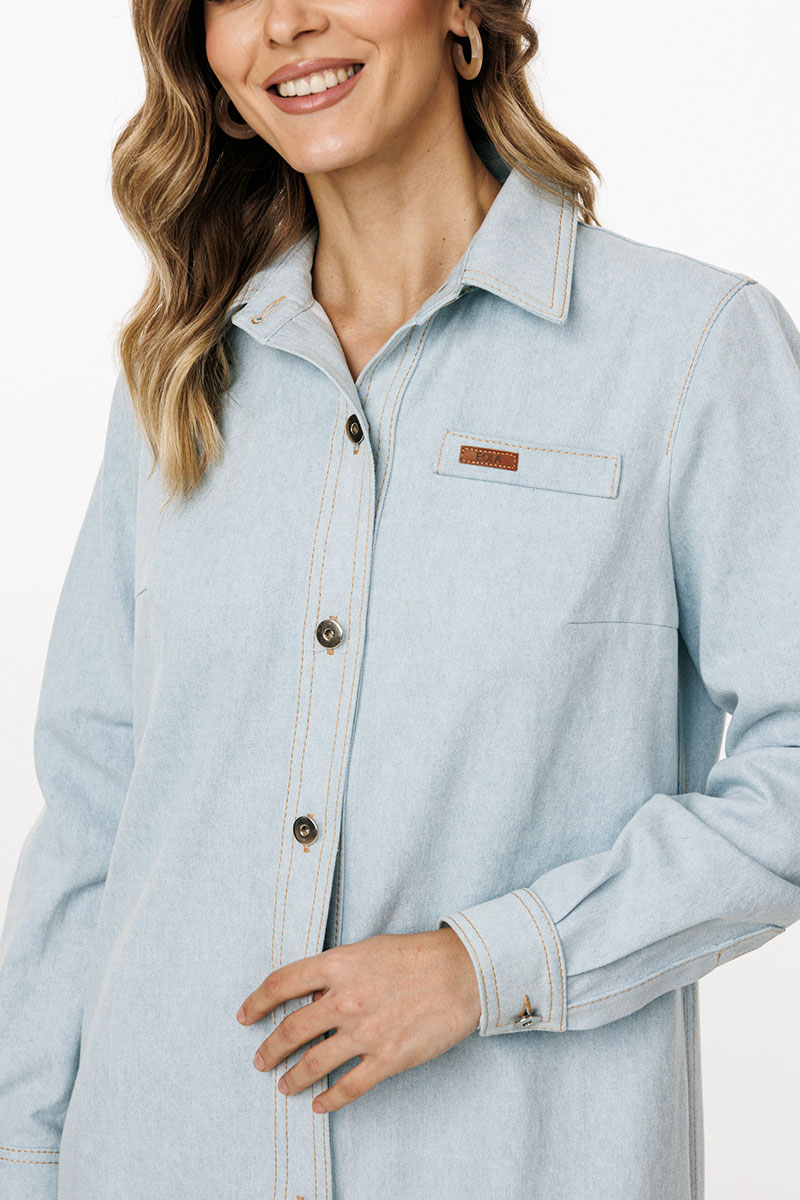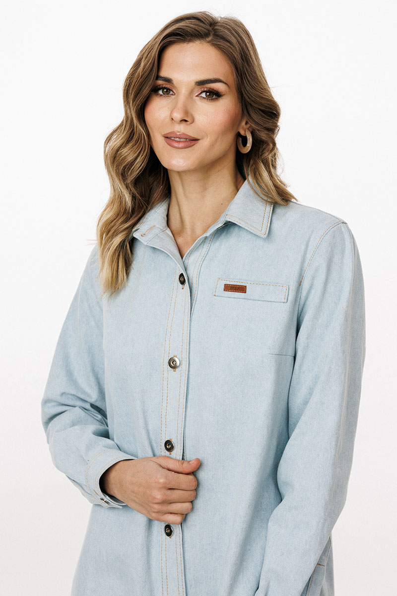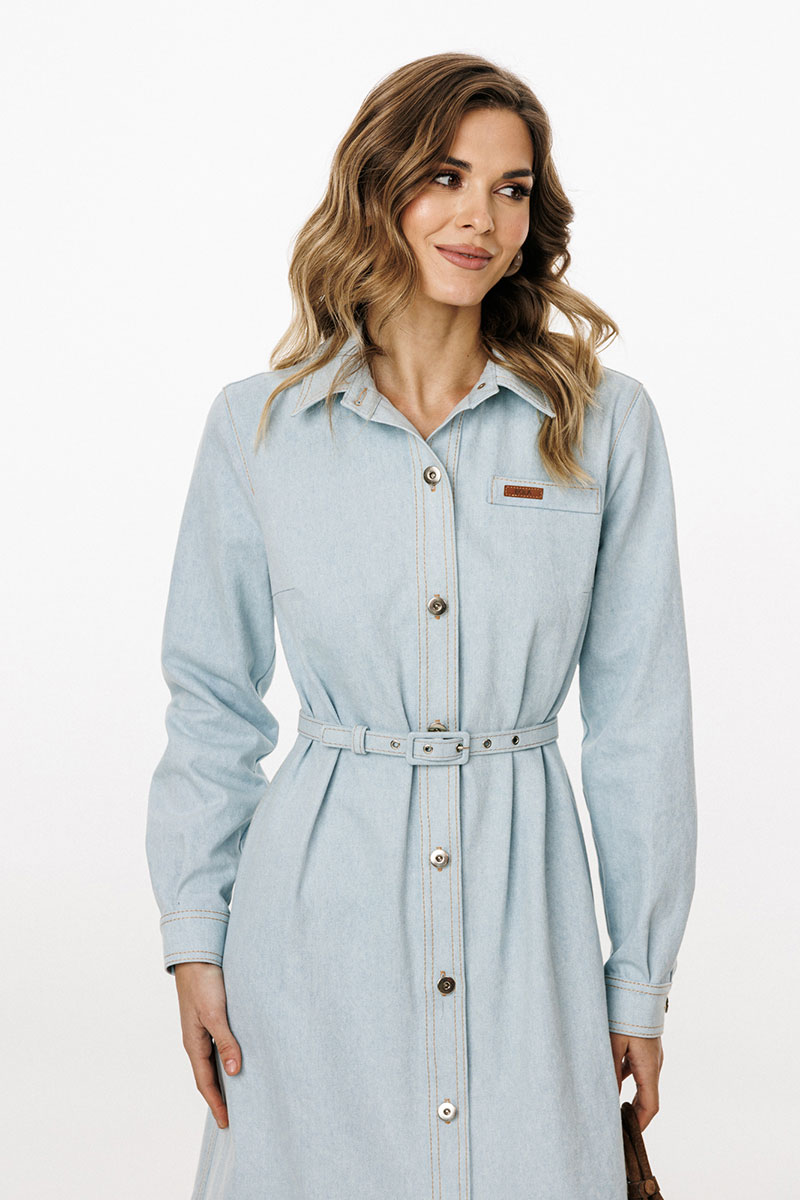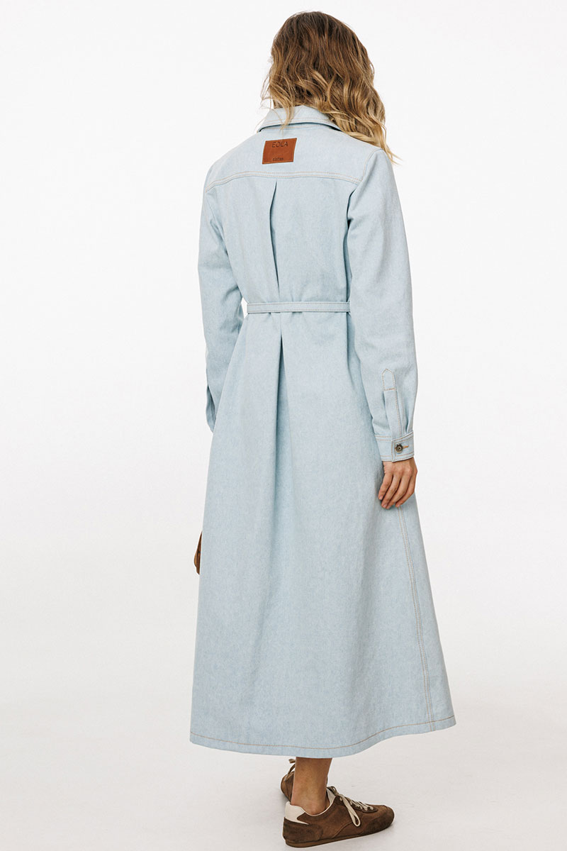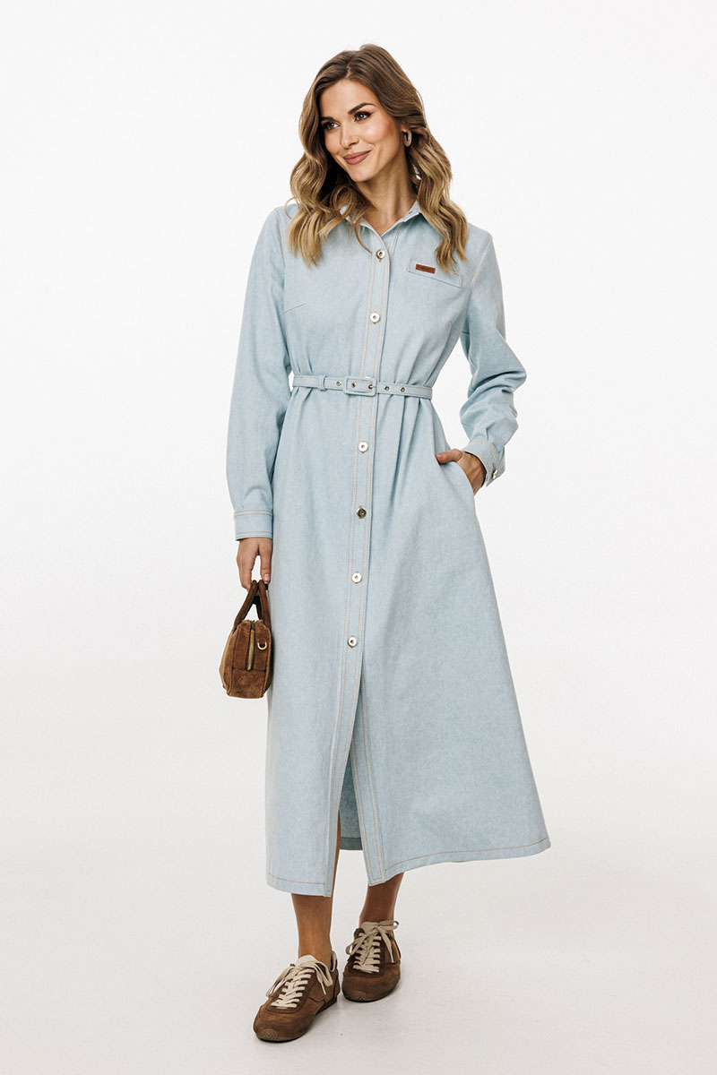 Платье выполнено из плотного джинса. Платье А-образного силуэта, длиной миди. Застежка спереди на металлические пробивные пуговицы. На спинке кокетка и встречная складка от нее.