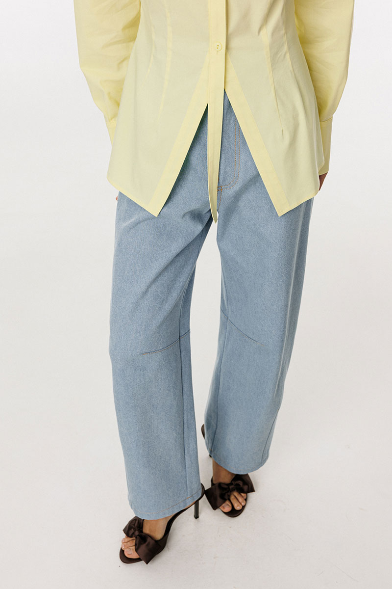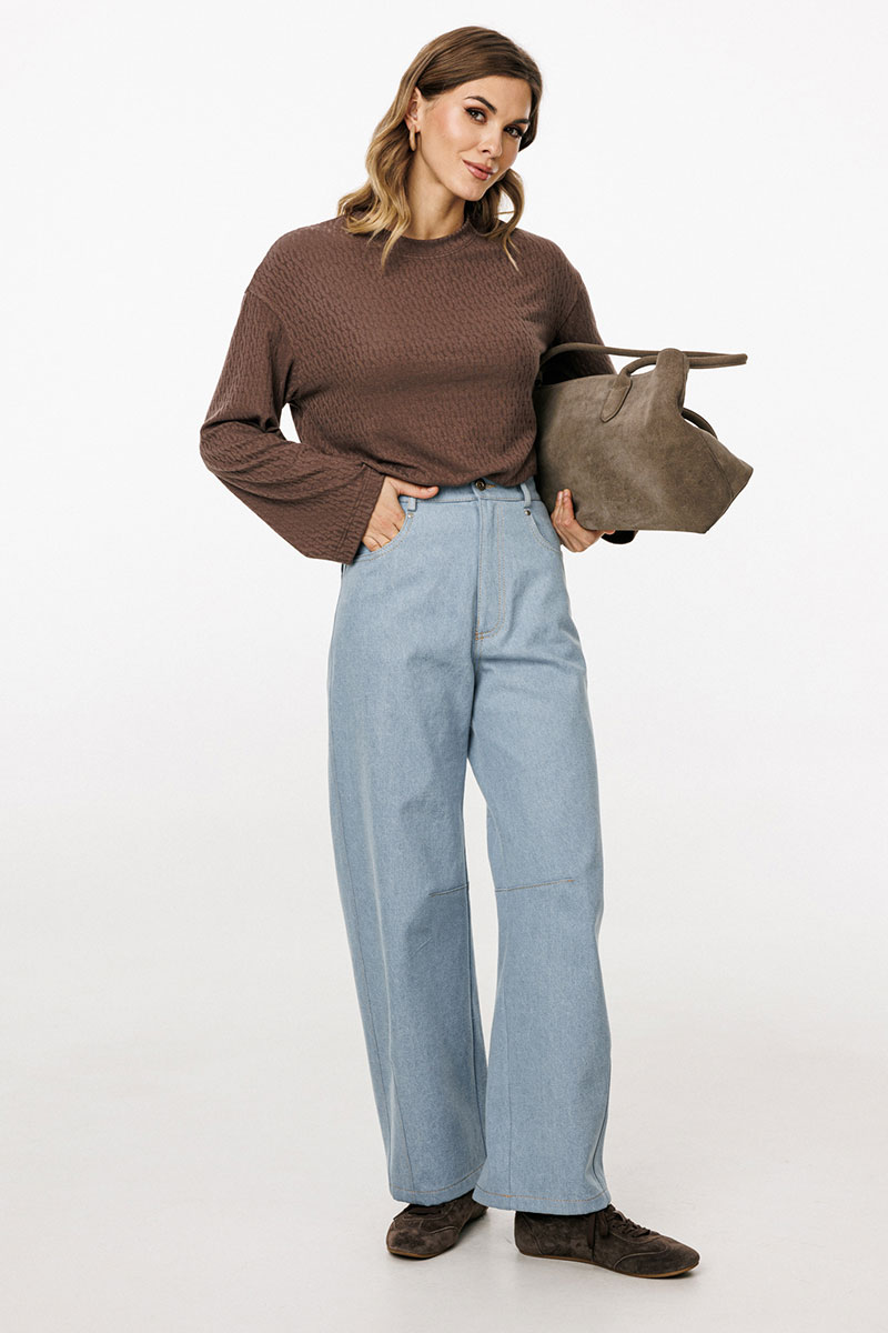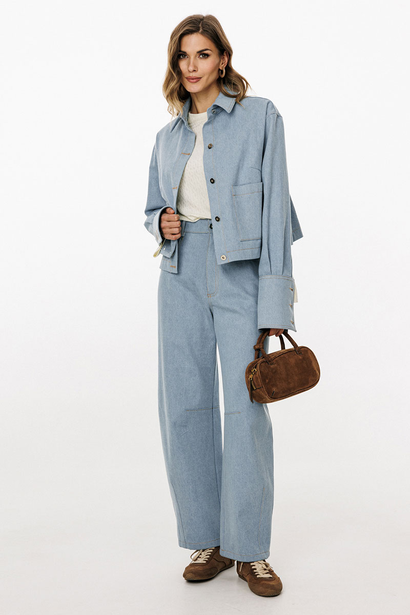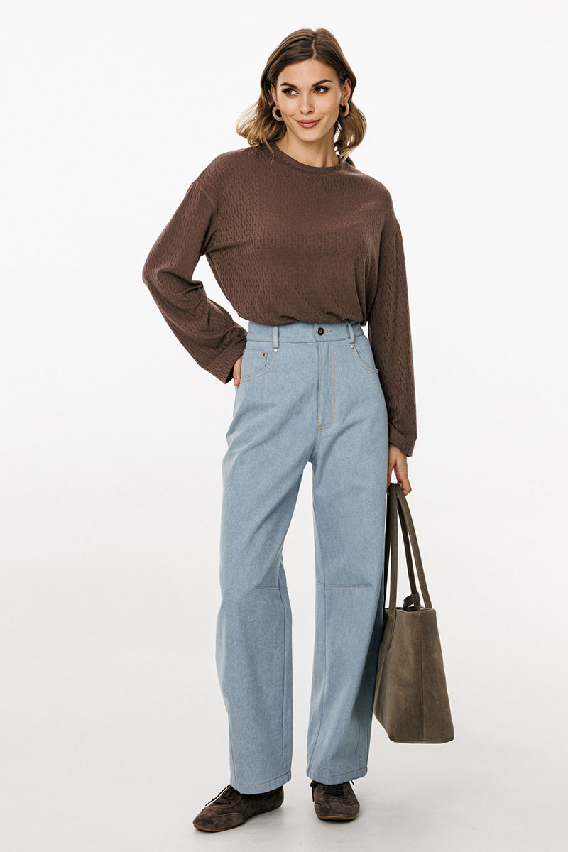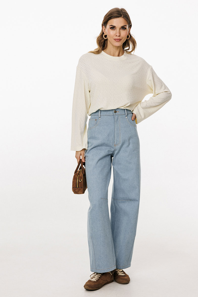 Джинсы-багги выполнены из плотного джинса. Брюки на притачном поясе, длиной до линии щиколотки, расширенные от бедер и слегка зауженные к низу. Спереди боковые карманы с фигурным входом. Застежка на пуговицу и молнию с гульфиком. На задних частях кокетки и накладные карманы. На передней и задней части коленные вытачки.