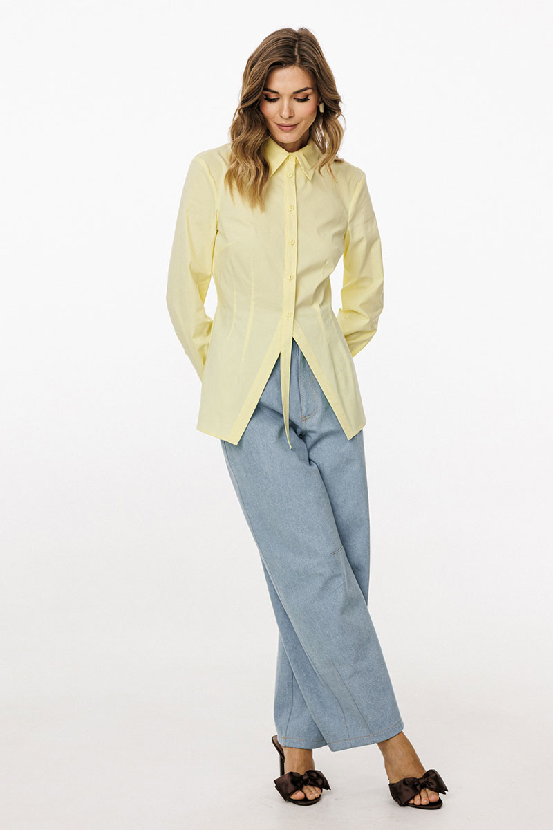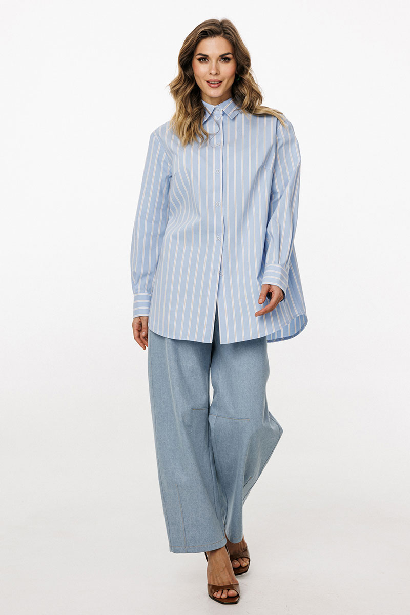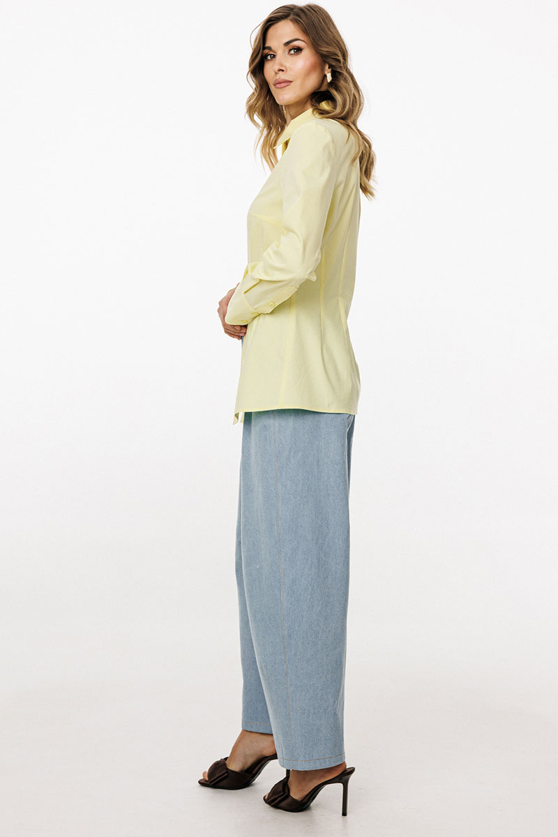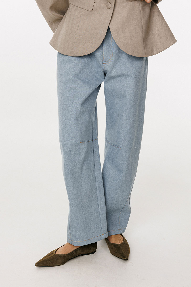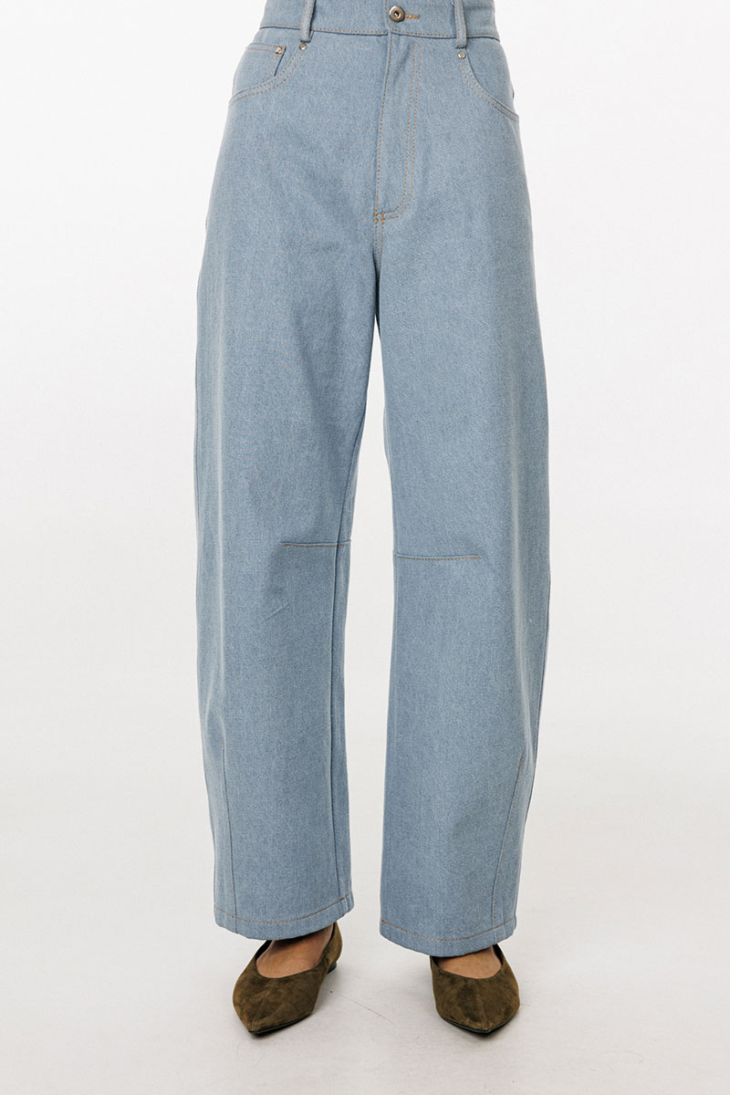 Джинсы-багги выполнены из плотного джинса. Брюки на притачном поясе, длиной до линии щиколотки, расширенные от бедер и слегка зауженные к низу. Спереди боковые карманы с фигурным входом. Застежка на пуговицу и молнию с гульфиком. На задних частях кокетки и накладные карманы. На передней и задней части коленные вытачки.