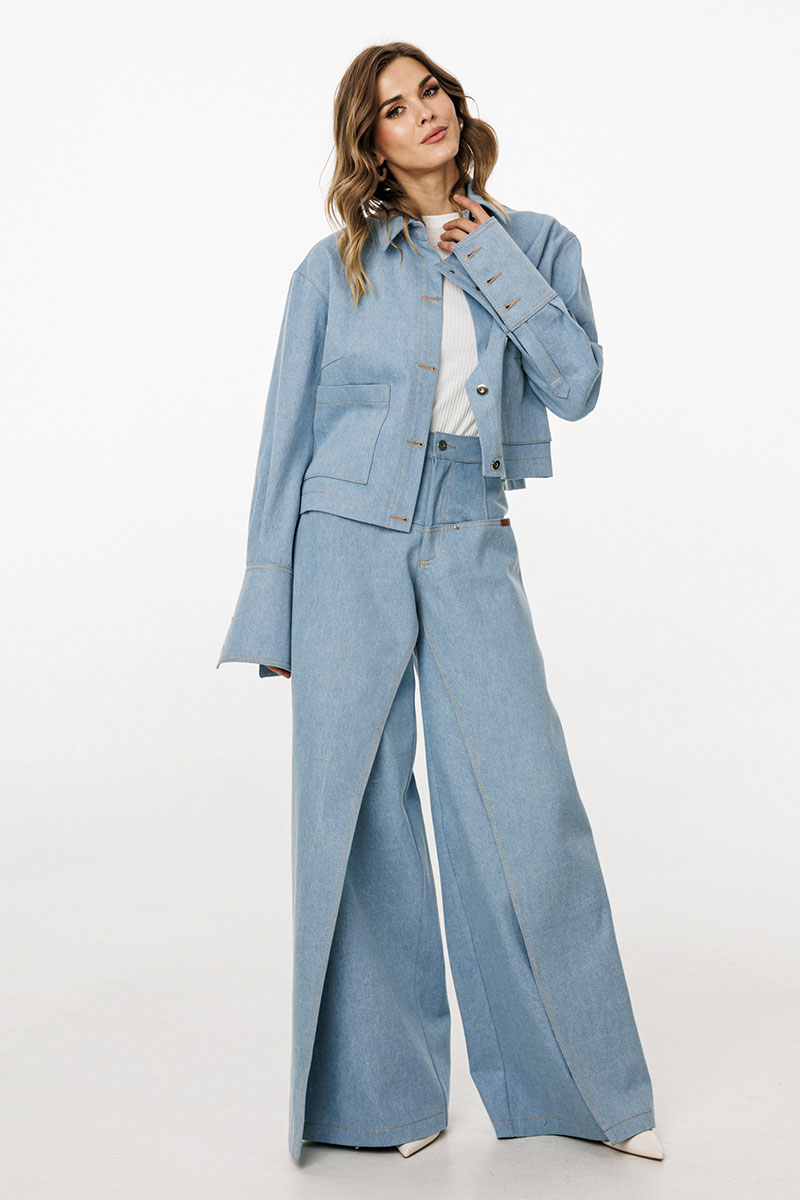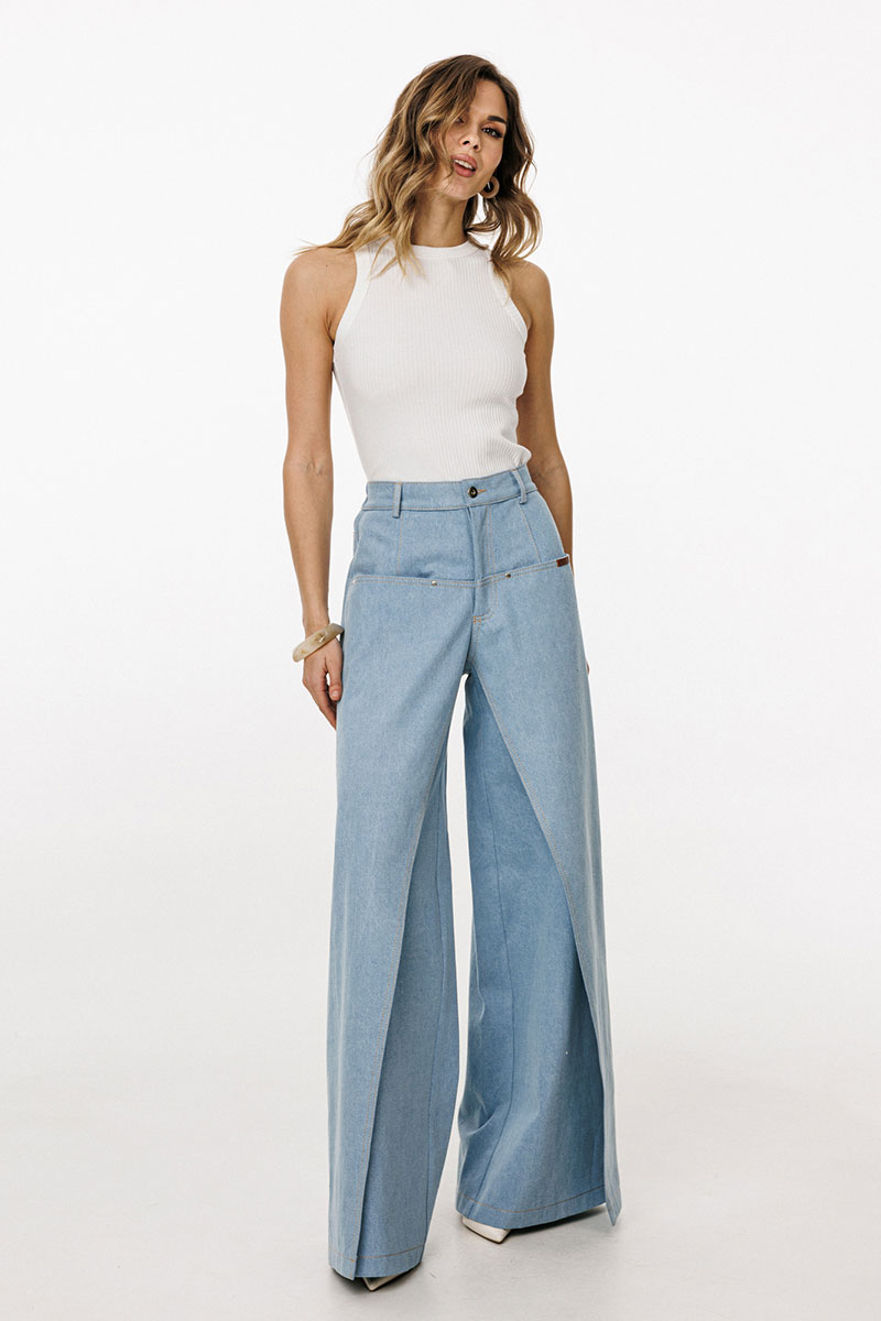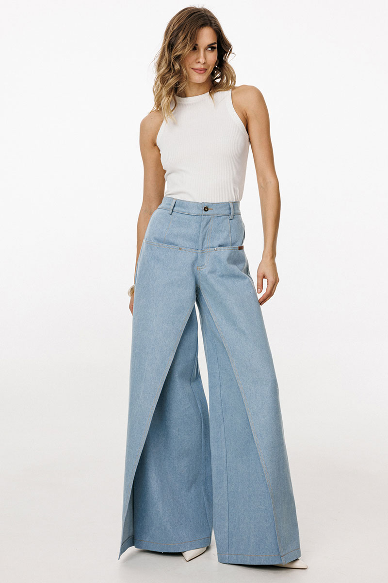 Джинсы-клеш выполнены из плотного джинса. Брюки на притачном поясе, длиной до пола, расширенные к низу. Спереди верхние отлетные части, боковые карманы с фигурным входом. Застежка на пуговицу и молнию с гульфиком. На задних частях кокетки и накладные карманы. По переду брюки декорированы брендированной нашивкой из натуральной кожи.