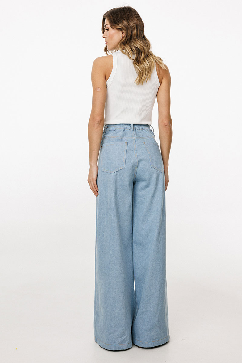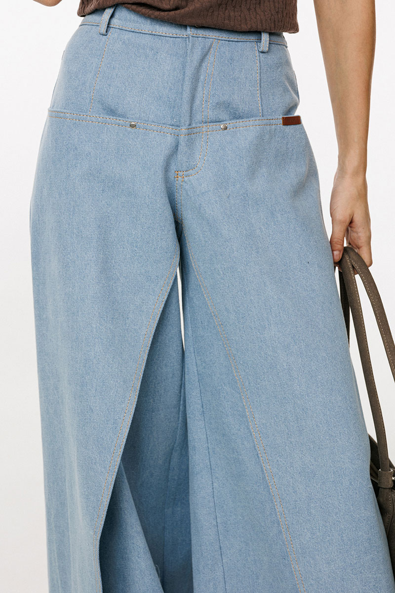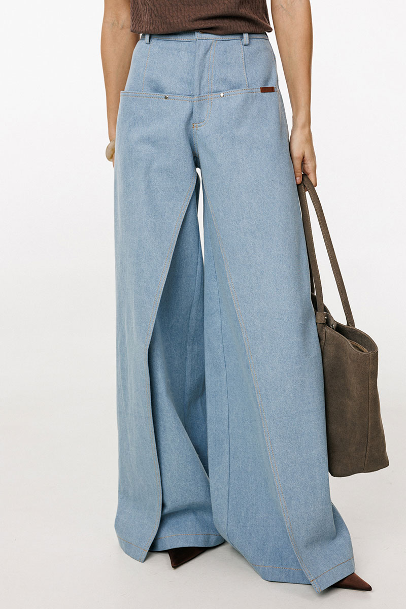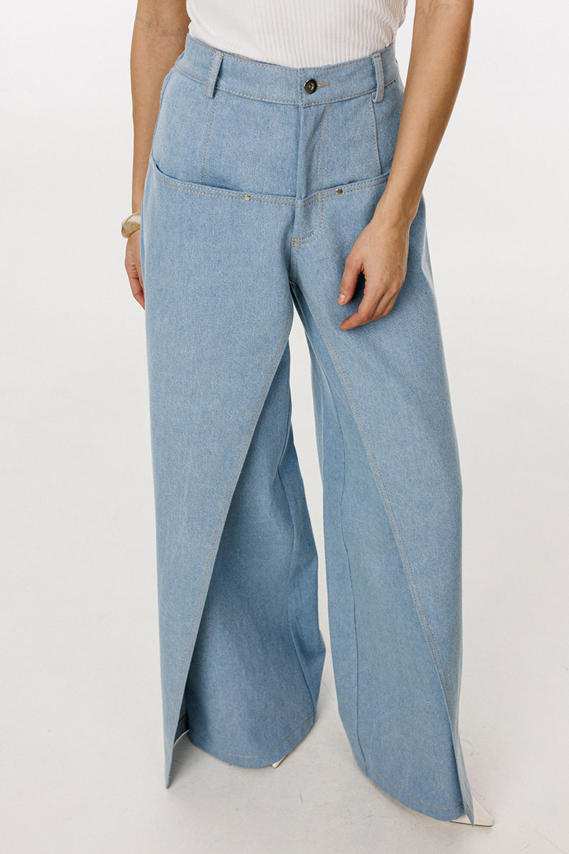 Джинсы-клеш выполнены из плотного джинса. Брюки на притачном поясе, длиной до пола, расширенные к низу. Спереди верхние отлетные части, боковые карманы с фигурным входом. Застежка на пуговицу и молнию с гульфиком. На задних частях кокетки и накладные карманы. По переду брюки декорированы брендированной нашивкой из натуральной кожи.