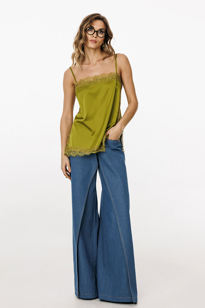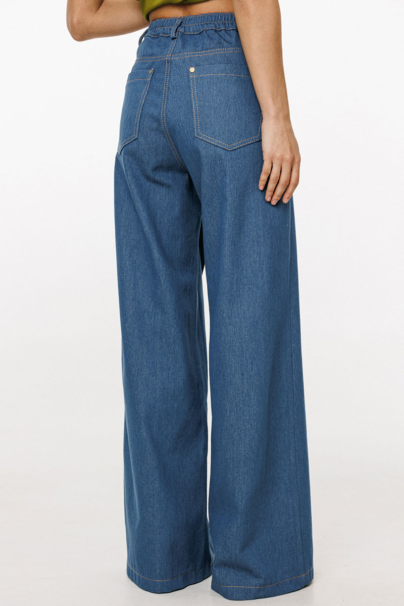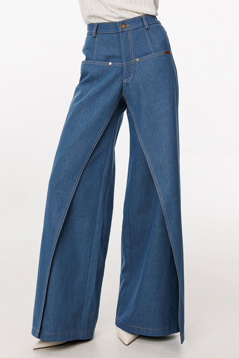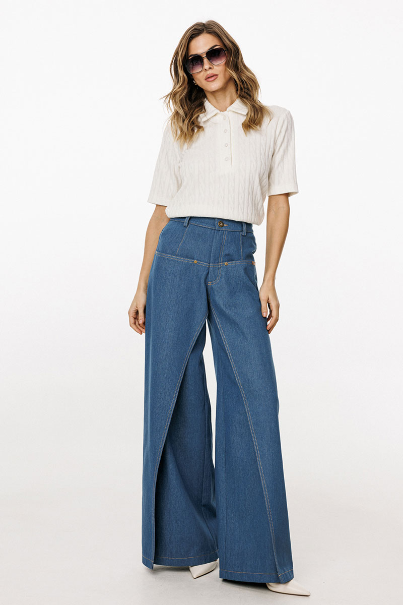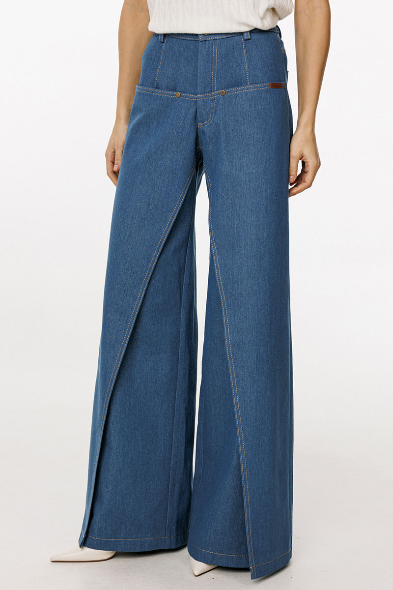 Джинсы-клеш выполнены из плотного джинса. Брюки на притачном поясе, длиной до пола, расширенные к низу. Спереди верхние отлетные части, боковые карманы с фигурным входом. Застежка на пуговицу и молнию с гульфиком. На задних частях кокетки и накладные карманы. По переду брюки декорированы брендированной нашивкой из натуральной кожи.