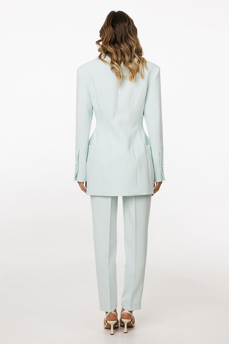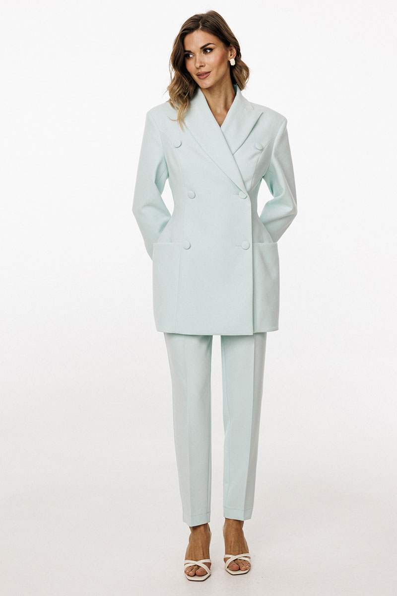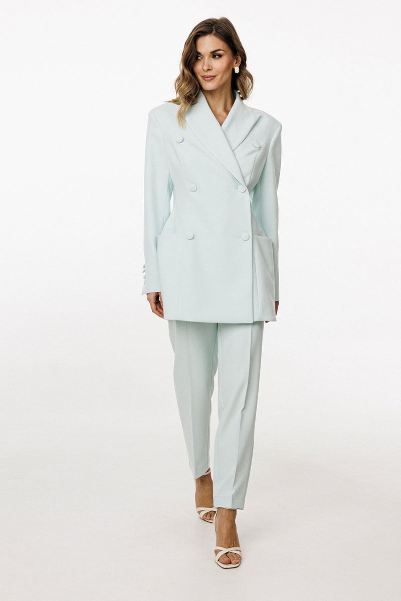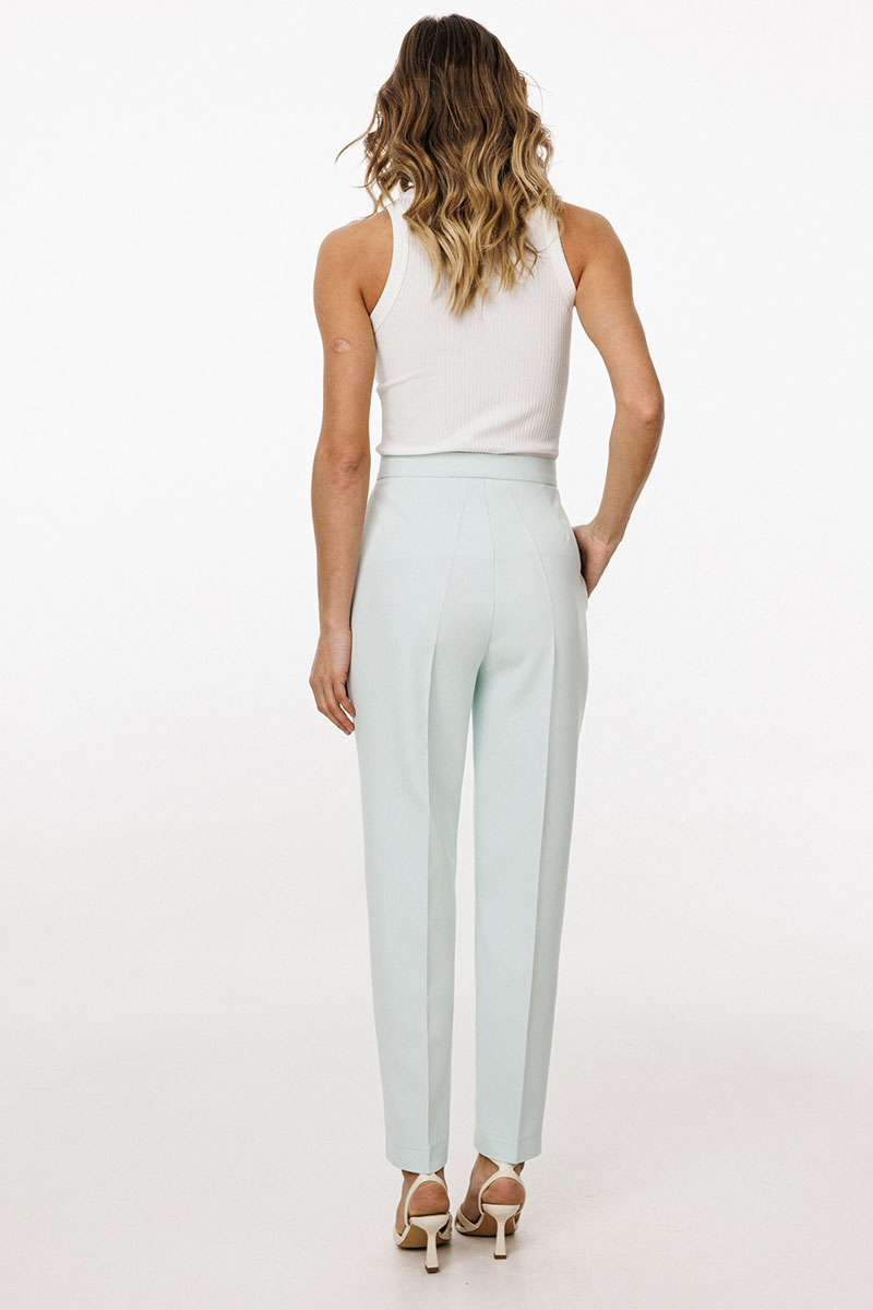 Брюки выполнены из костюмной ткани. Брюки зауженные к низу, длиной 7/8, на притачном поясе. Спереди боковые карманы с наклонным входом и застежка на молнию.