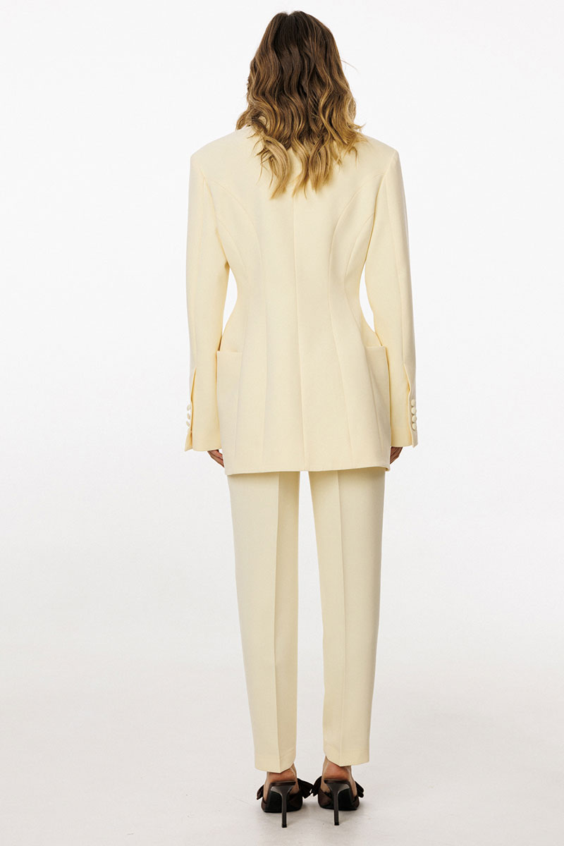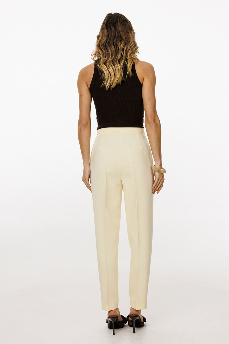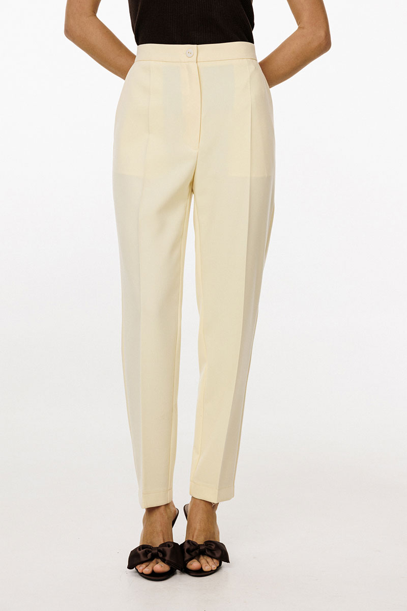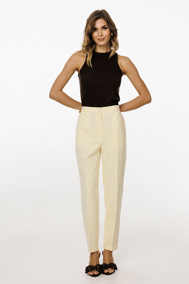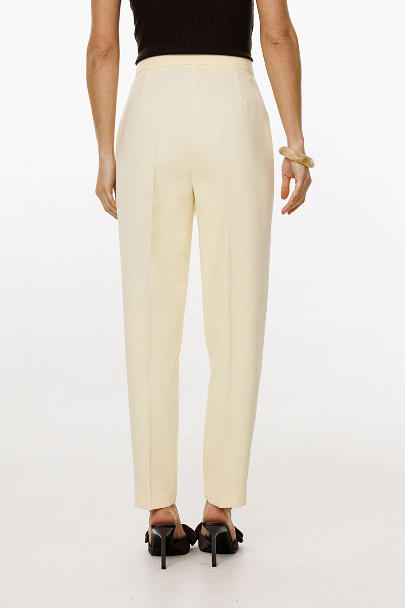 Брюки выполнены из костюмной ткани. Брюки зауженные к низу, длиной 7/8, на притачном поясе. Спереди боковые карманы с наклонным входом и застежка на молнию.
